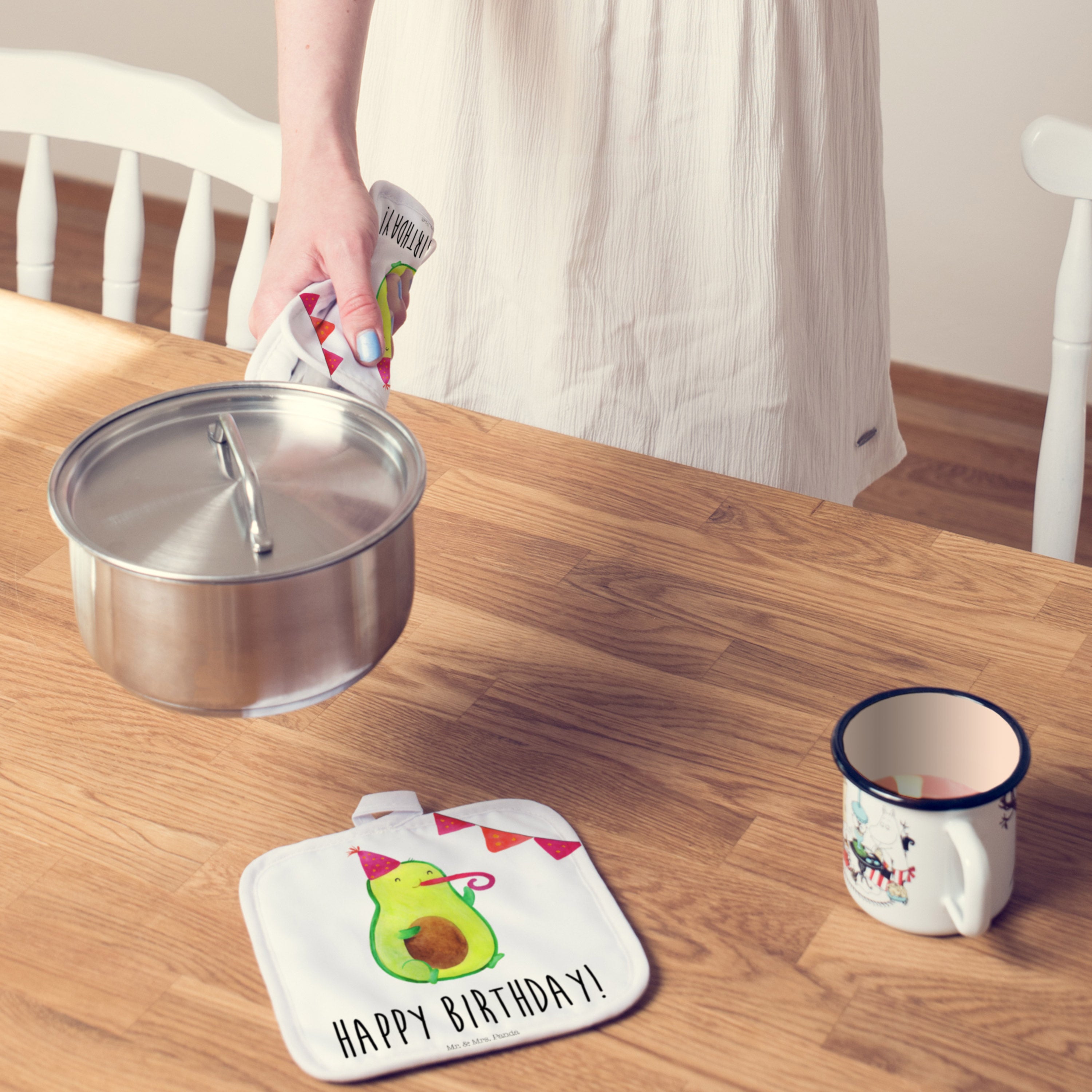 Diese wunderschönen Topflappen von Mr. & Mrs. Panda kommen im 2er Set. Sie wurden liebevoll von uns per Hand bedruckt und das Material ist äußerst strapazierfähig und langlebig. Die Mischung aus Baumwolle und Kunstfaser ist optimal für deine Topflappen, weil die Baumwolle gut isoliert und die Kunstfaser besonder dünn ist, sodass sie sehr hitzebeständig ist. Die Topflappen haben jeweils eine Schlaufe mit der du sie gut aufhängen kannst. So hast du die perfekte Dekoration in deiner Küche!