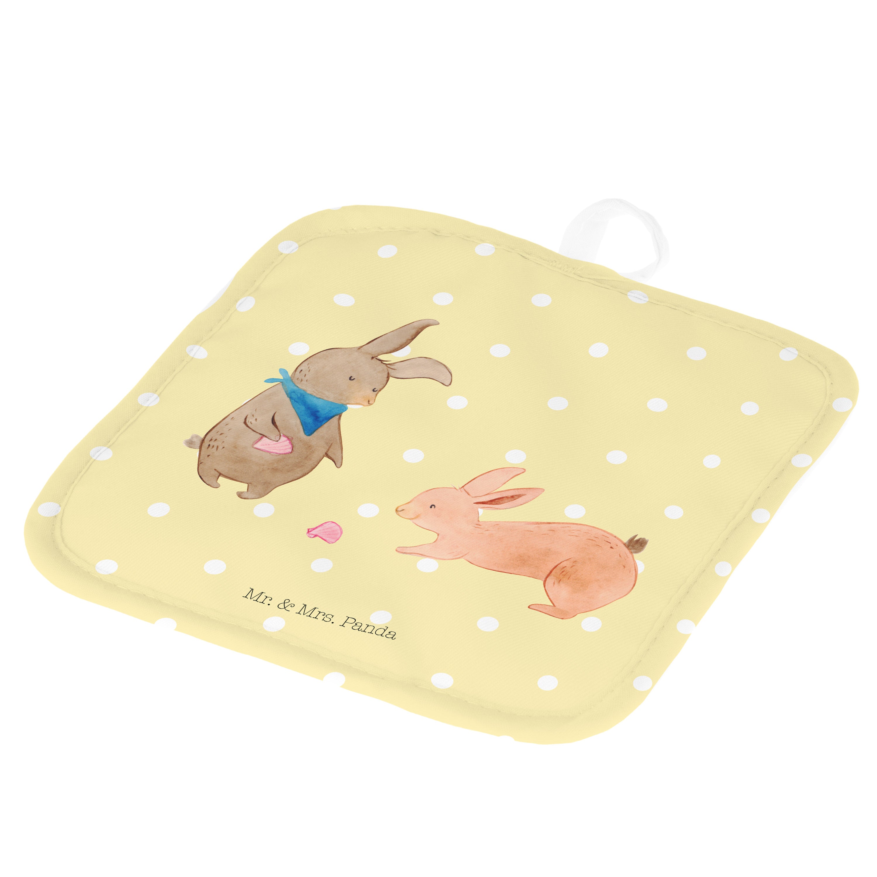 Diese wunderschönen Topflappen von Mr. & Mrs. Panda kommen im 2er Set. Sie wurden liebevoll von uns per Hand bedruckt und das Material ist äußerst strapazierfähig und langlebig. Die Mischung aus Baumwolle und Kunstfaser ist optimal für deine Topflappen, weil die Baumwolle gut isoliert und die Kunstfaser besonder dünn ist, sodass sie sehr hitzebeständig ist. Die Topflappen haben jeweils eine Schlaufe mit der du sie gut aufhängen kannst. So hast du die perfekte Dekoration in deiner Küche!