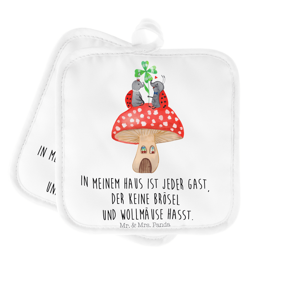 2er Set Topflappen Marienkäfer Paar Fliegenpilz - mit Spruch - Weiß