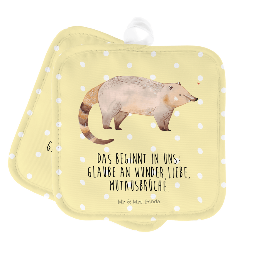 2er Set Topflappen Nasenbaer - mit Spruch - Gelb Pastell
