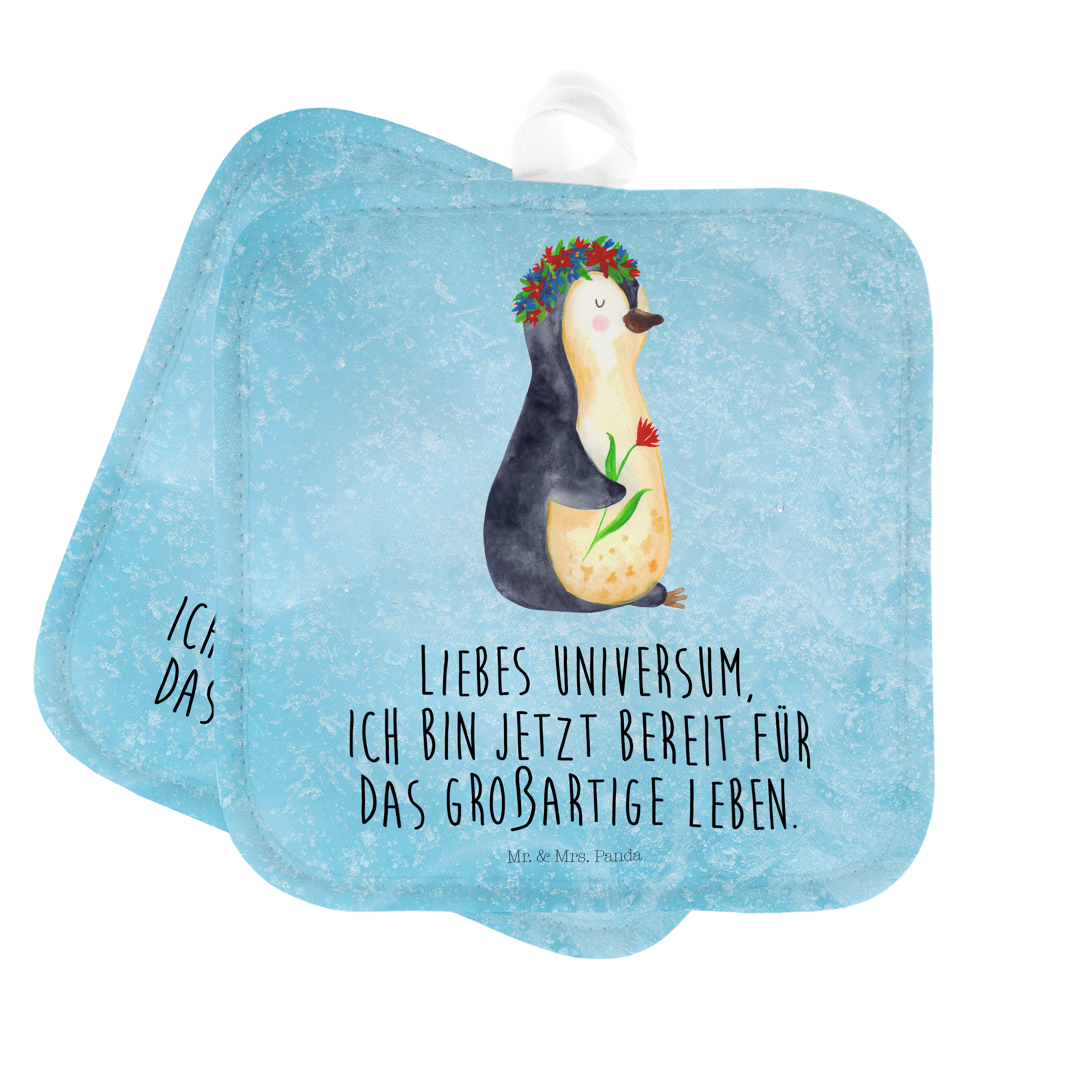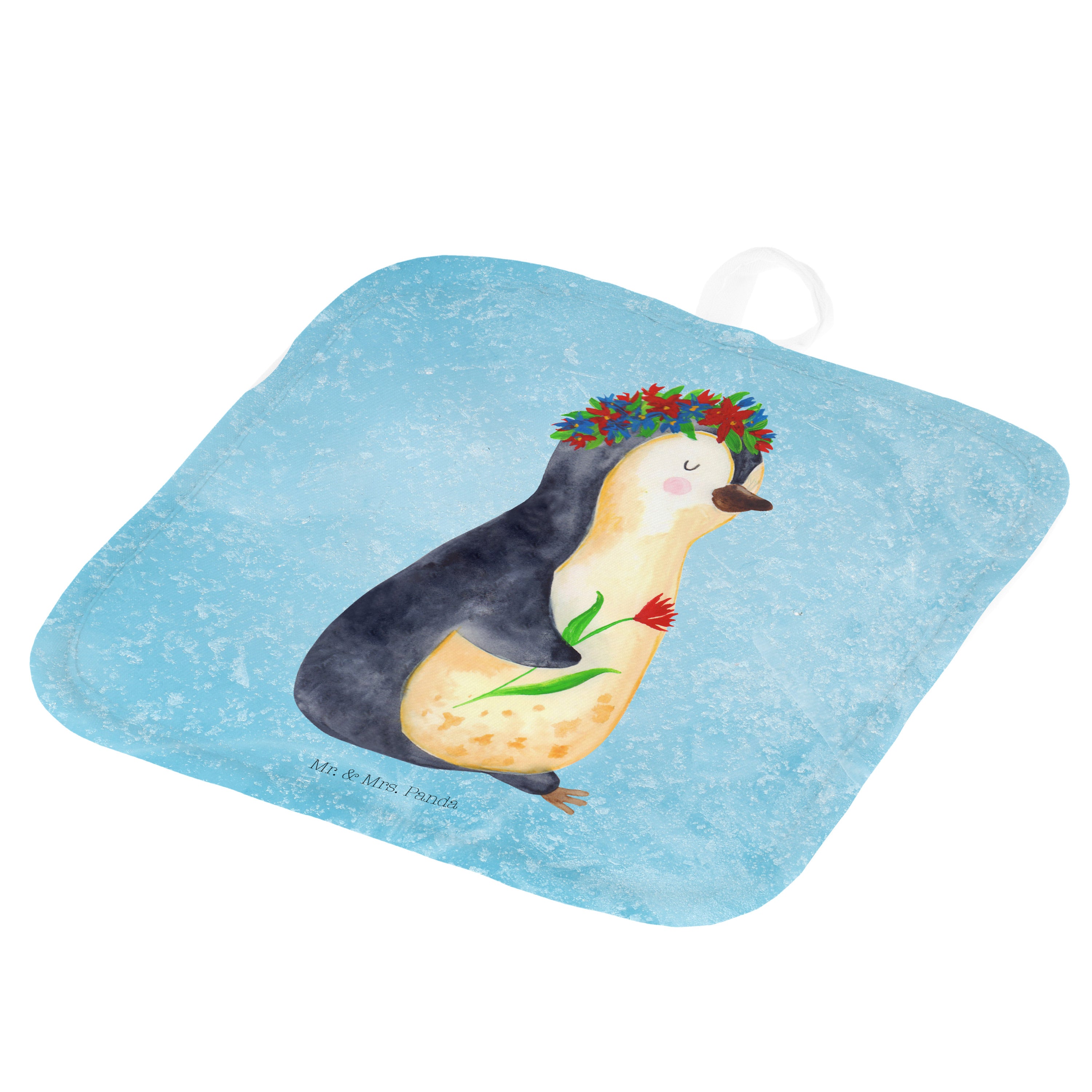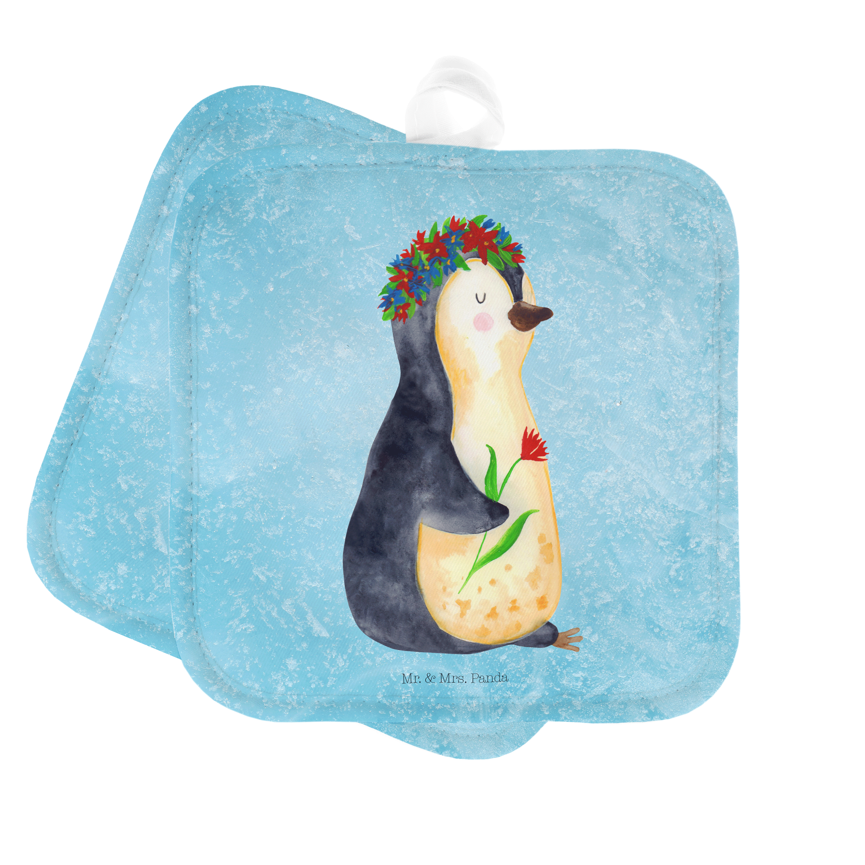 2er Set Topflappen Pinguin Blumenkranz - mit Spruch - Eisblau