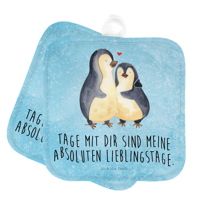 2er Set Topflappen Pinguin umarmend - mit Spruch - Eisblau