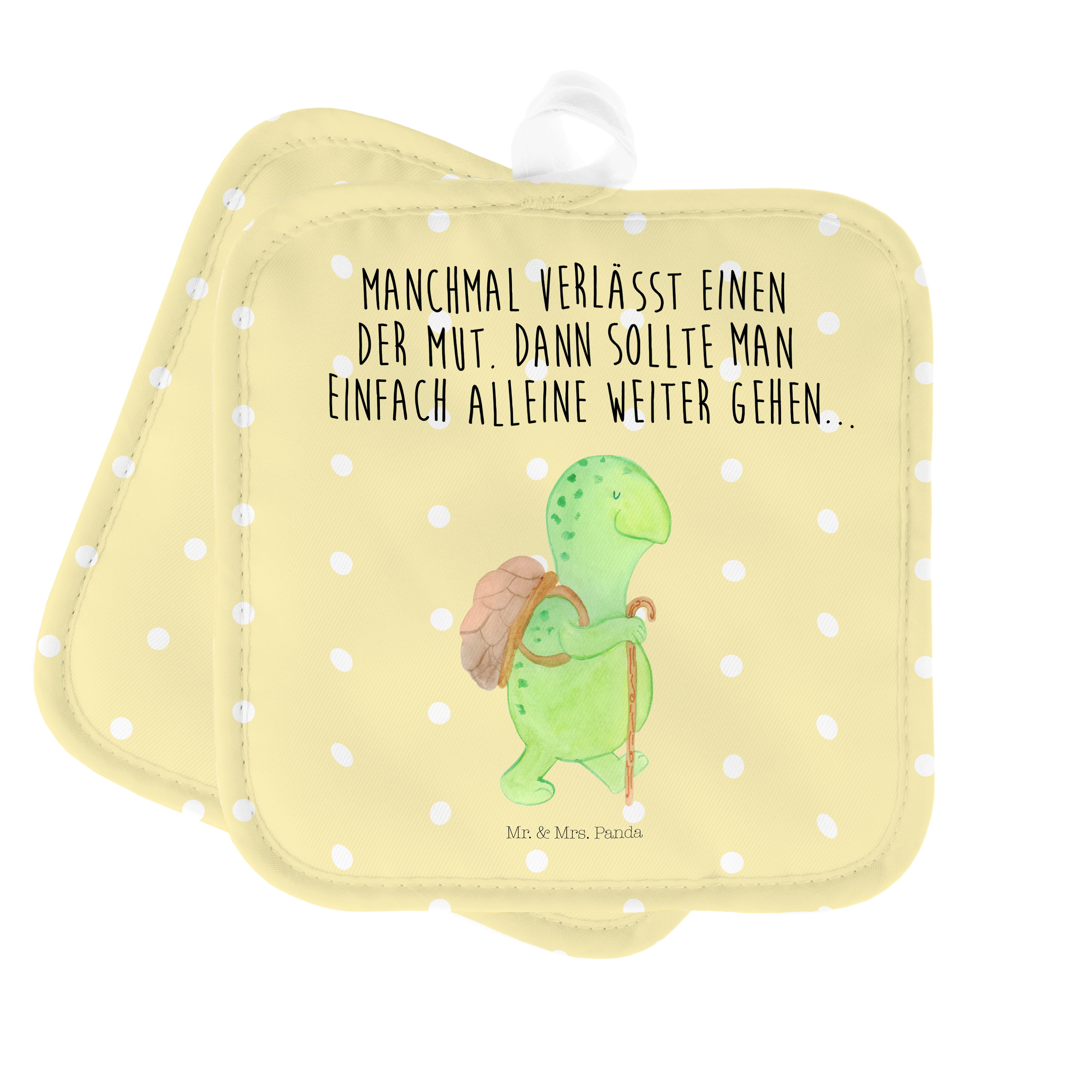 2er Set Topflappen Schildkröte Wanderer - mit Spruch - Gelb Pastell