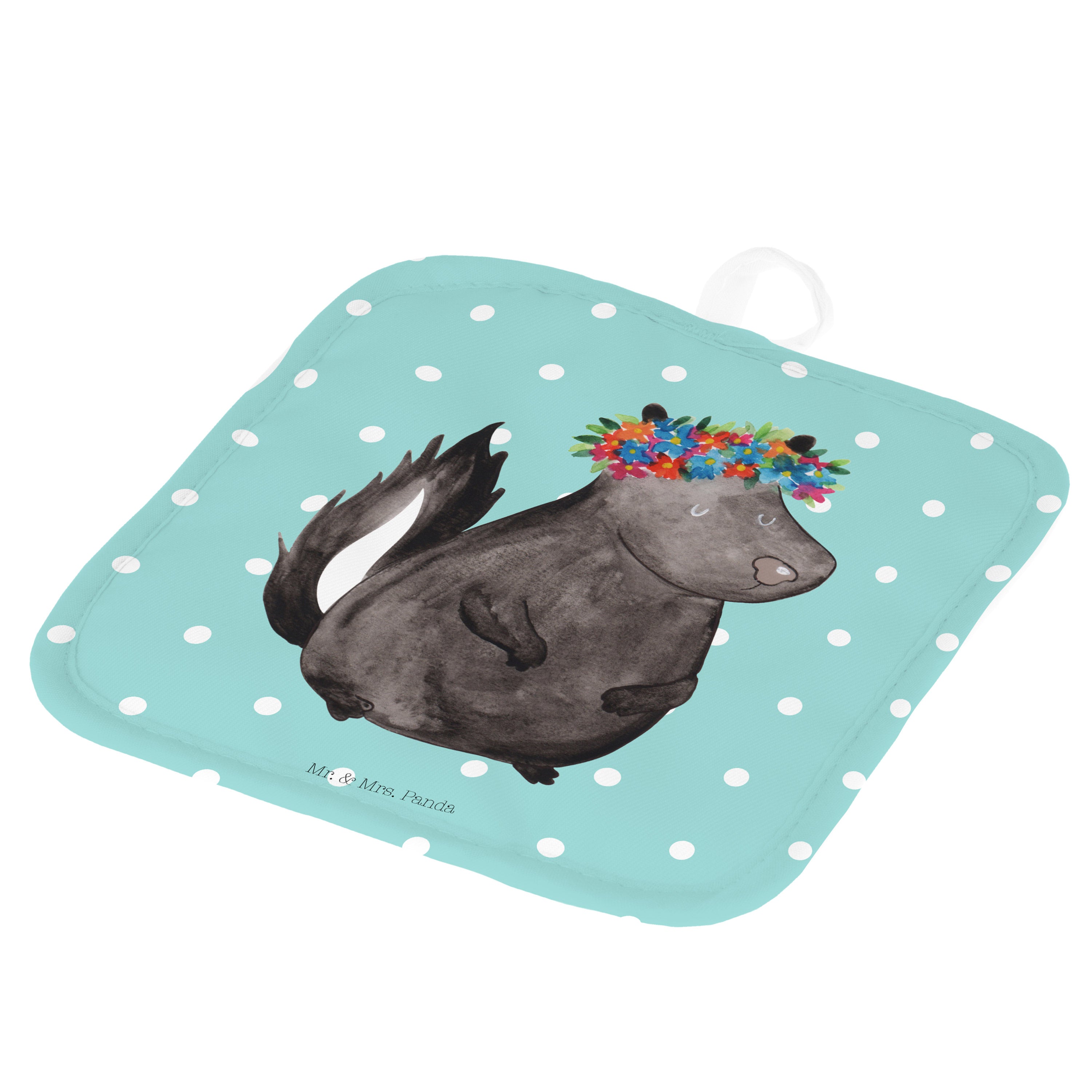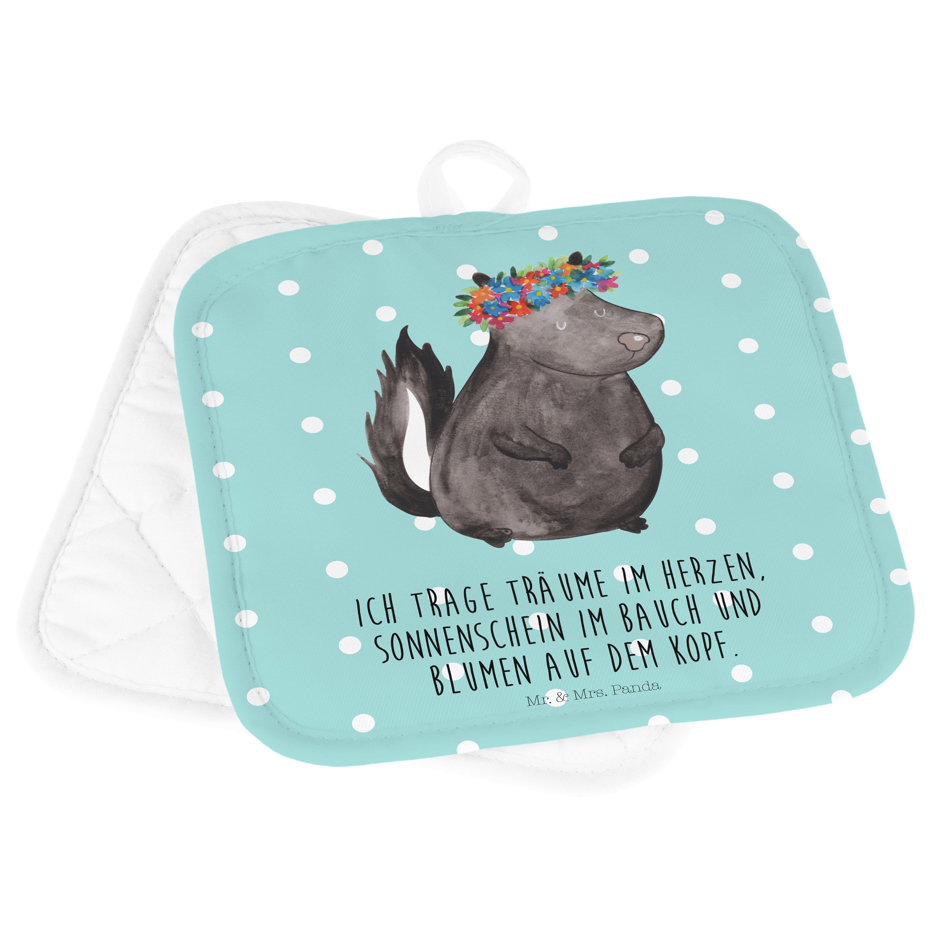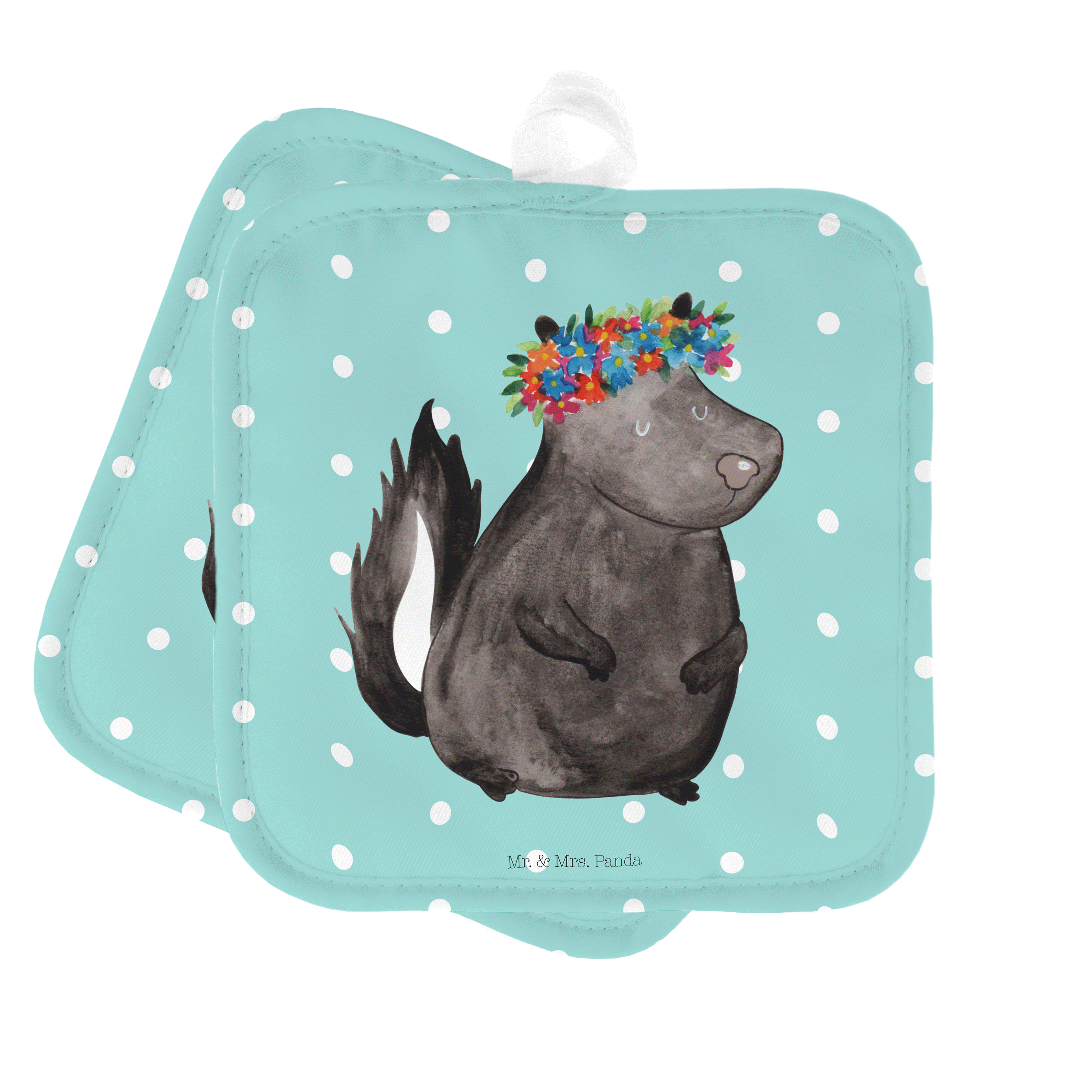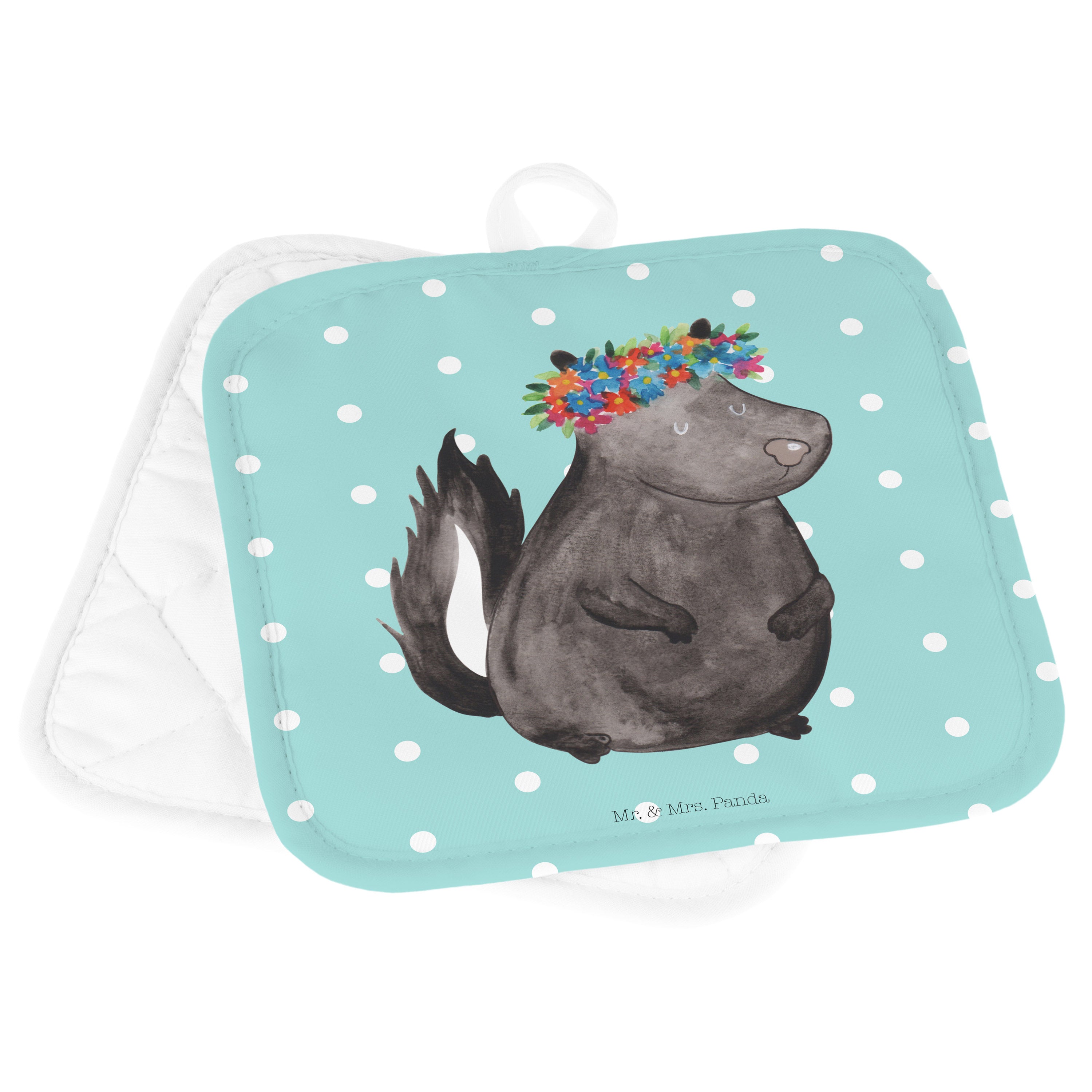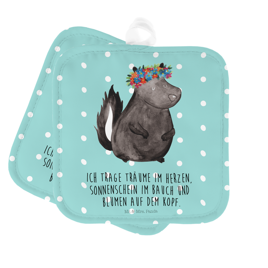 2er Set Topflappen Stinktier Blumenmaedchen - mit Spruch - Türkis Pastell