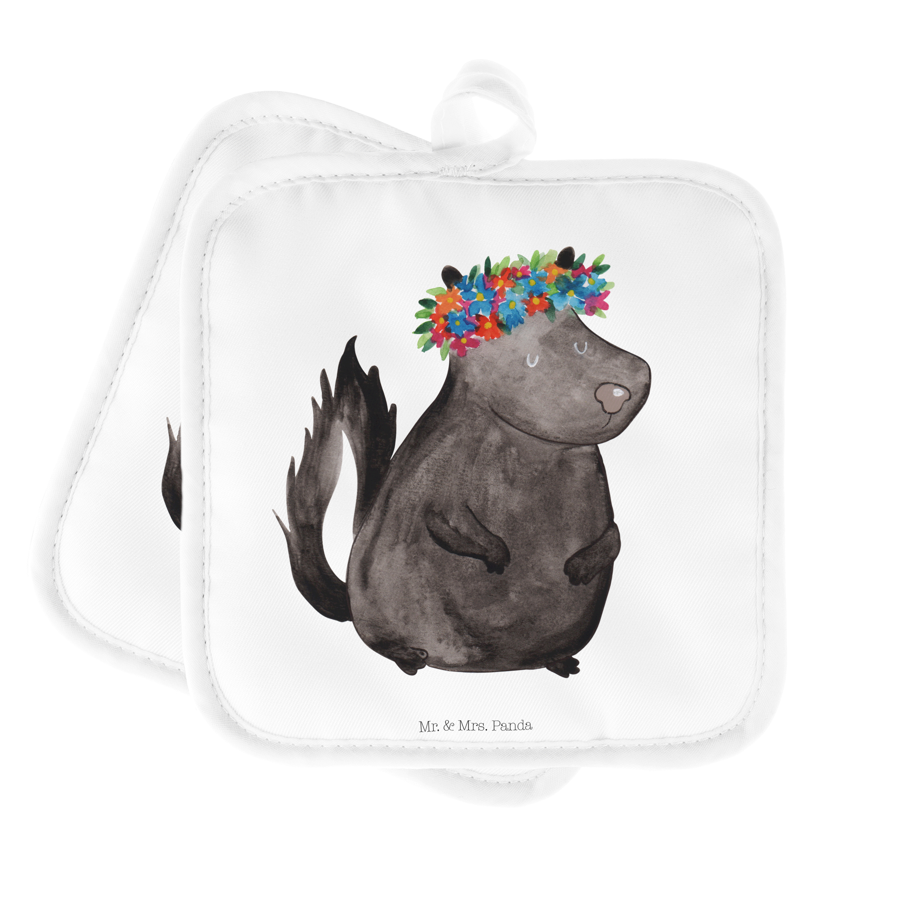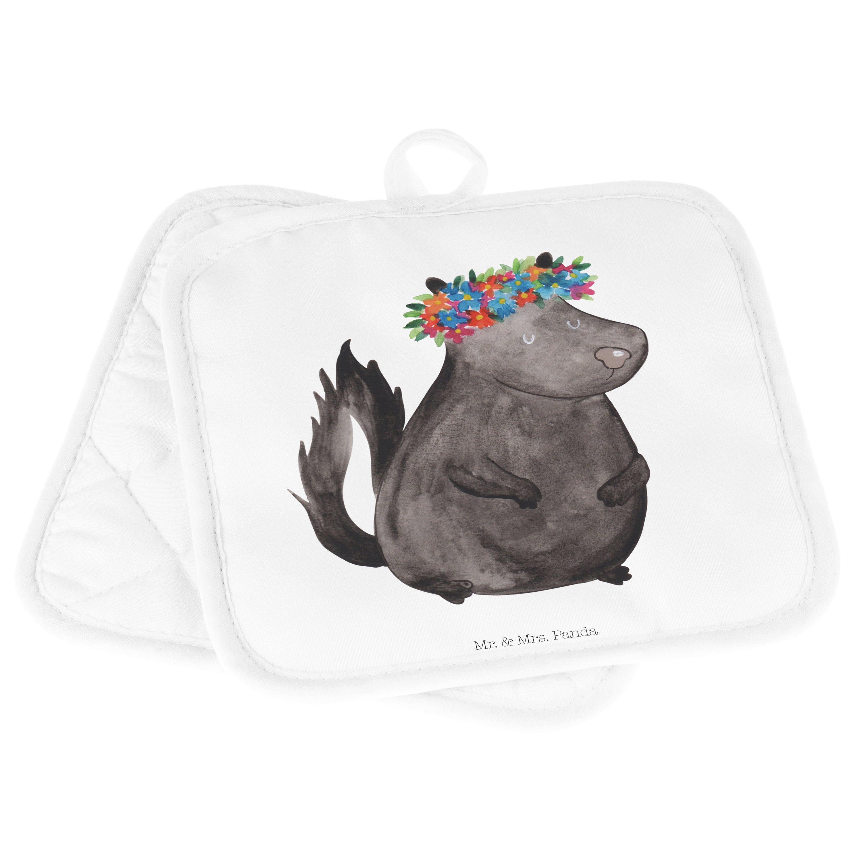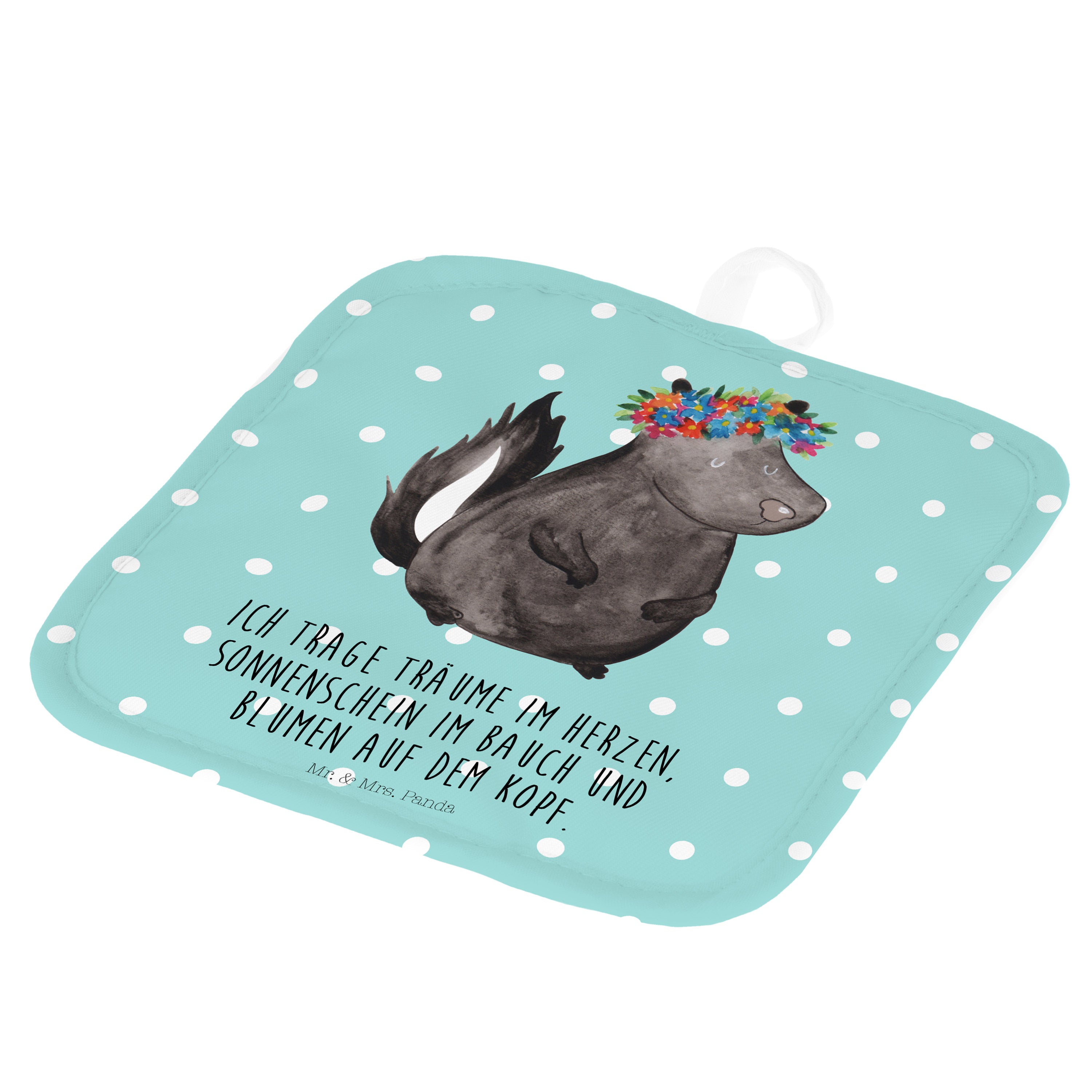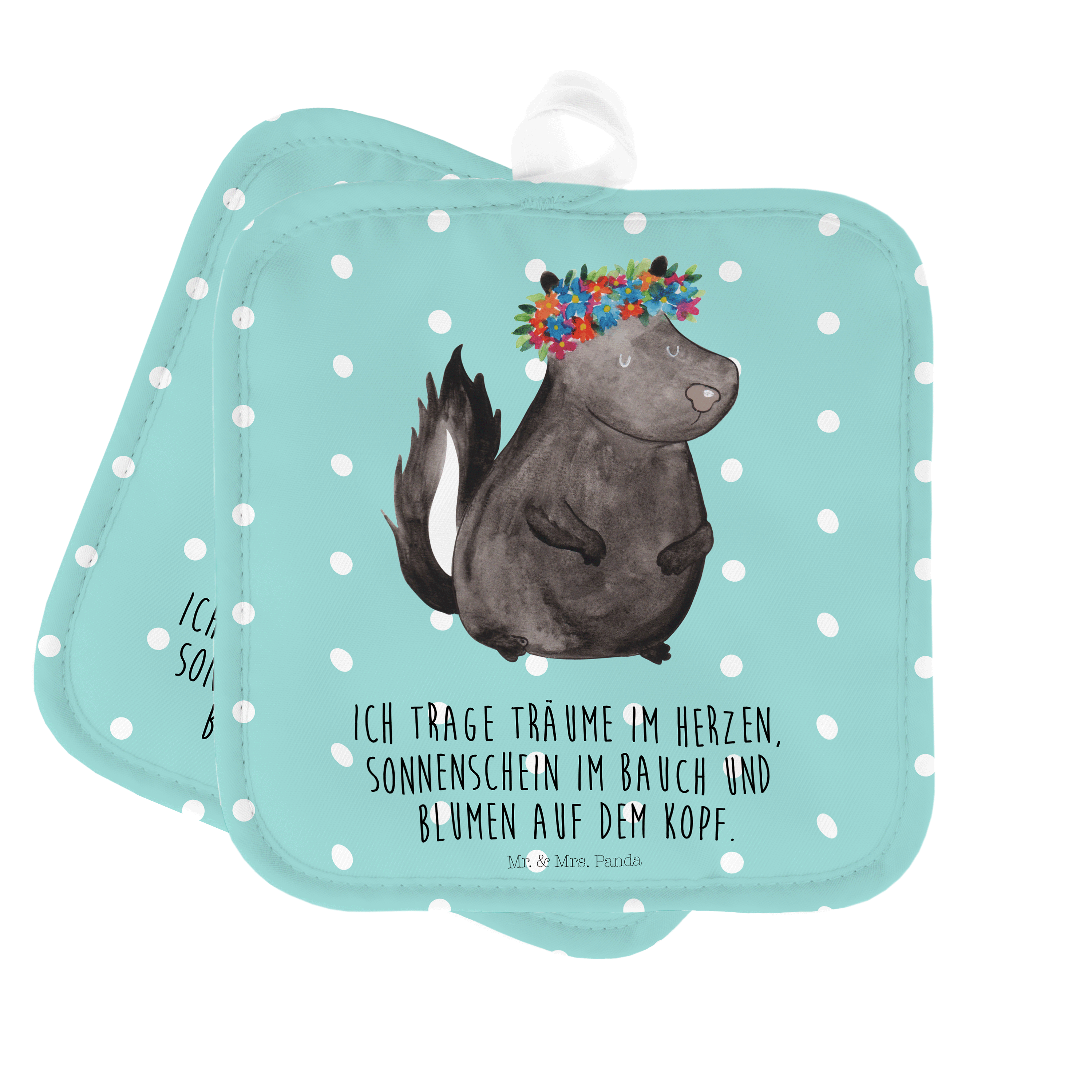 2er Set Topflappen Stinktier Blumenmaedchen - mit Spruch - Türkis Pastell