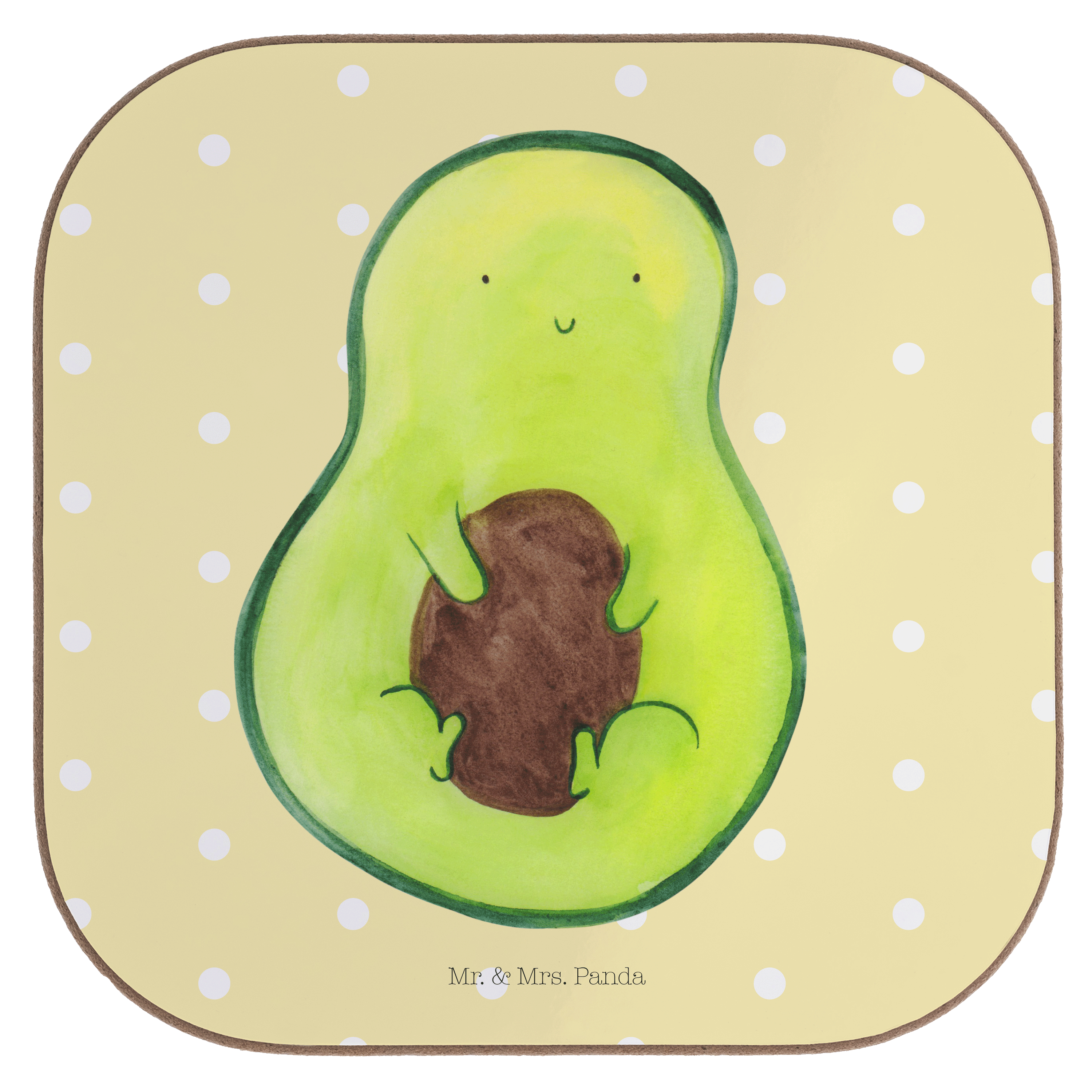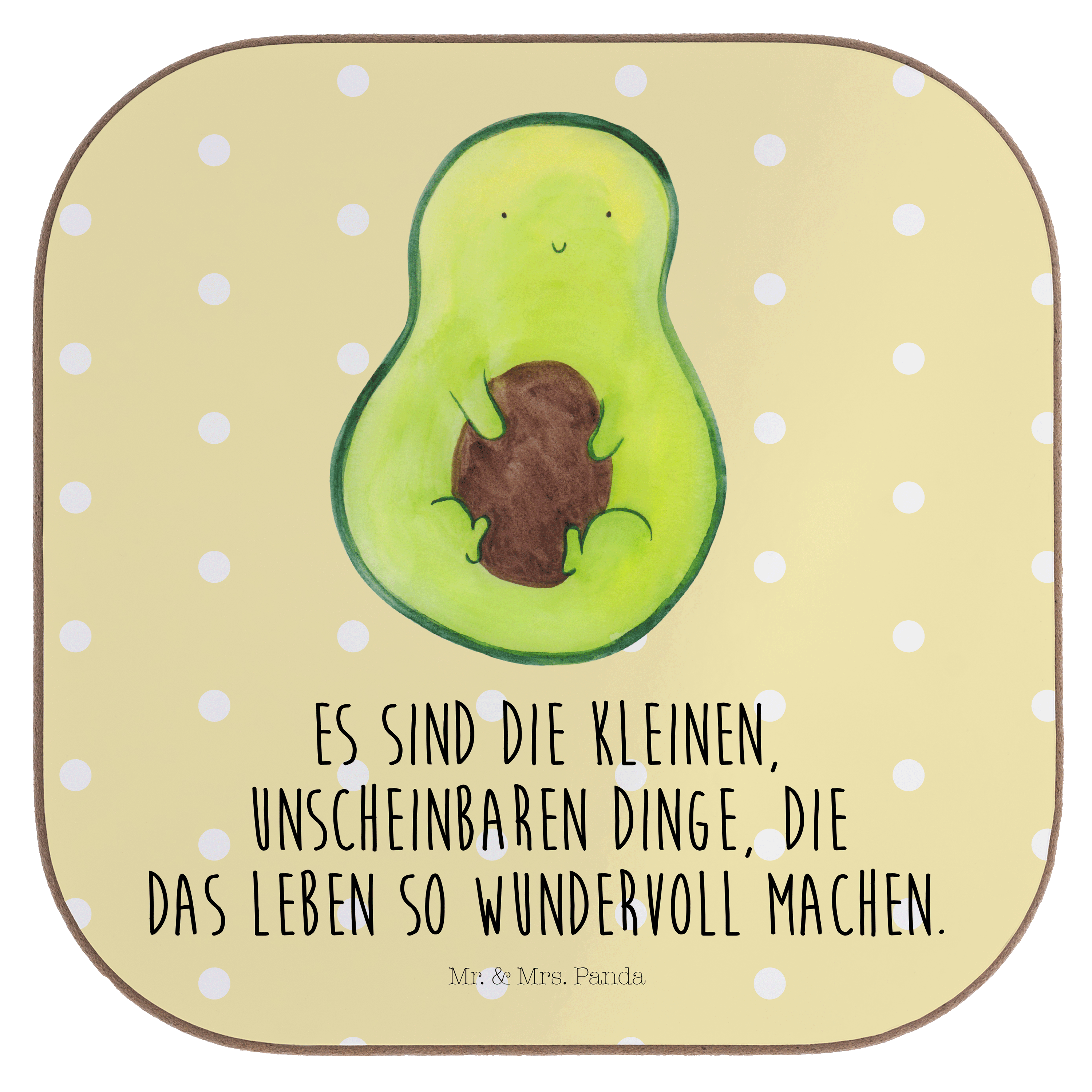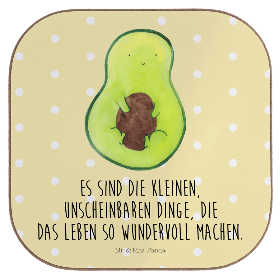 Quadratische Untersetzer Avocado mit Kern - mit Spruch - Gelb Pastell