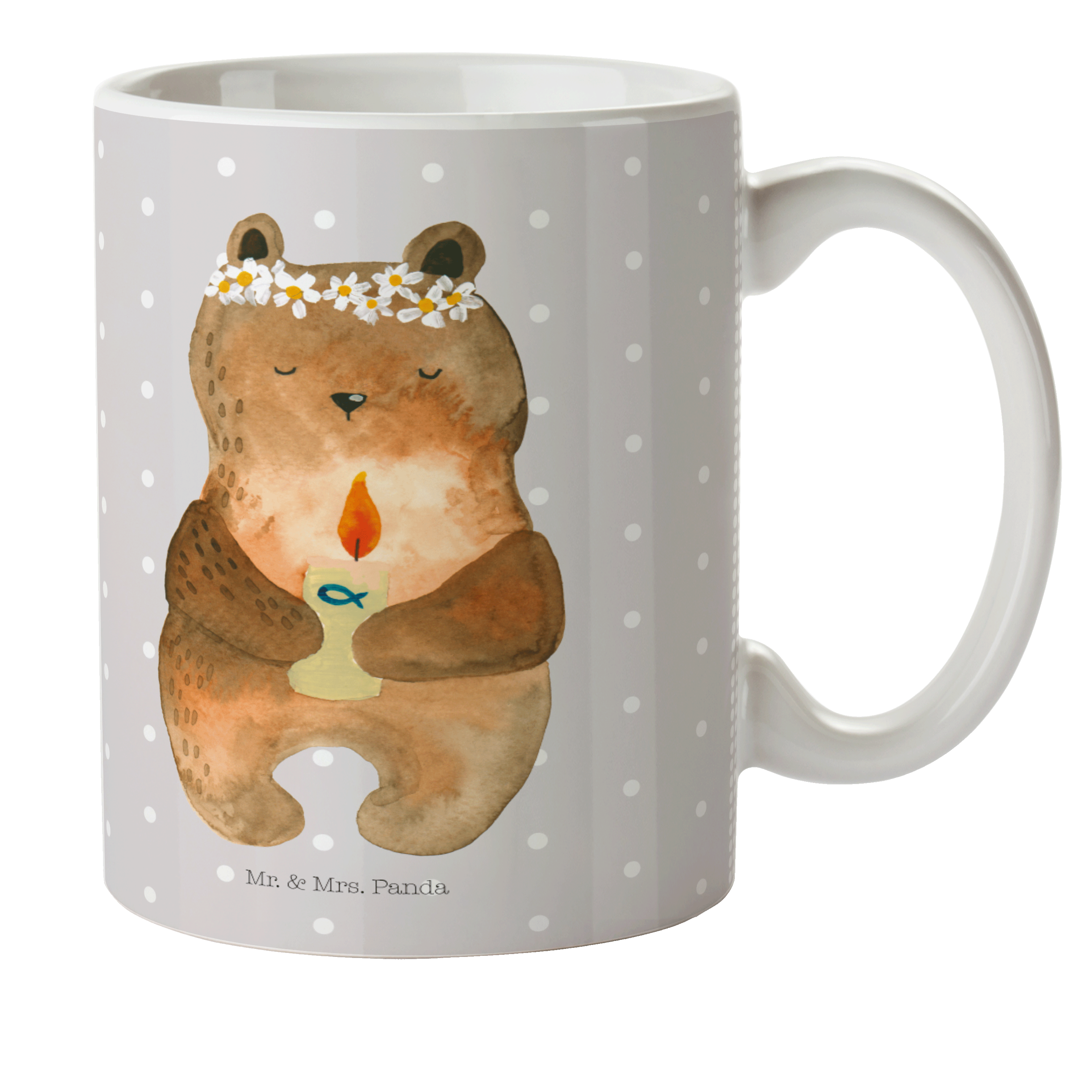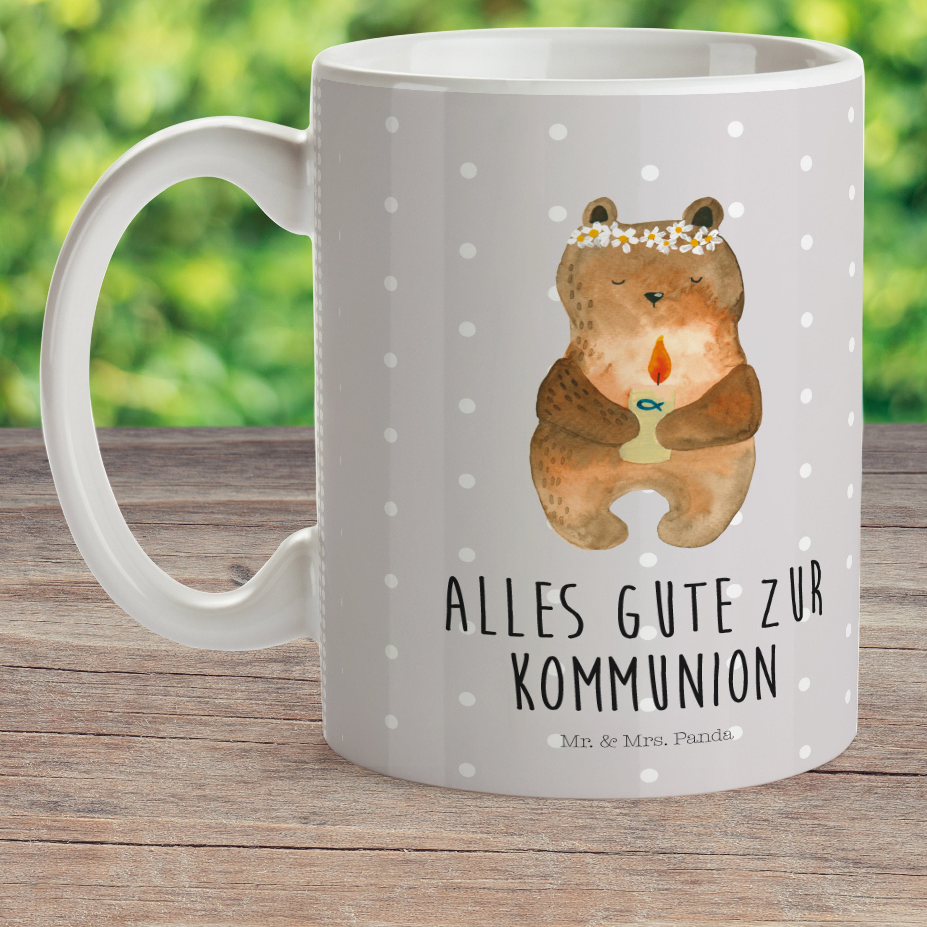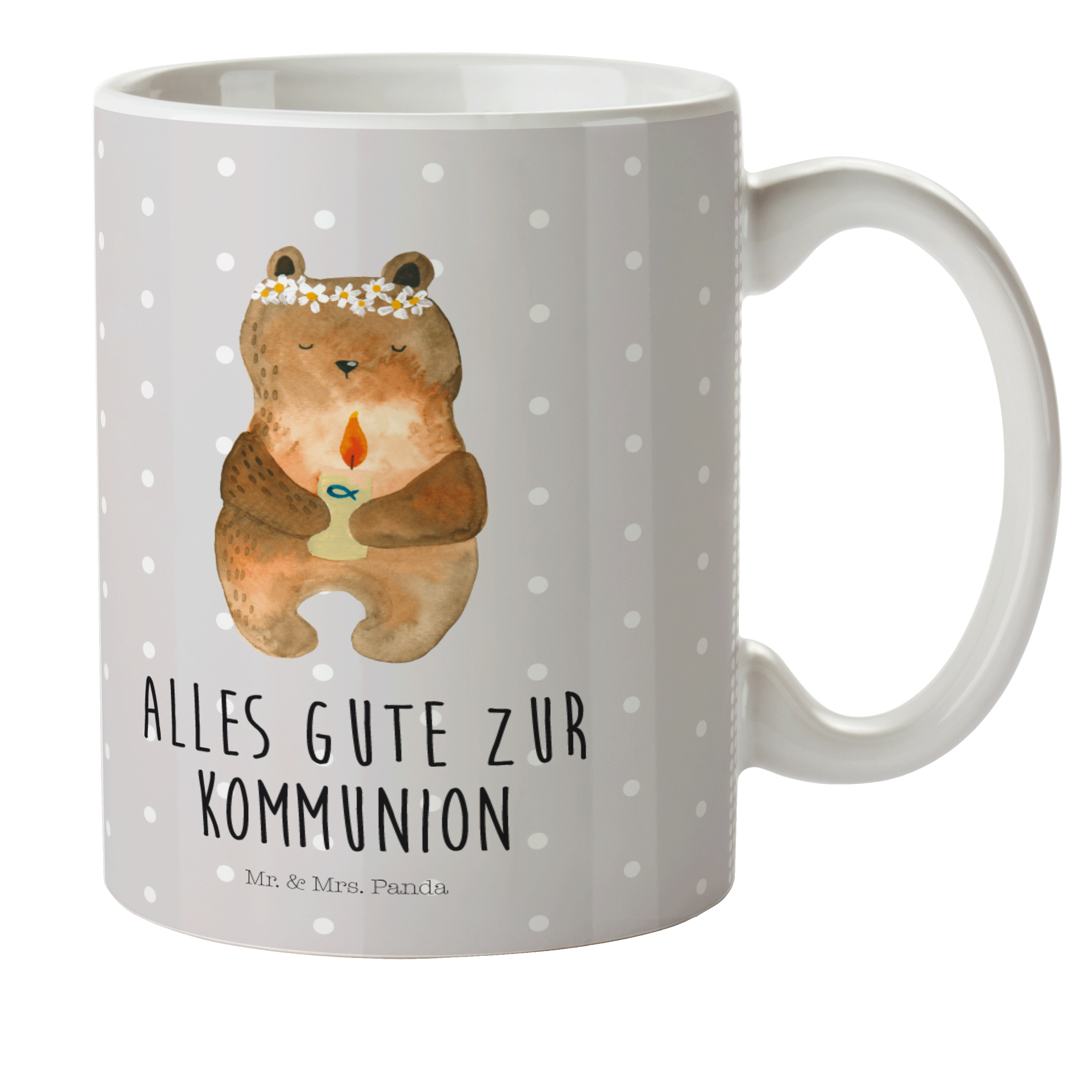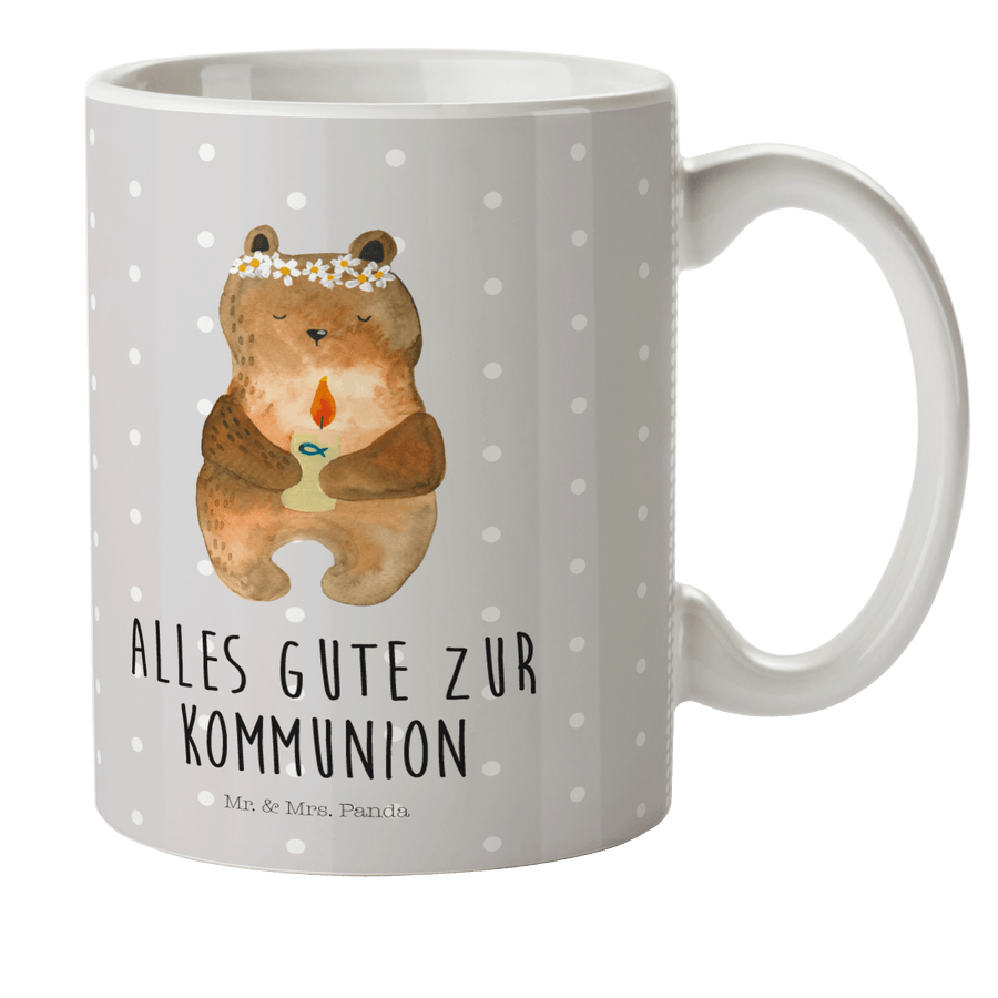 Kindertasse Kommunion-Bär - mit Spruch - Grau Pastell