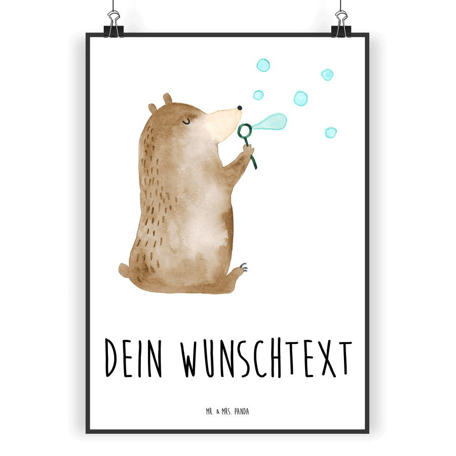 Stell dir vor, du beobachtest den süßen Bären, wie er gemütlich in der Luft Seifenblasen bläst. Seine großen Augen glitzern vor Freude, während die Seifenblasen sanft im Wind schaukeln. Die liebevolle Gestaltung von Mr. & Mrs. Panda erweckt das bärige Motiv zum Leben und lässt dein Herz höher schlagen.