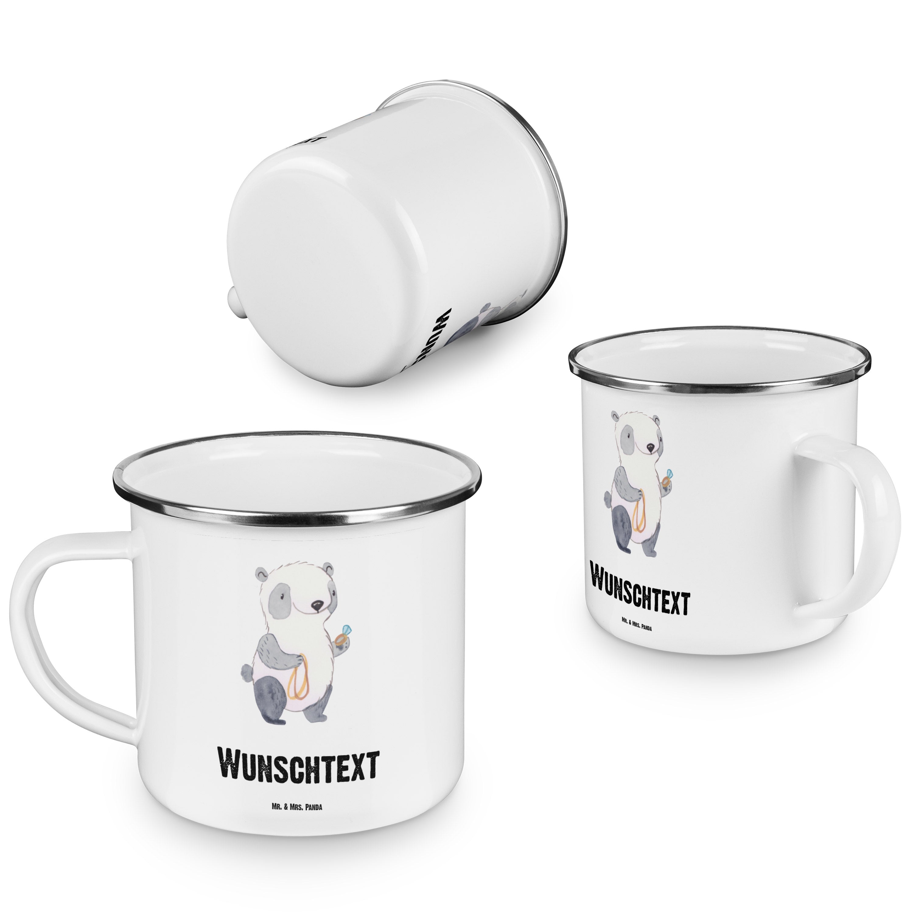 Diese wunderschöne personalisierte Emailletasse von Mr. & Mrs. Panda mit abgesetztem Edelstahl Rand in Emaille Optik ist der perfekte, bruchsichere Begleiter für dein nächstes Abenteuer. Sie wird von uns liebevoll mit deinem Namen oder Wunschnamen bedruckt. Das Füllvolumen des Bechers beträgt 300 ml. So sind die Motivtassen ideal beim Camping als Campingbecher einsetzbar.
