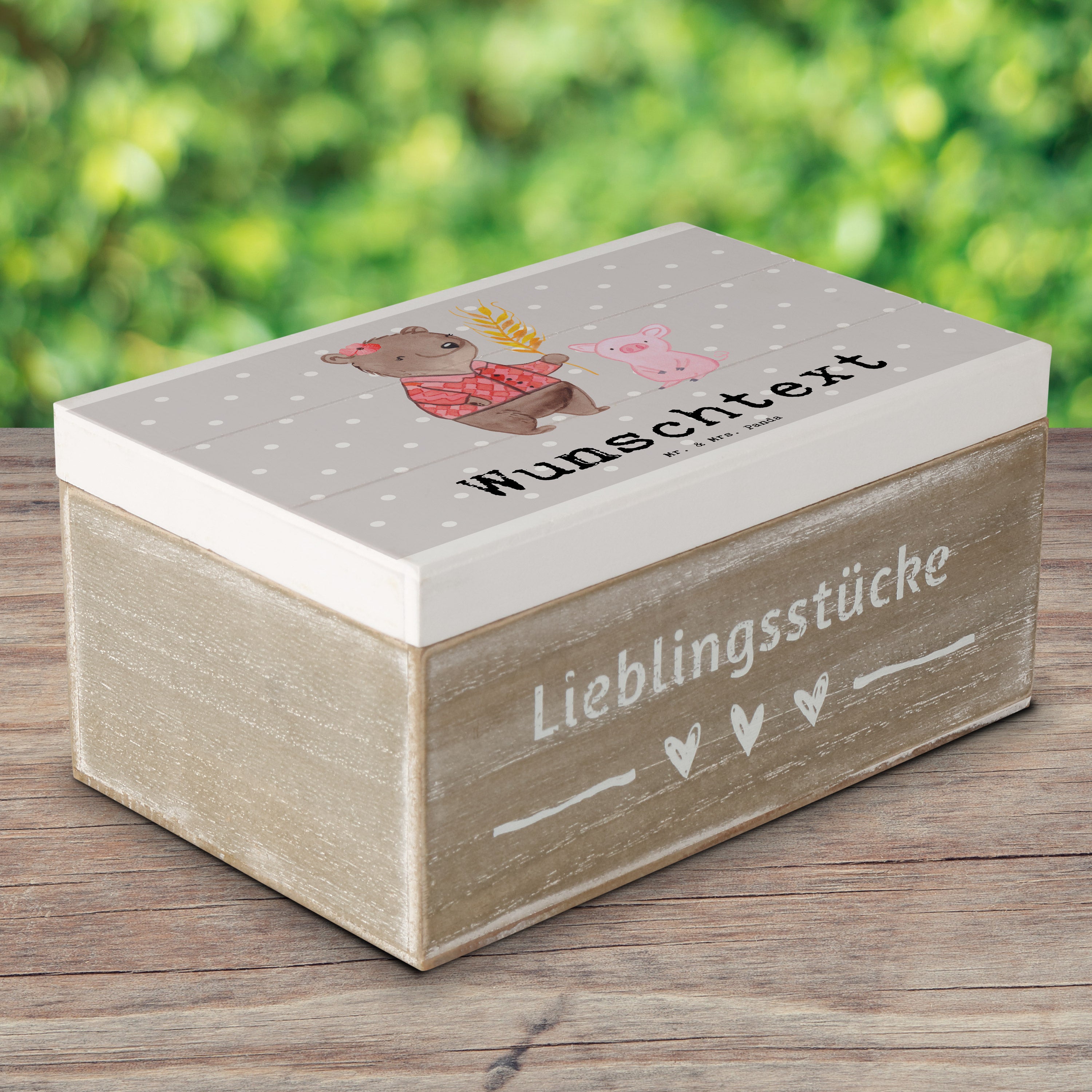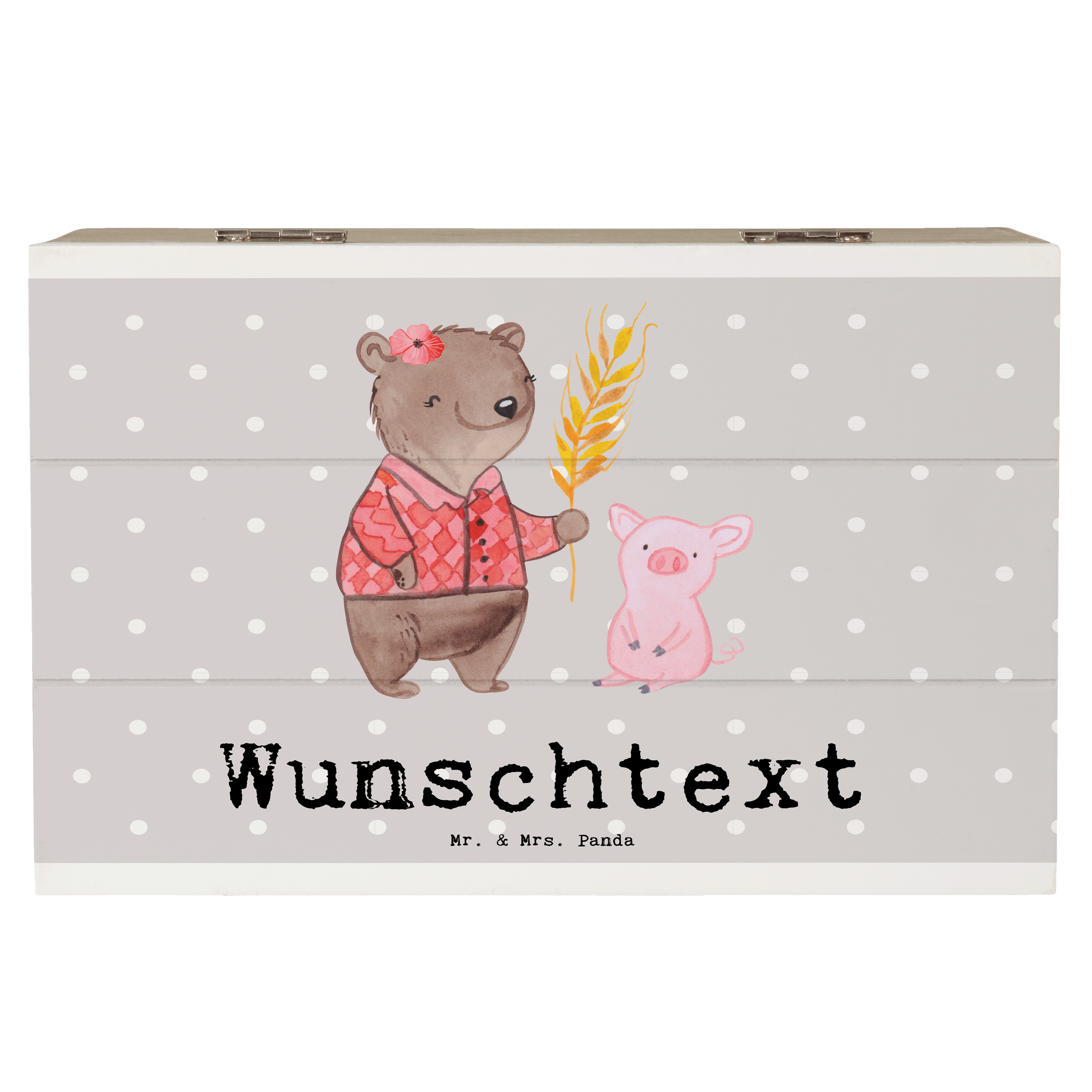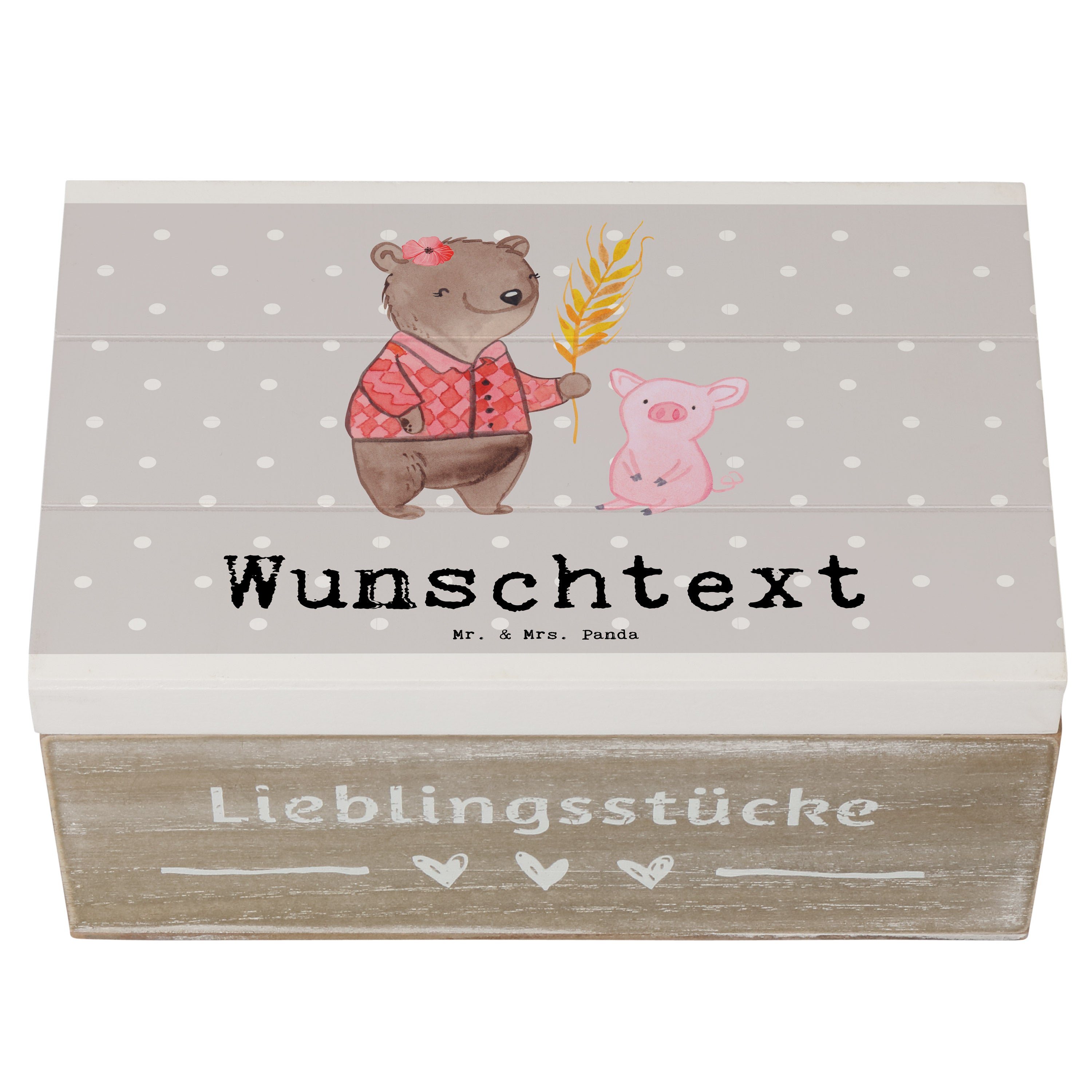 Personalisierte Holzkiste Bäuerin mit Herz - Grau Pastell - 19 x 12 cm