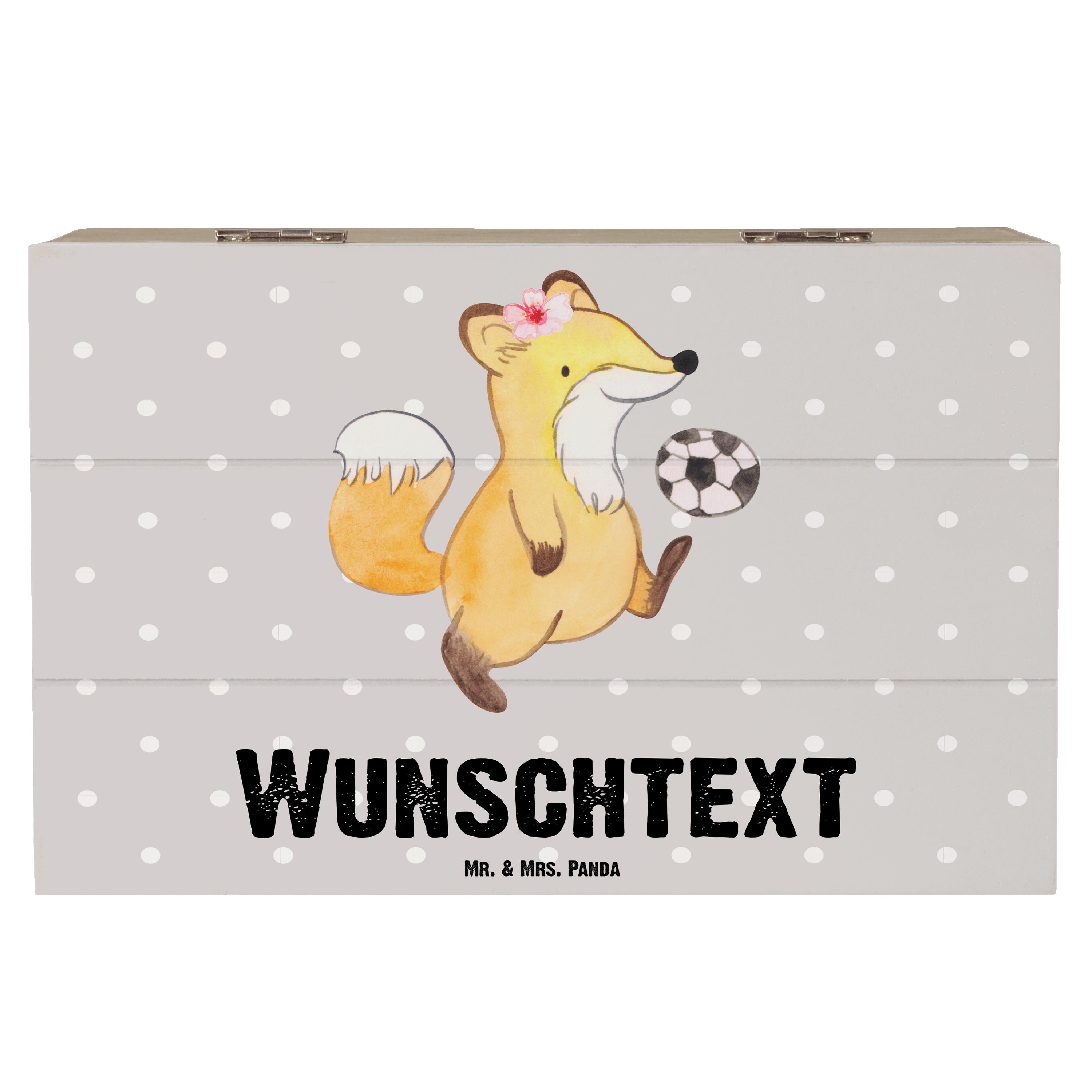 Personalisierte Holzkiste Fußballerin mit Herz - Grau Pastell - 19 x 12 cm