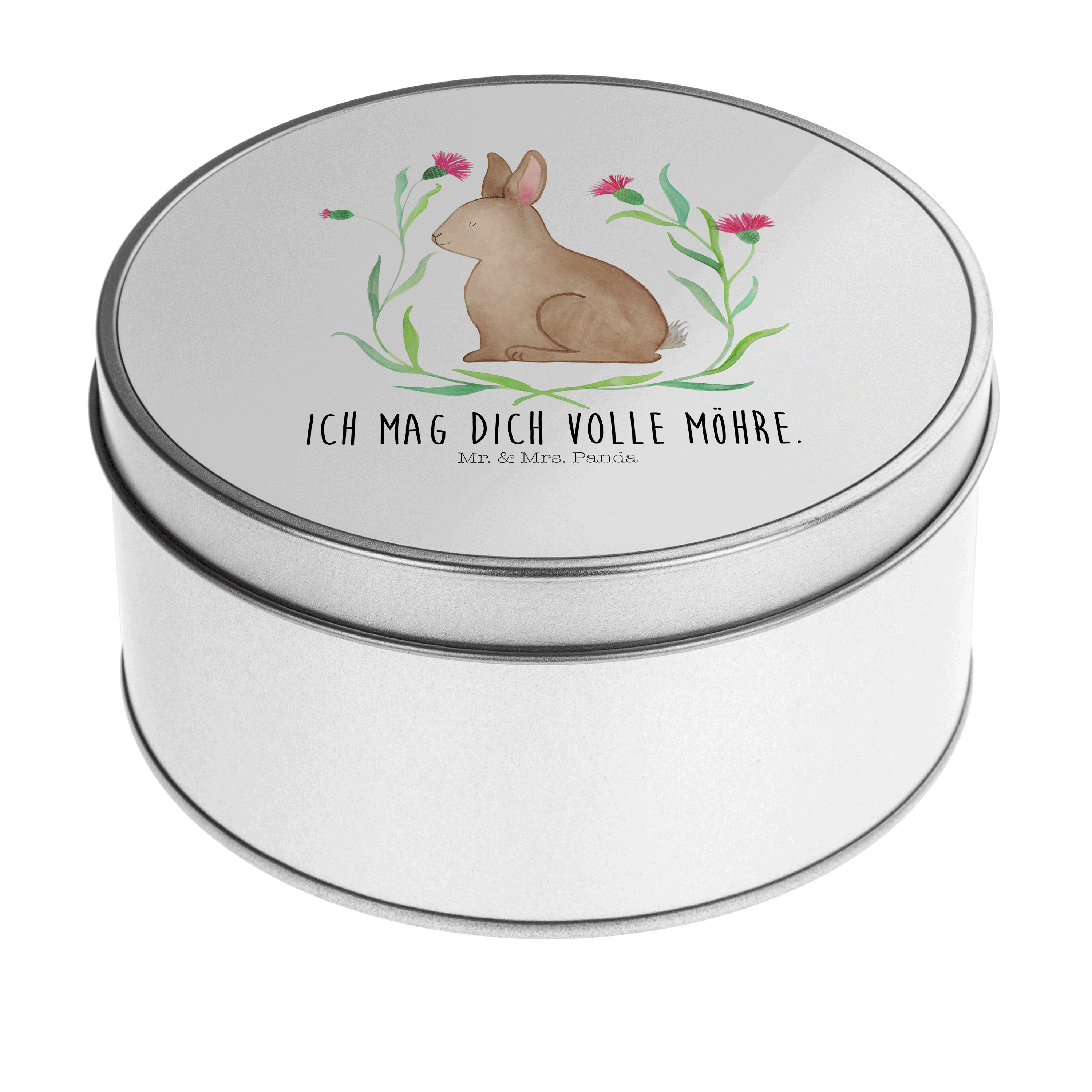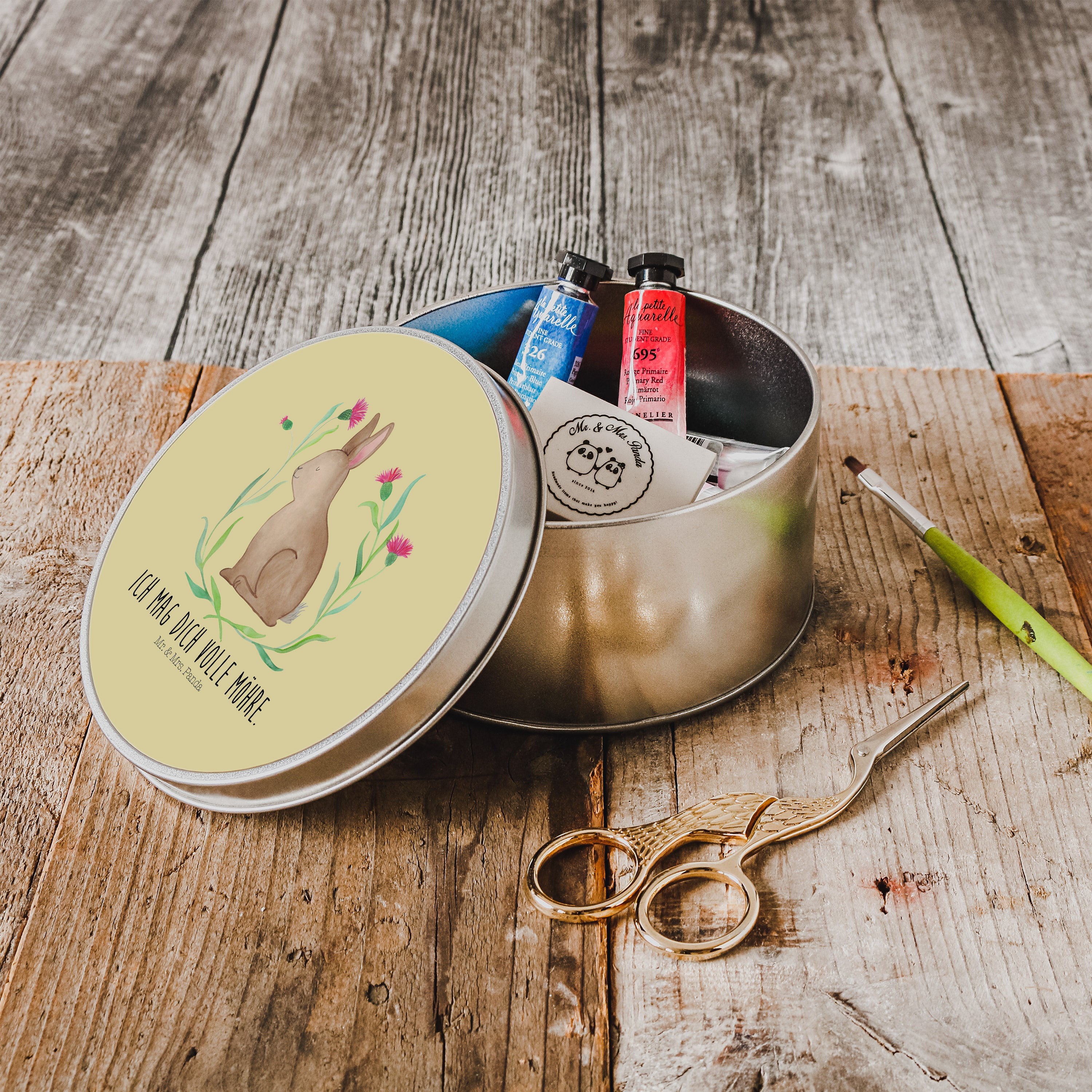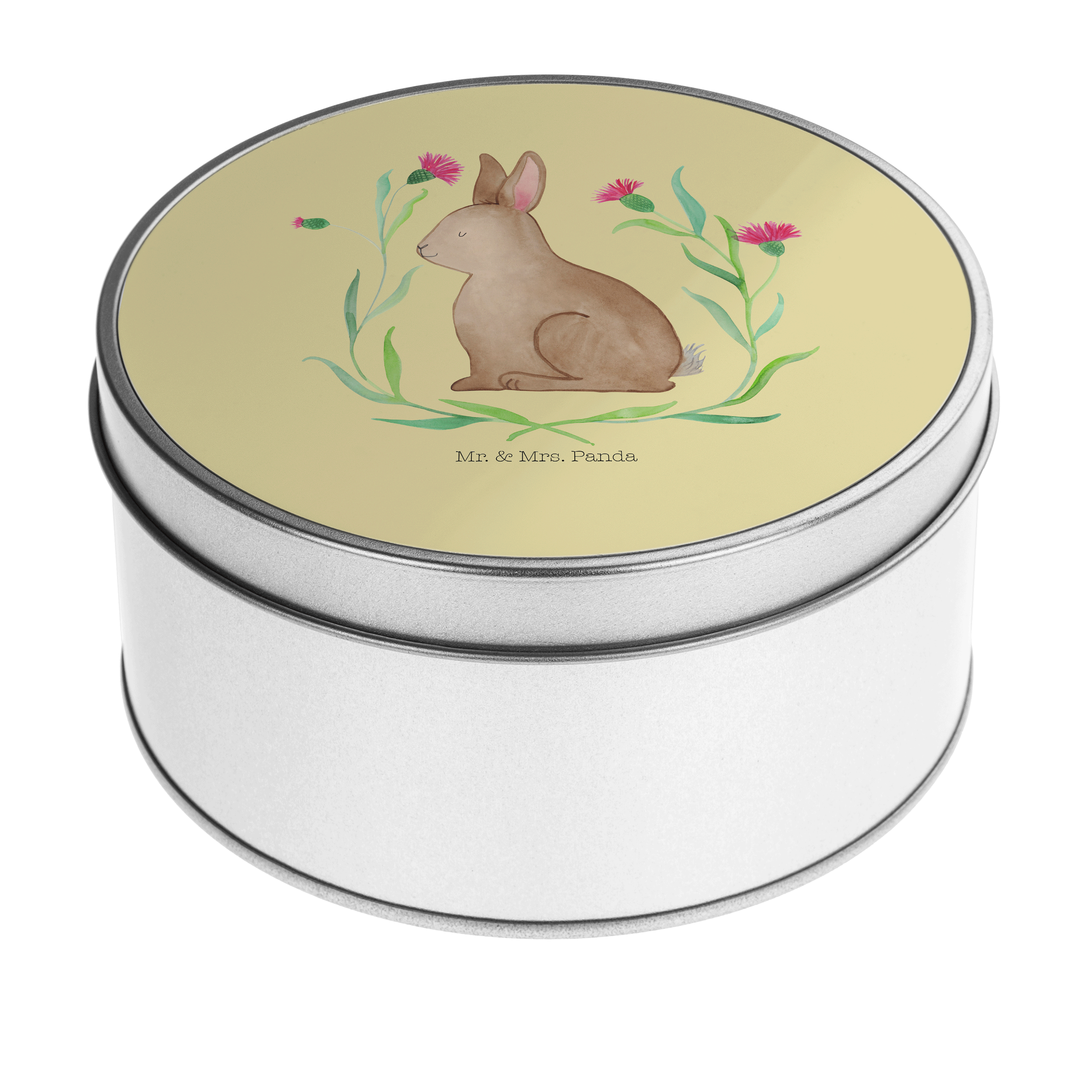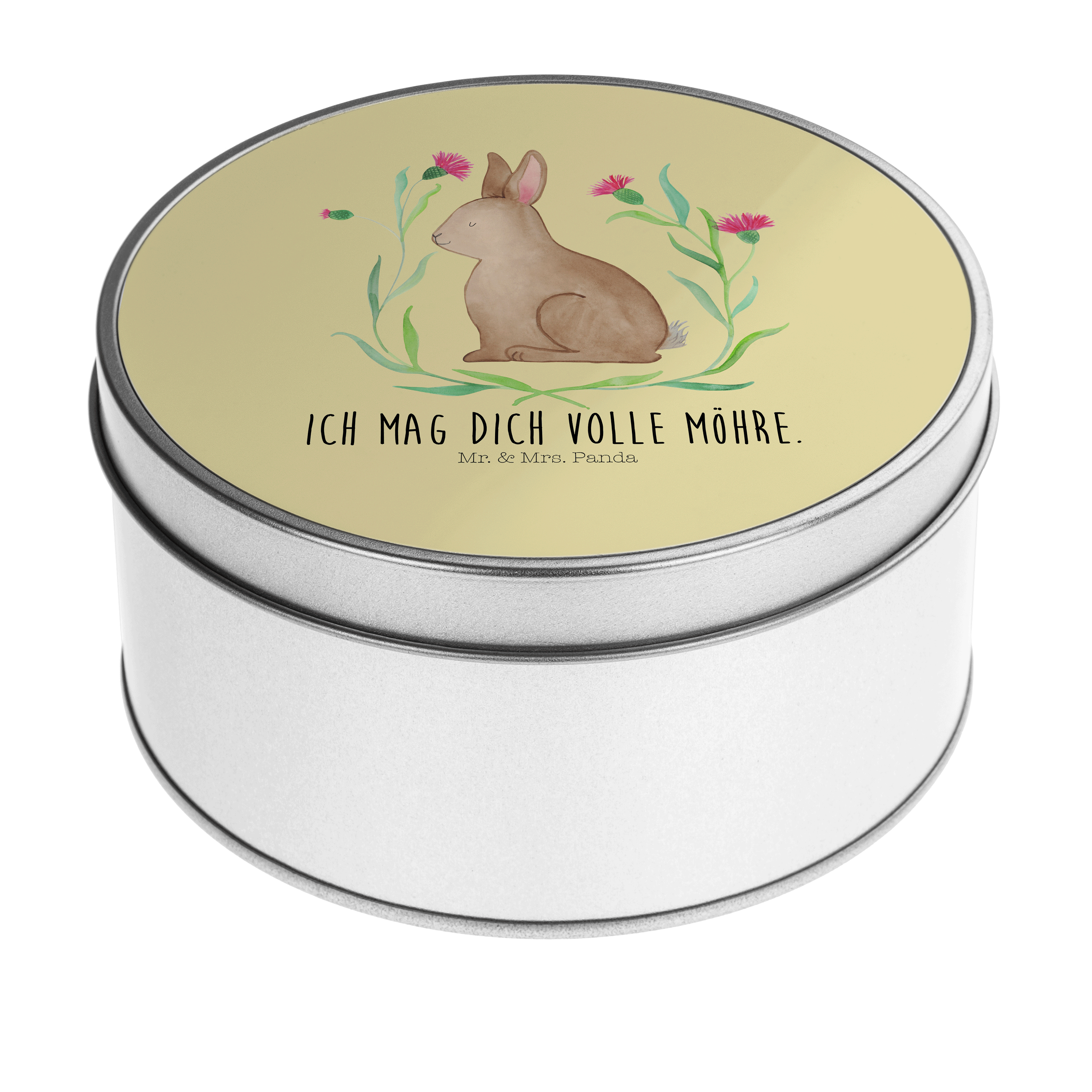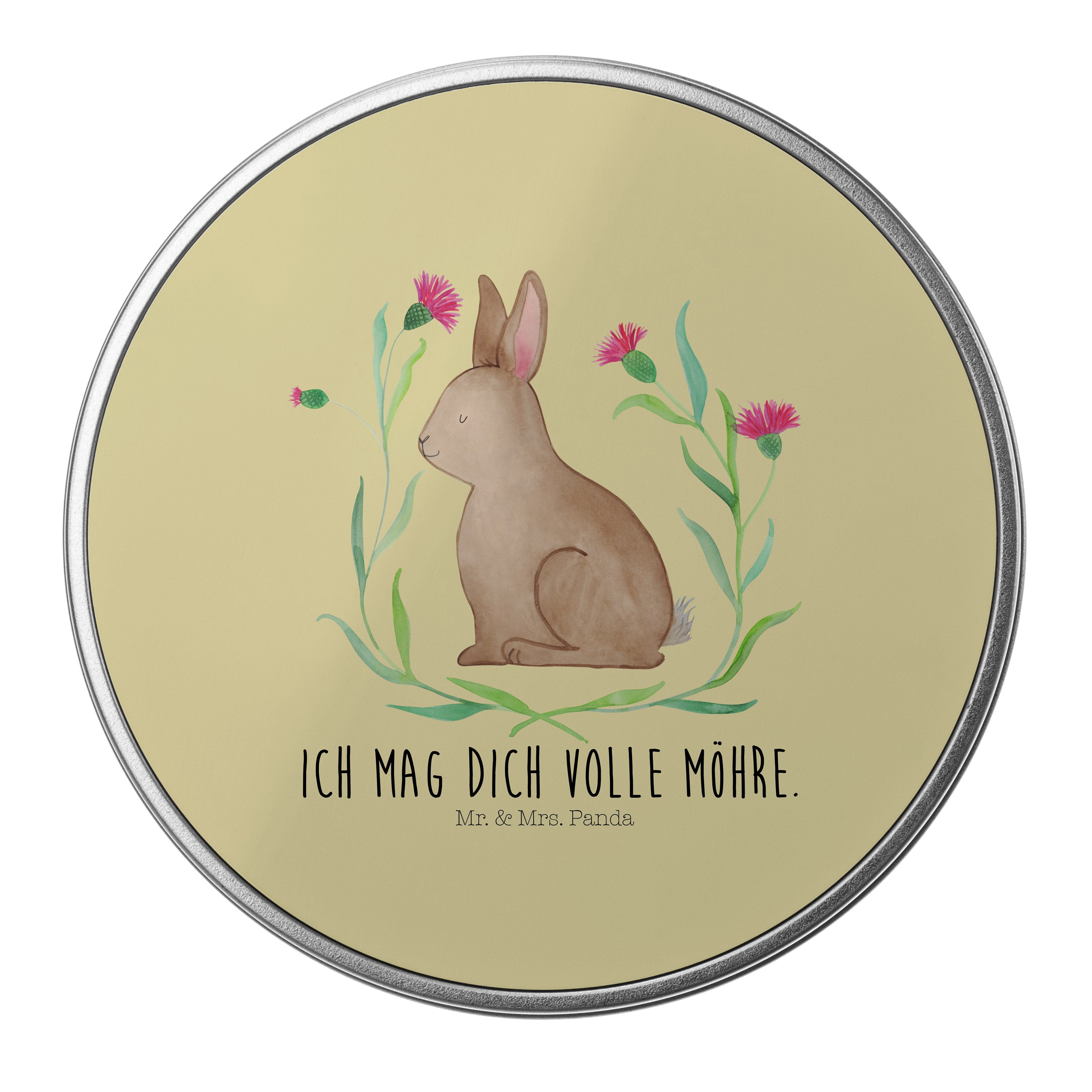 Blechdose rund Hase sitzend - mit Spruch - Gelb Pastell
