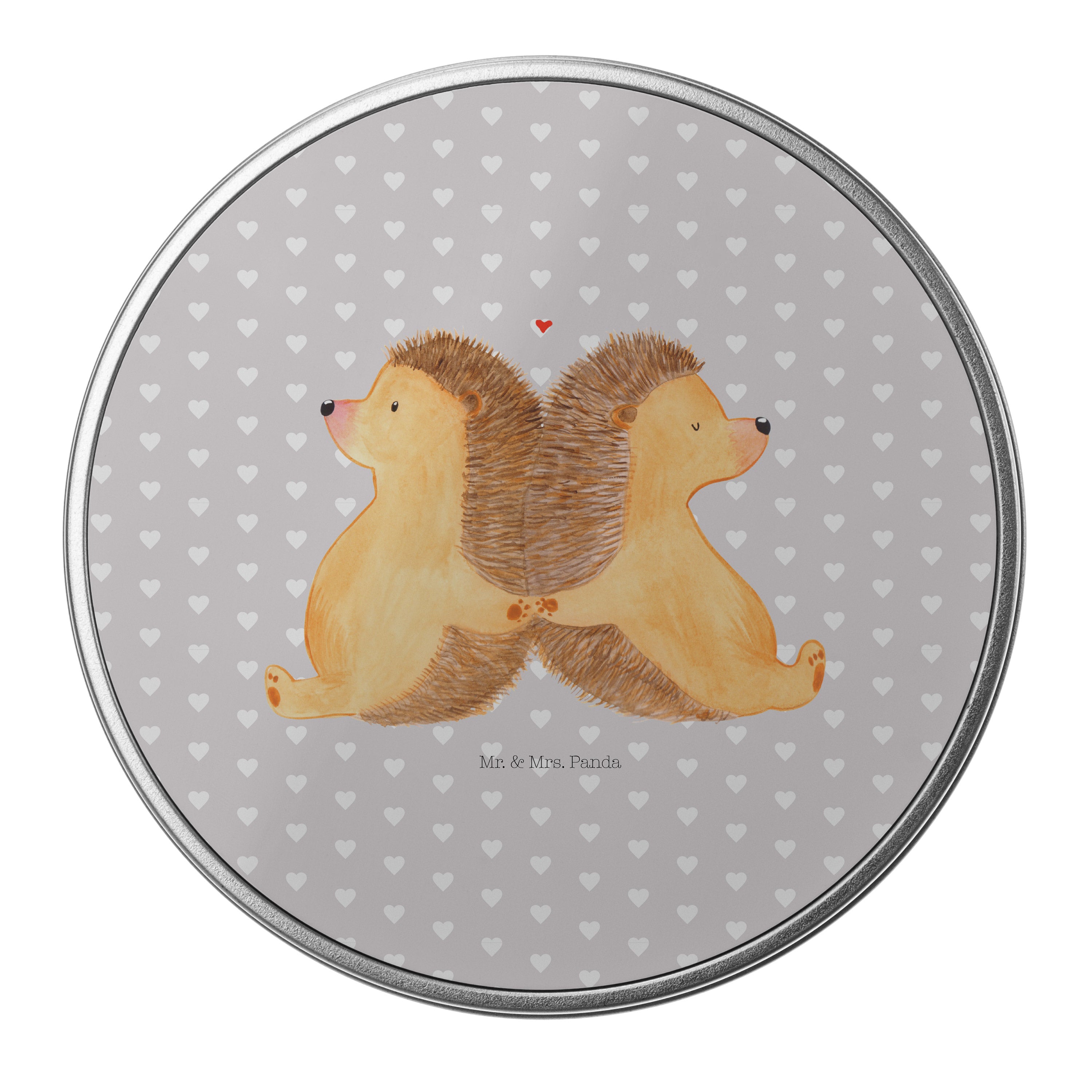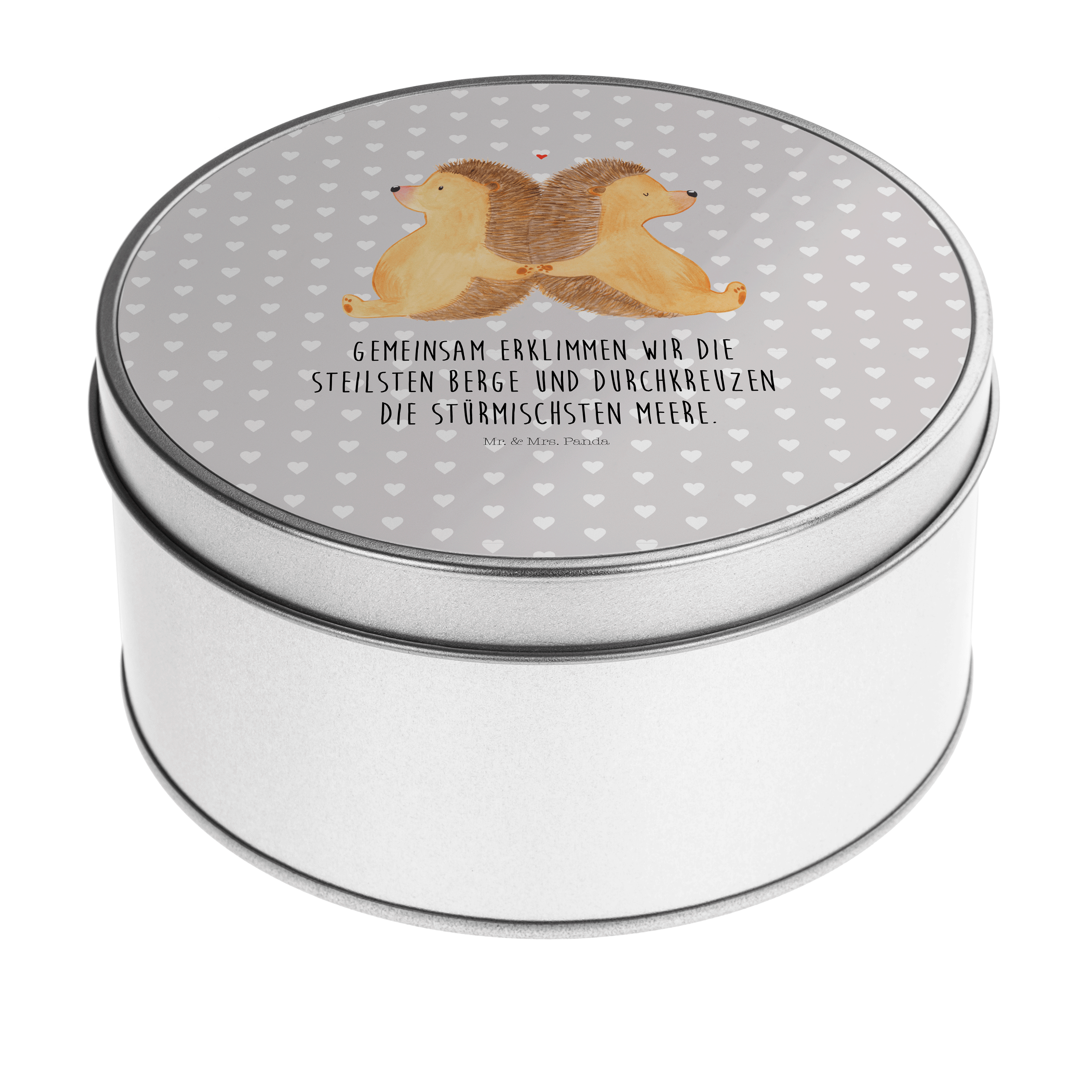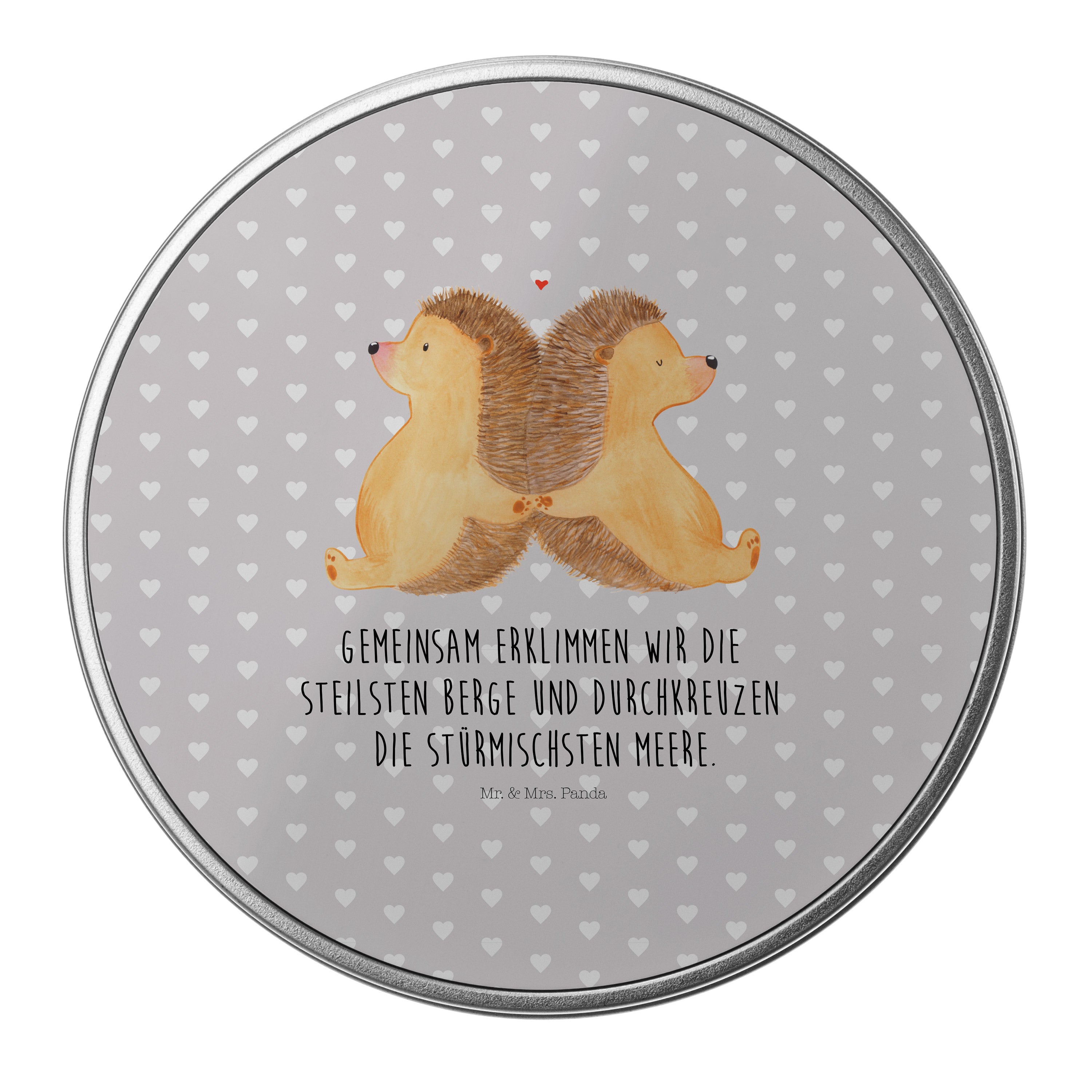 Blechdose rund Igel händchenhaltend - mit Spruch - Grau Pastell