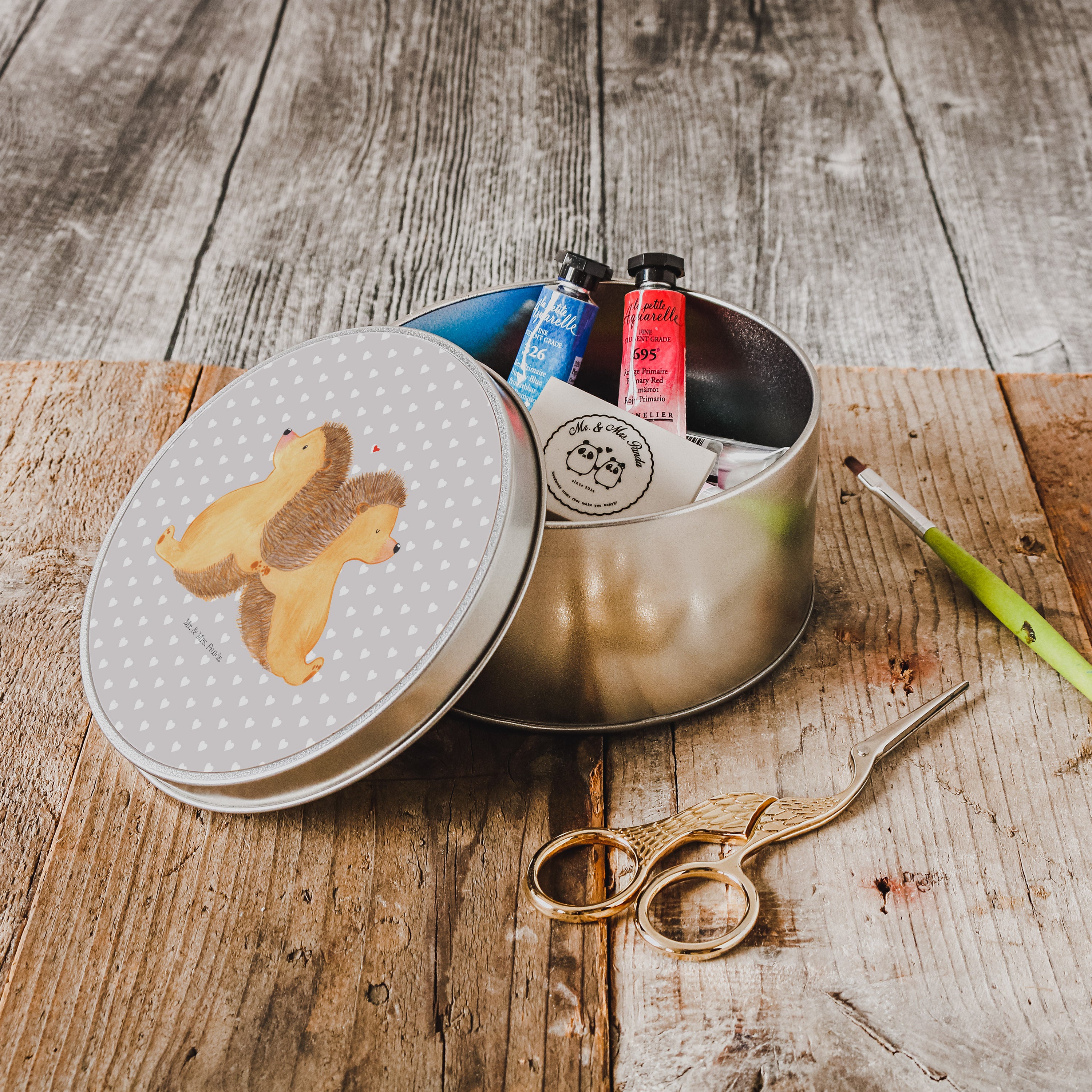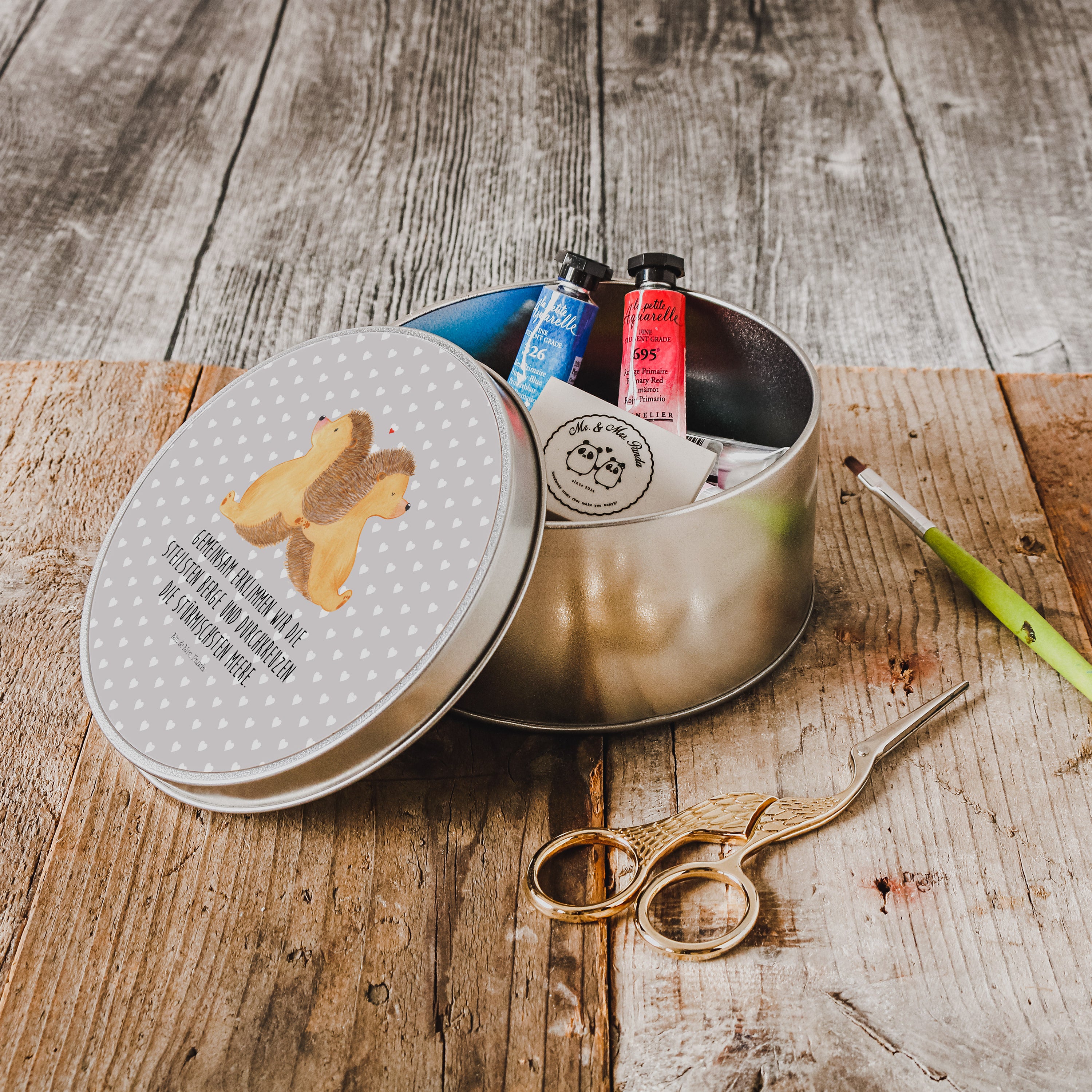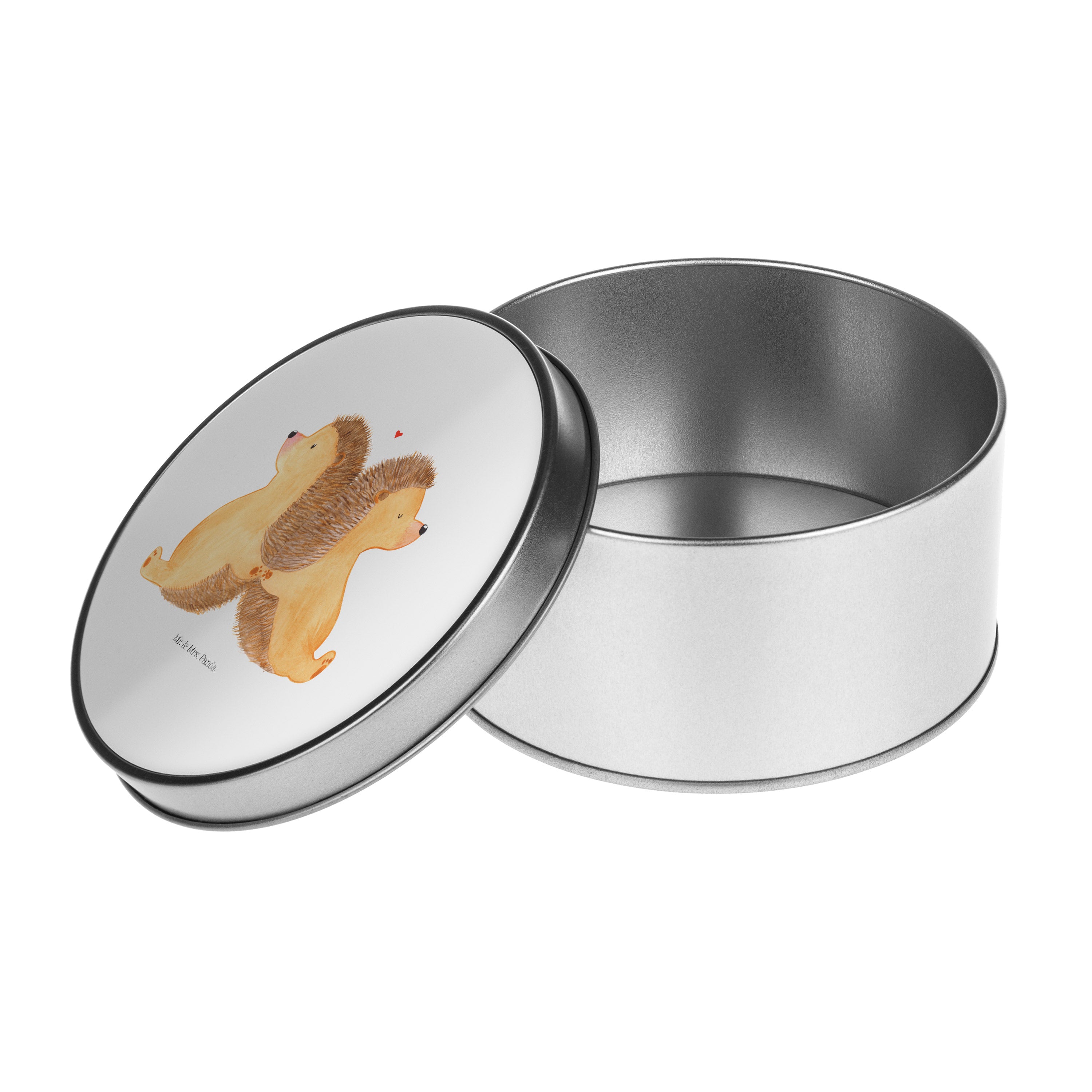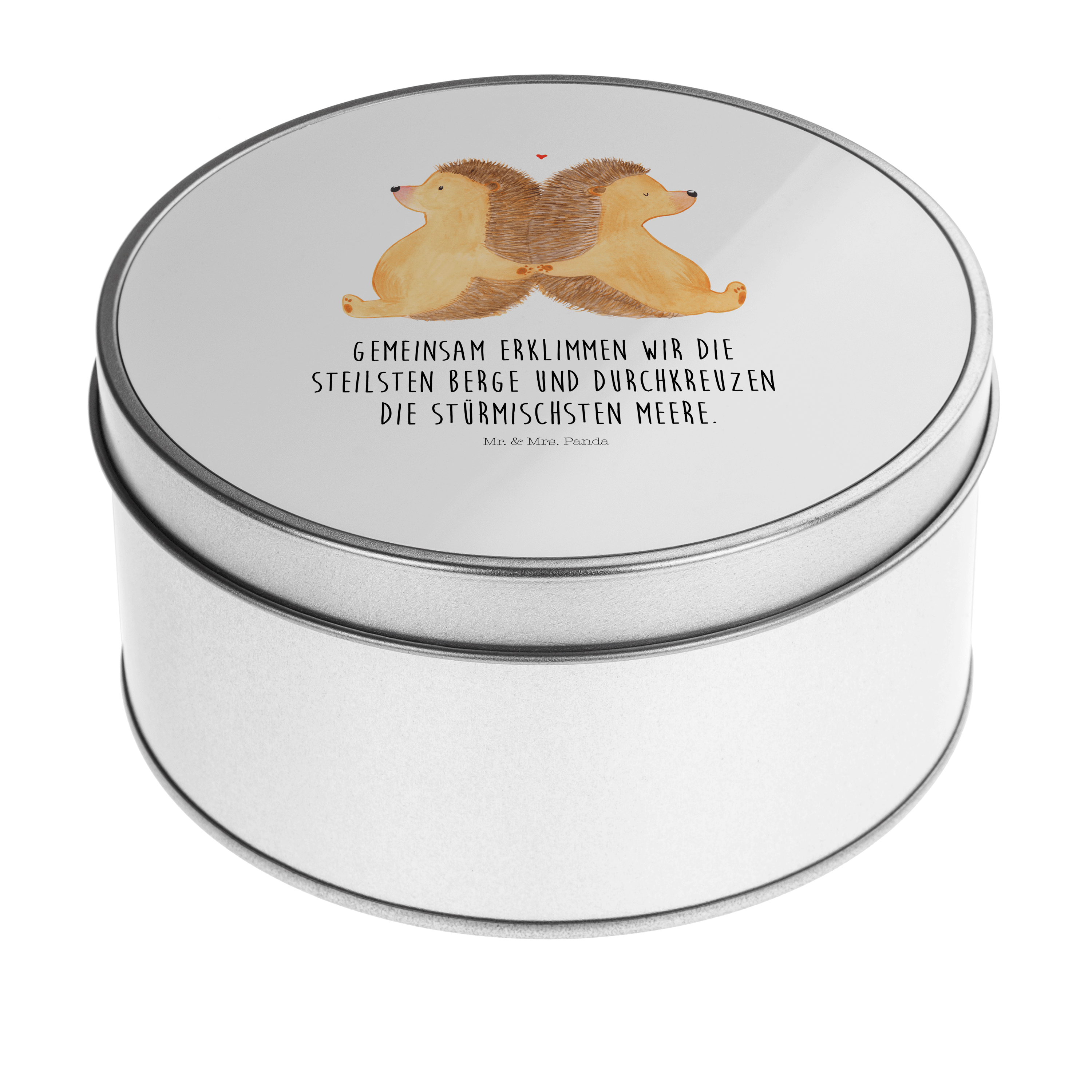 Blechdose rund Igel händchenhaltend - mit Spruch - Grau Pastell