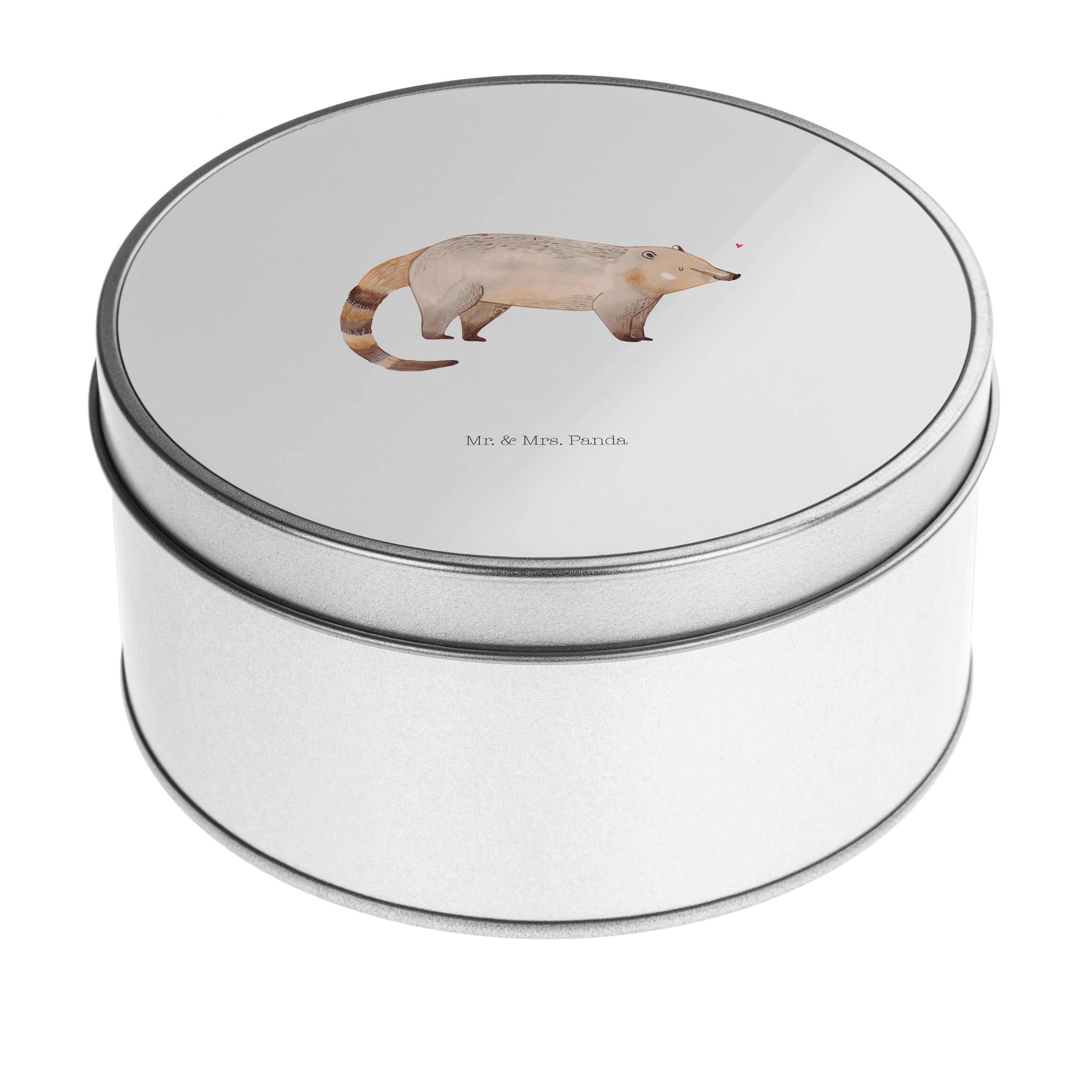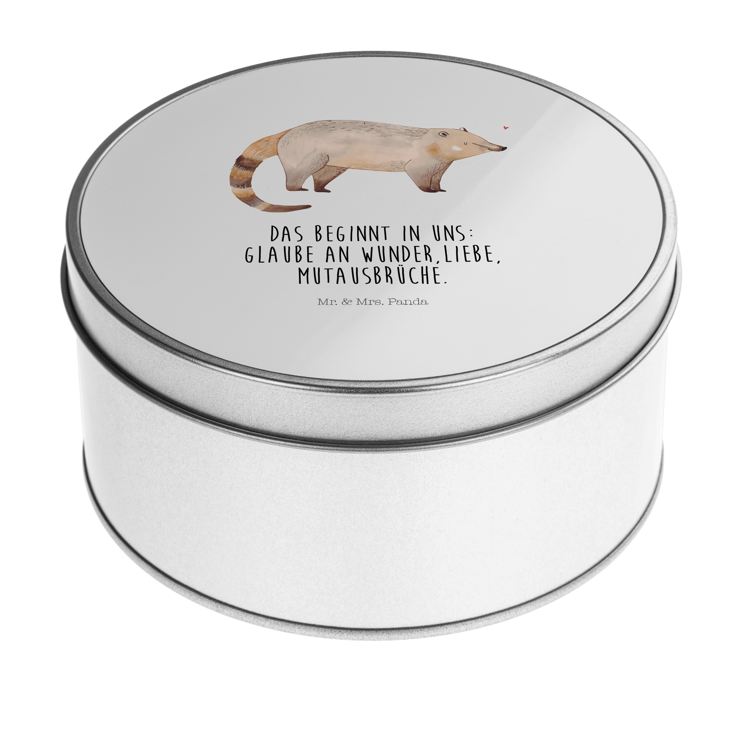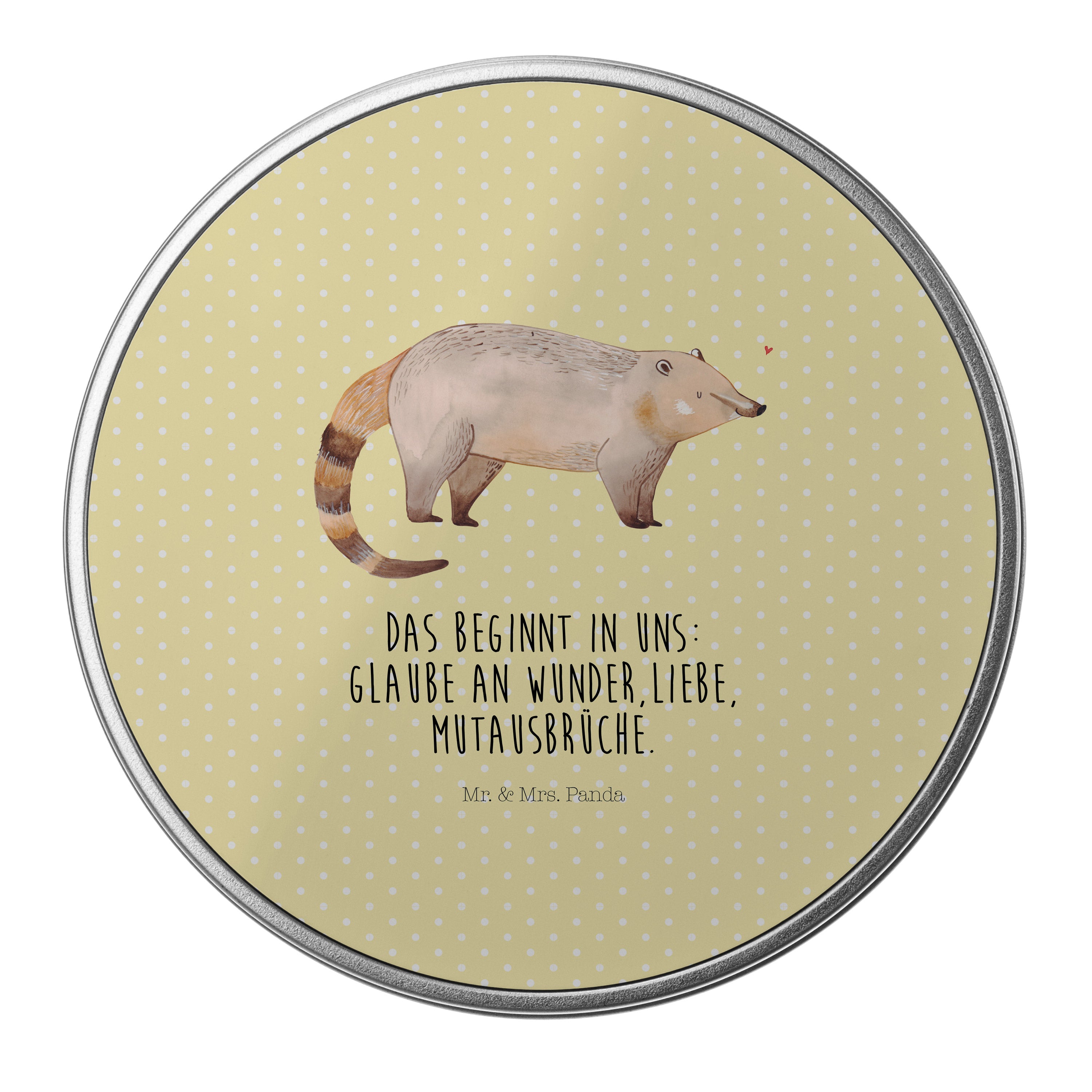 Blechdose rund Nasenbaer - mit Spruch - Gelb Pastell