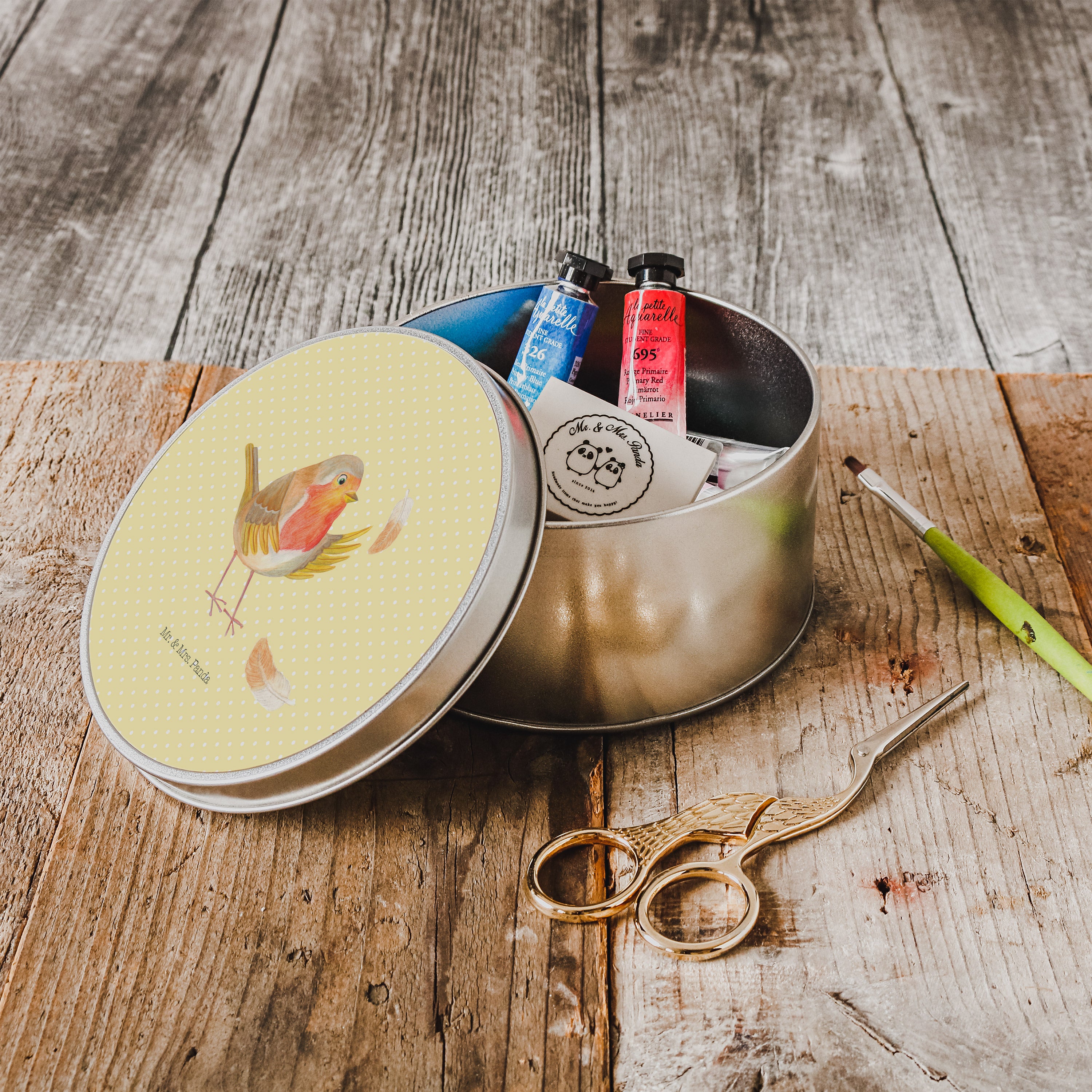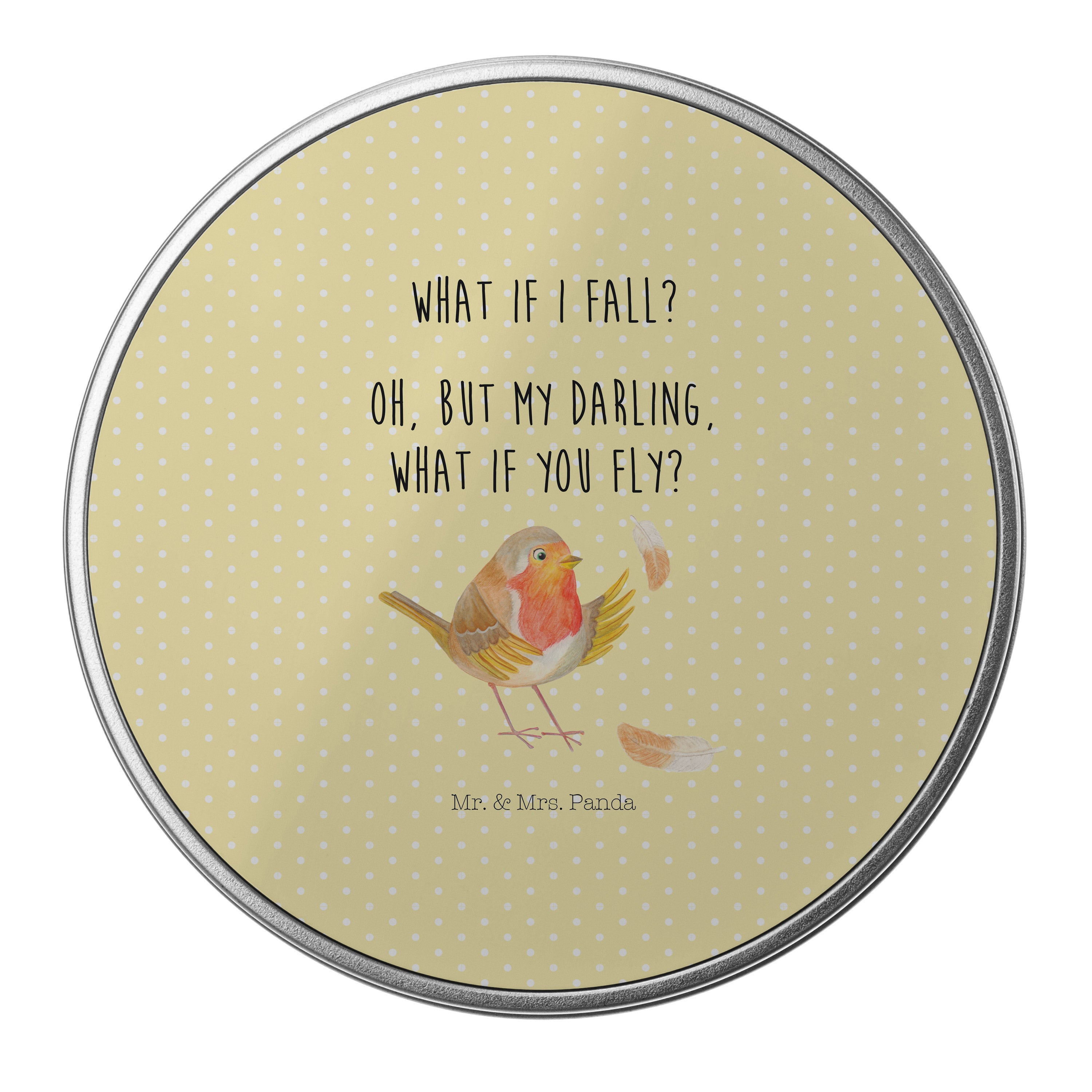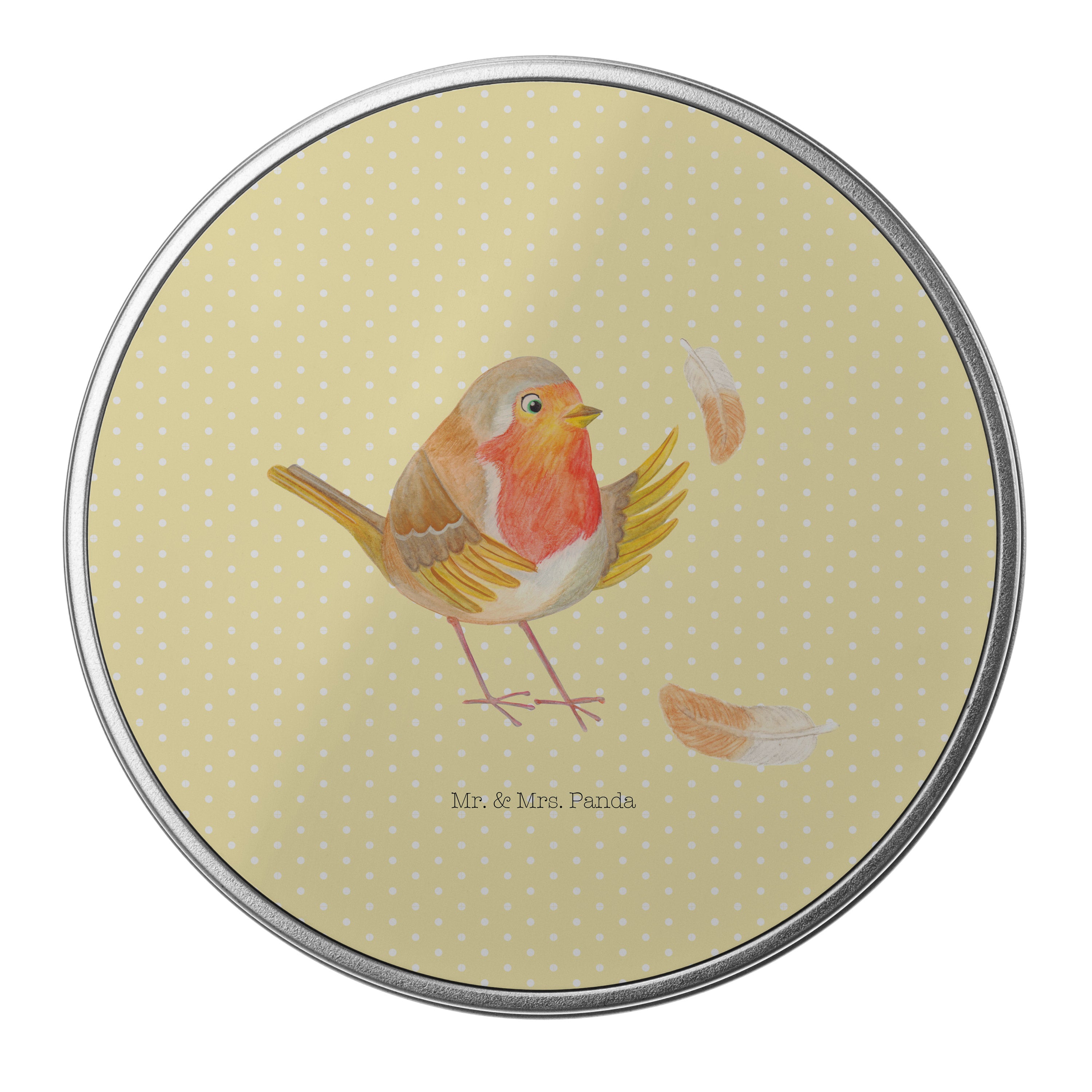 Blechdose rund Rotkehlchen mit Federn - mit Spruch - Gelb Pastell