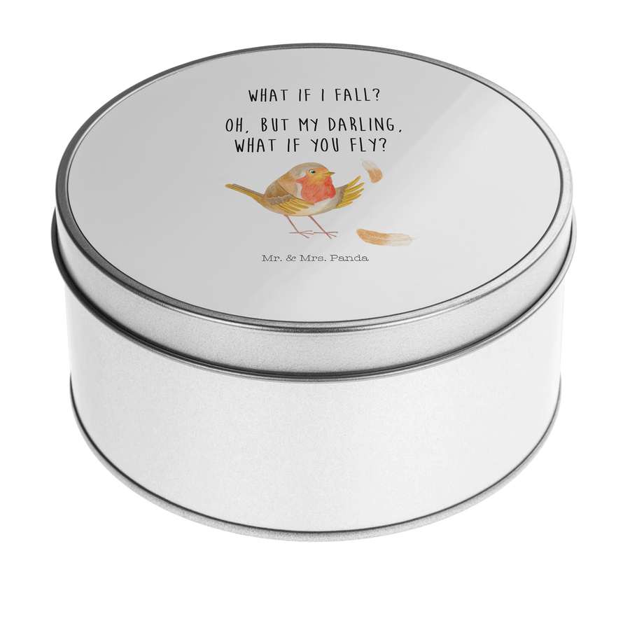 Blechdose rund Rotkehlchen mit Federn - mit Spruch - Weiß
