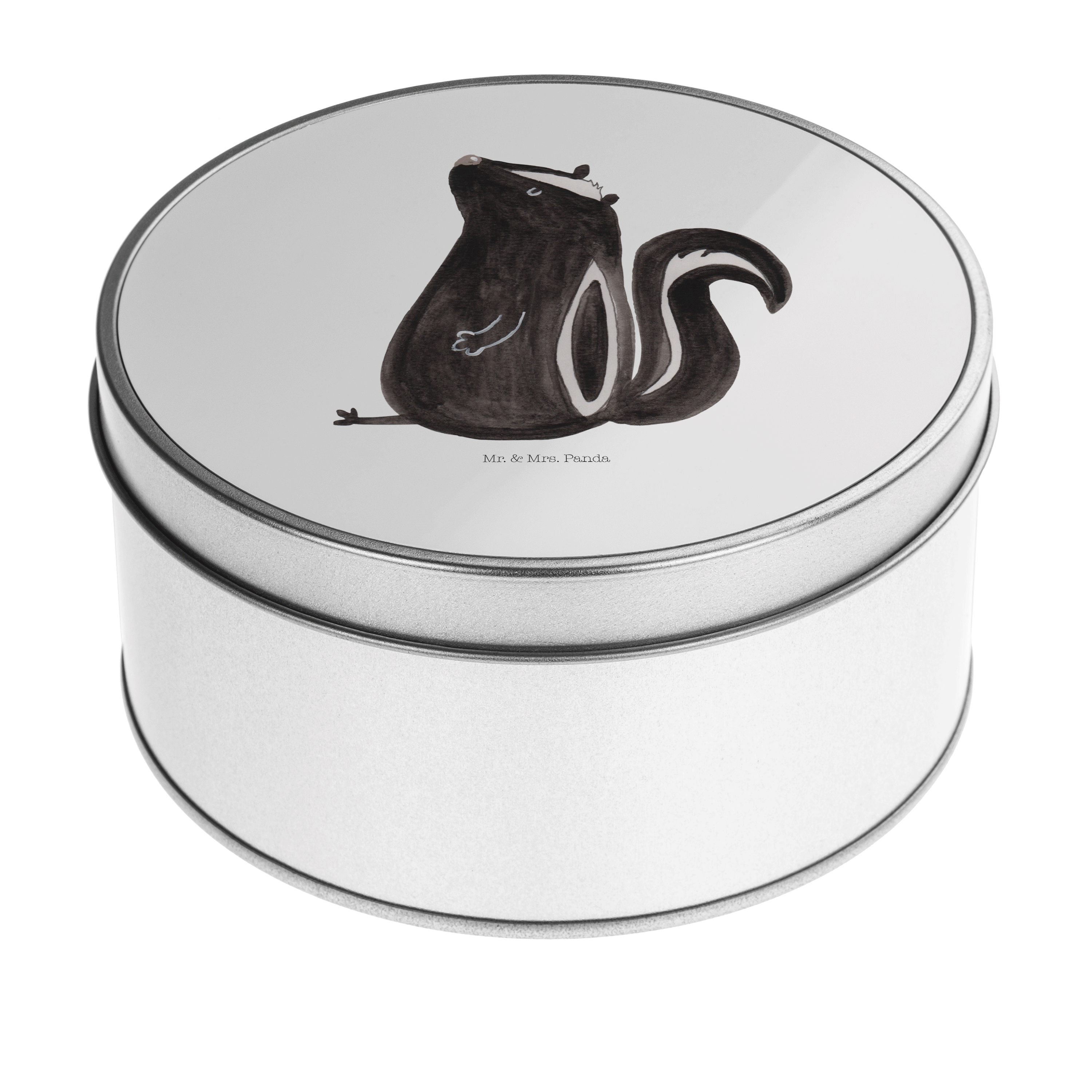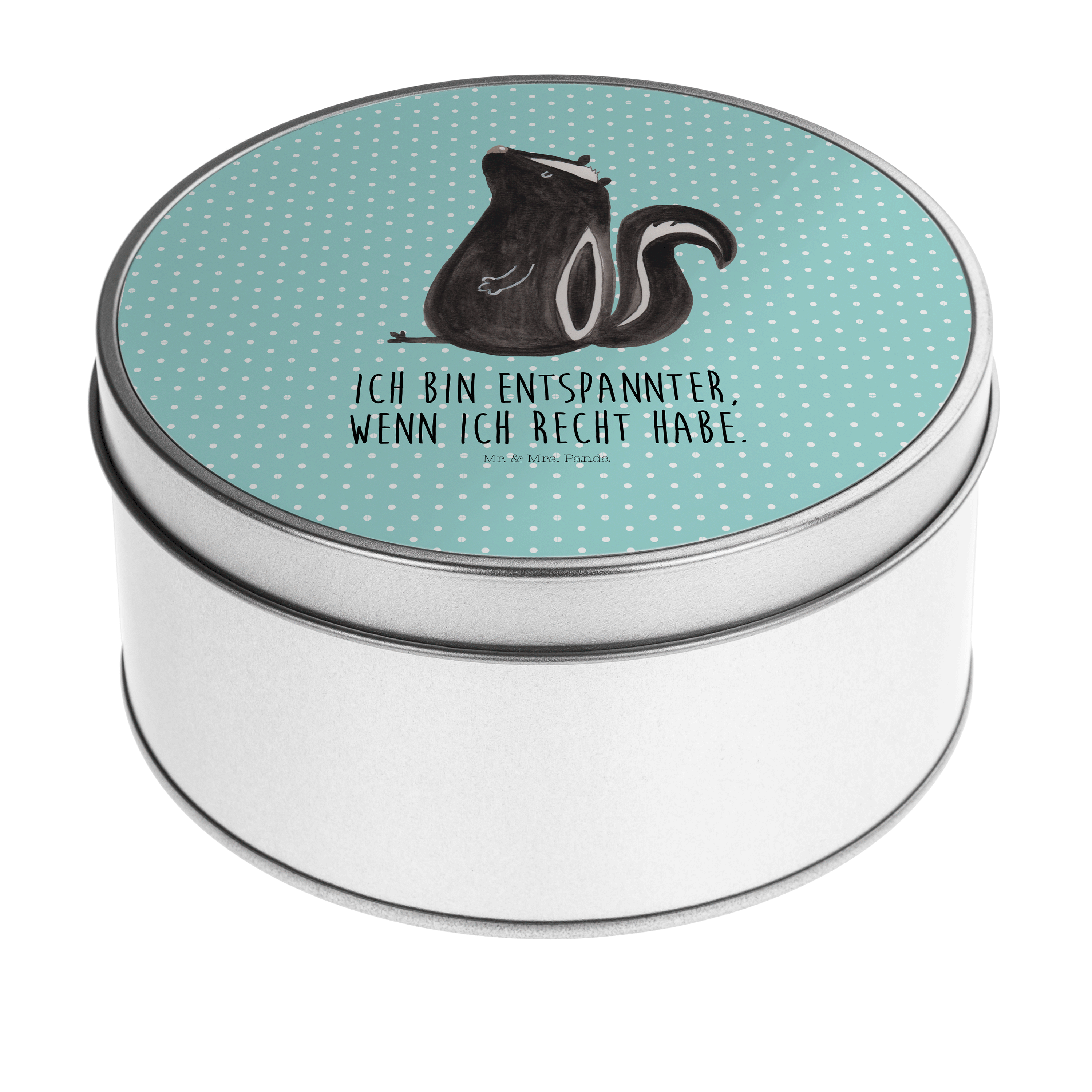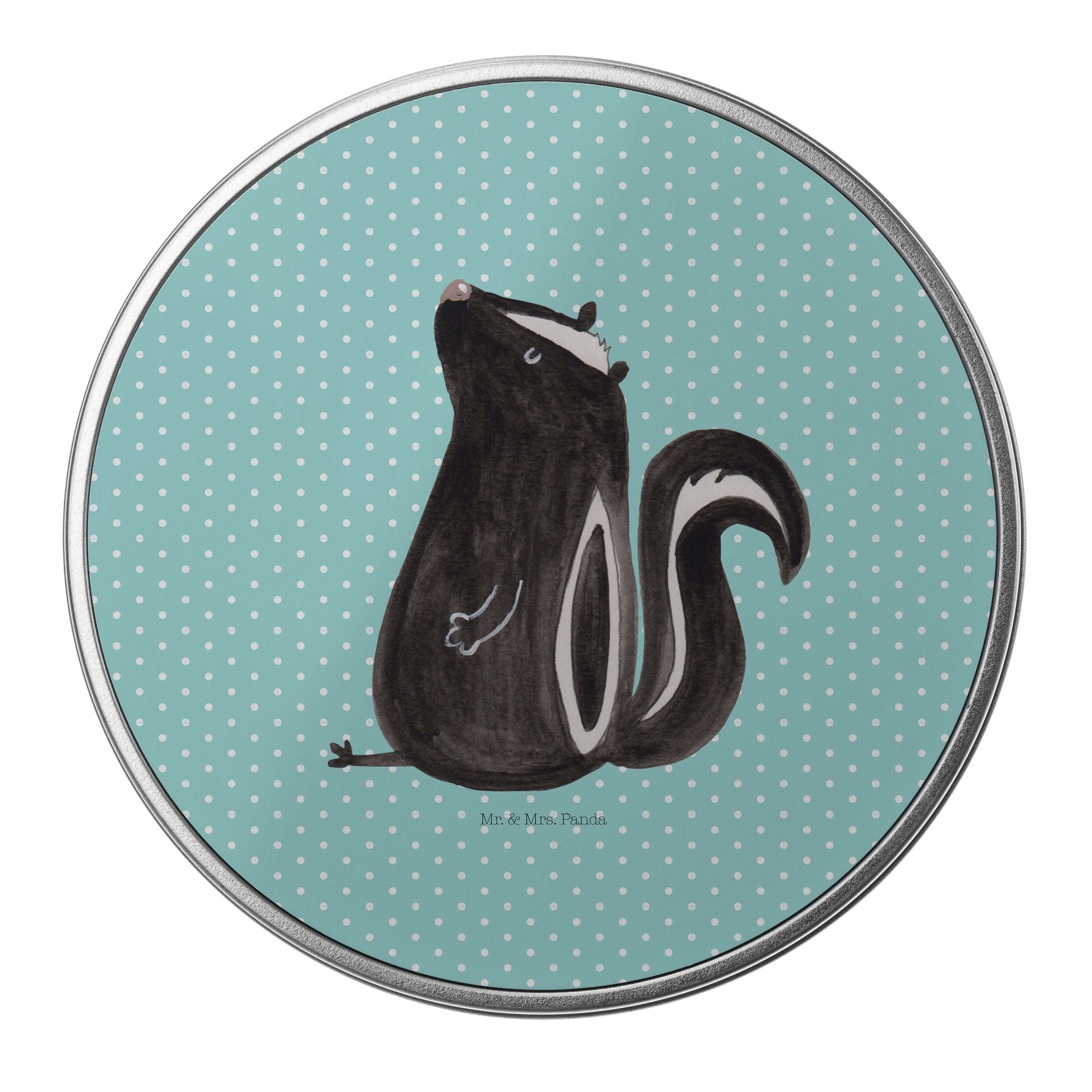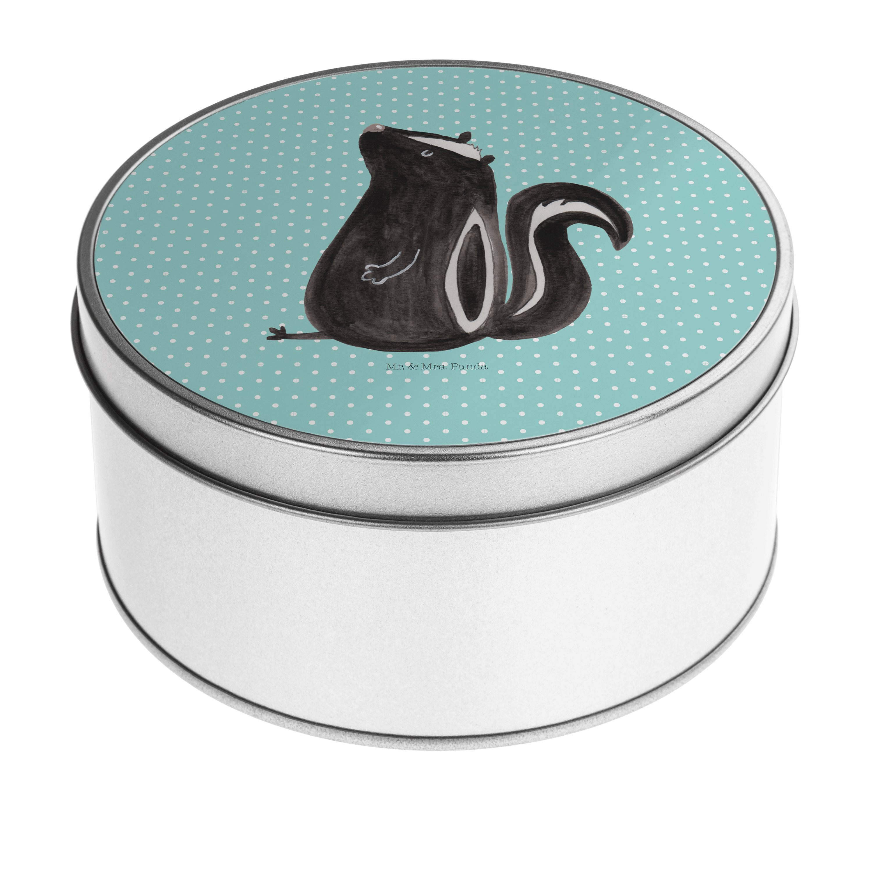 Blechdose rund Stinktier sitzend - mit Spruch - Türkis Pastell