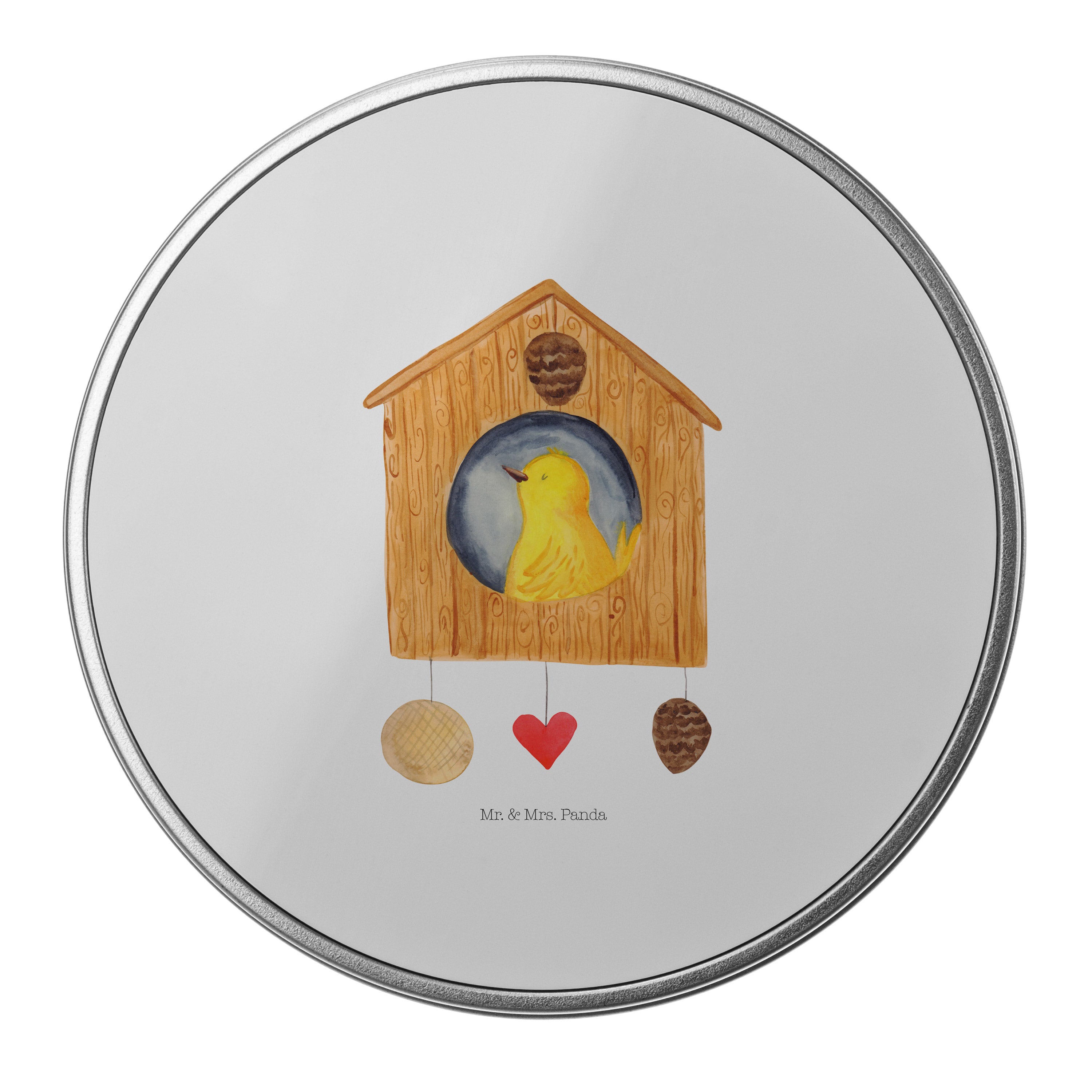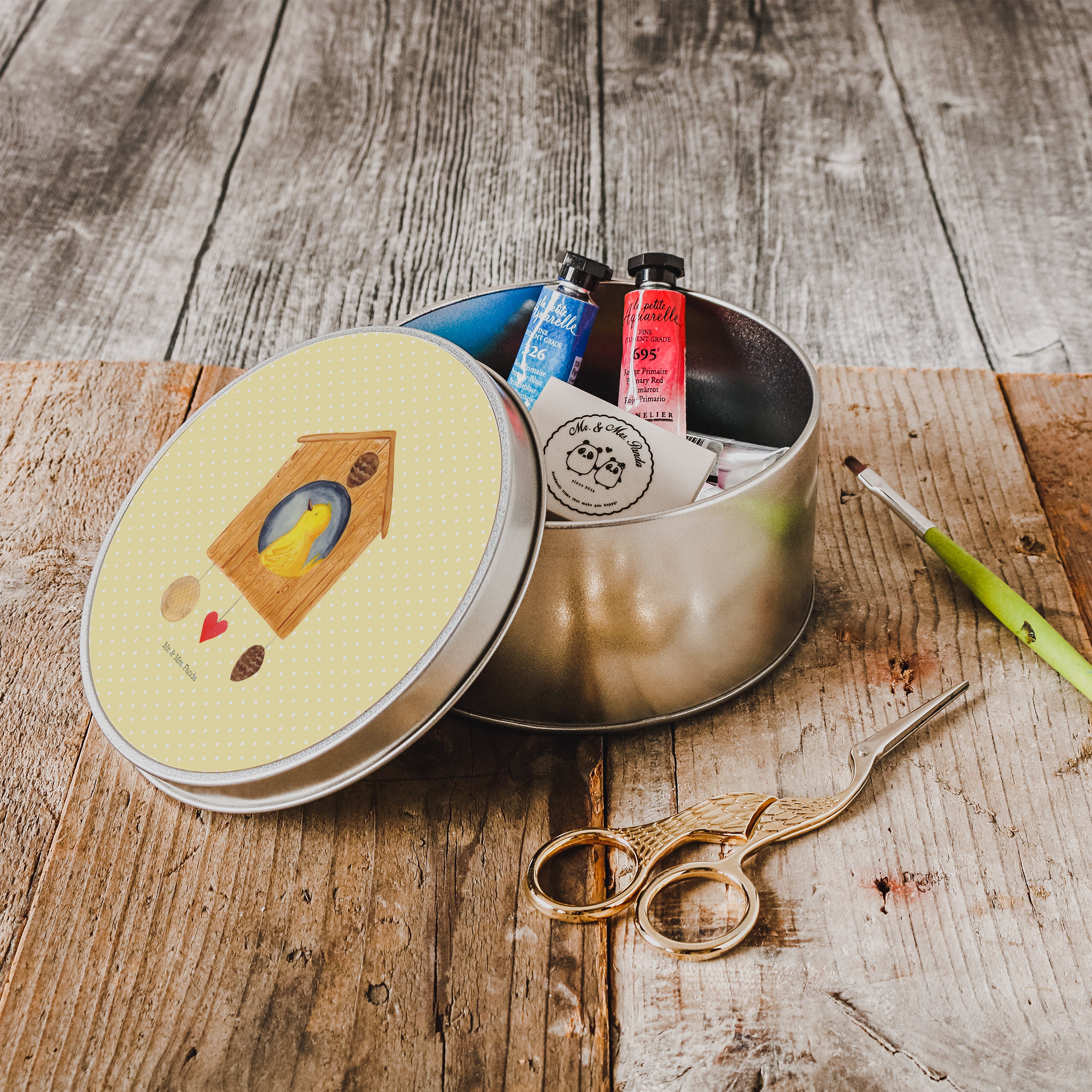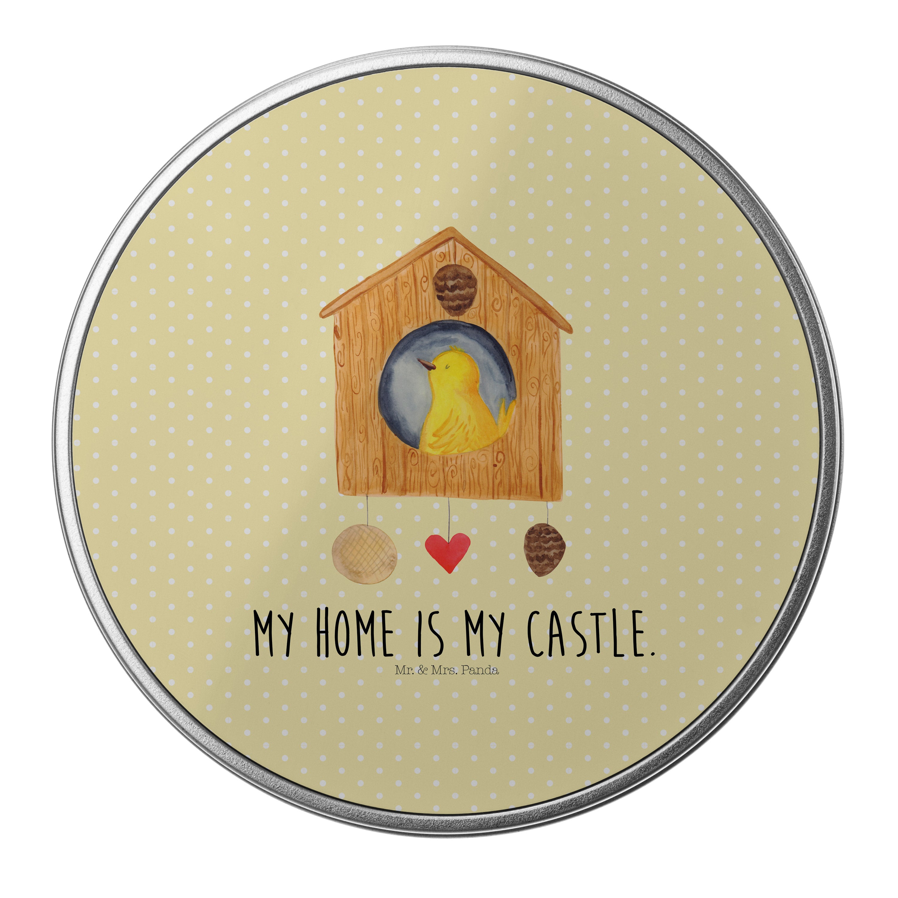 Blechdose rund Vogelhaus - mit Spruch - Gelb Pastell