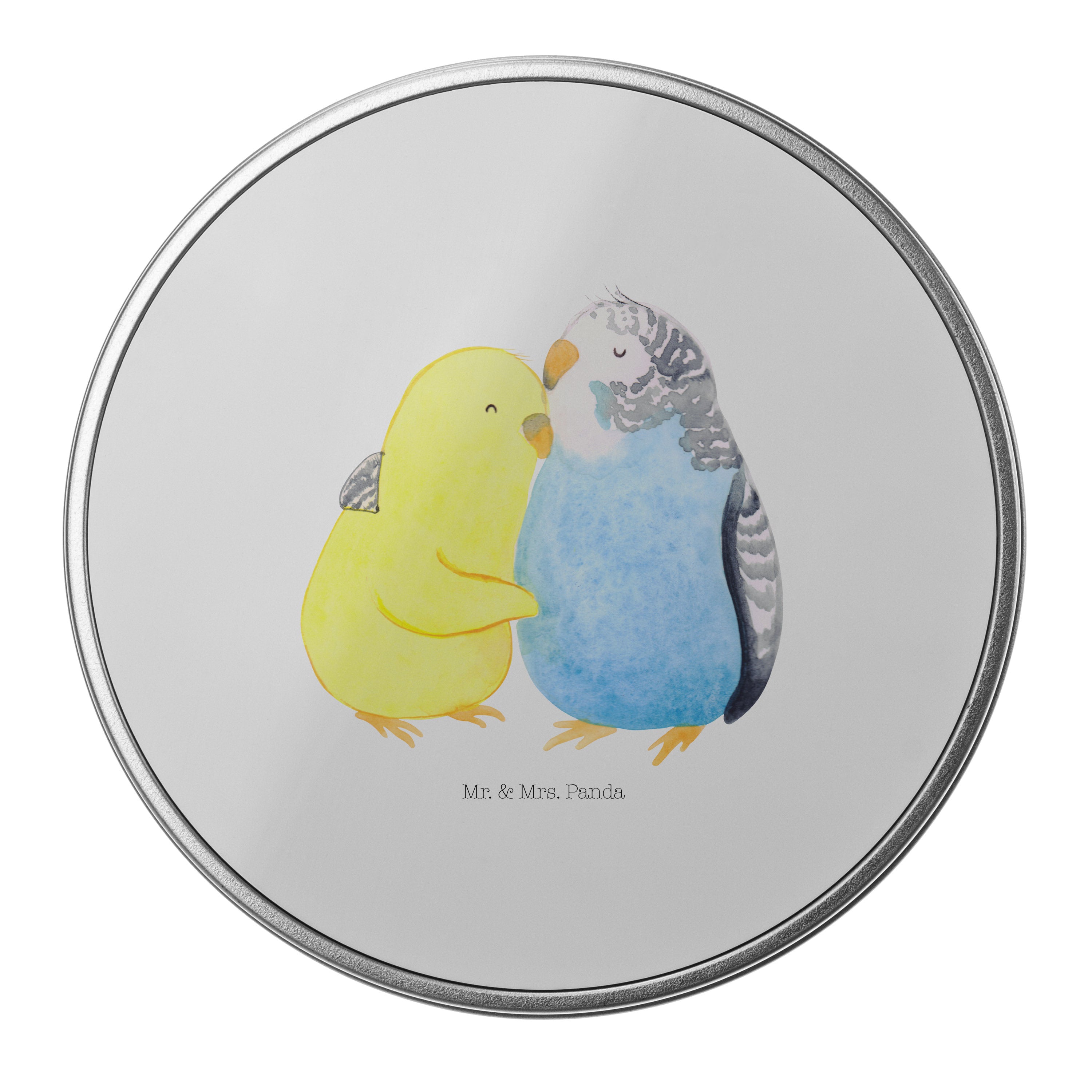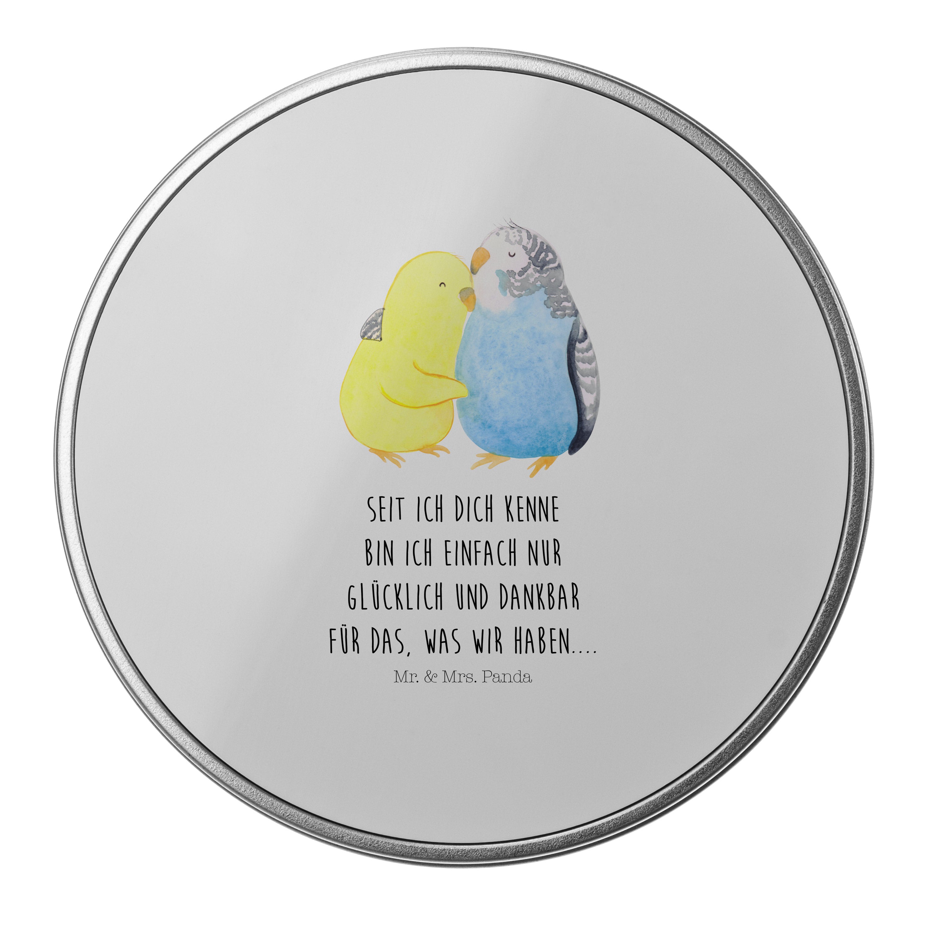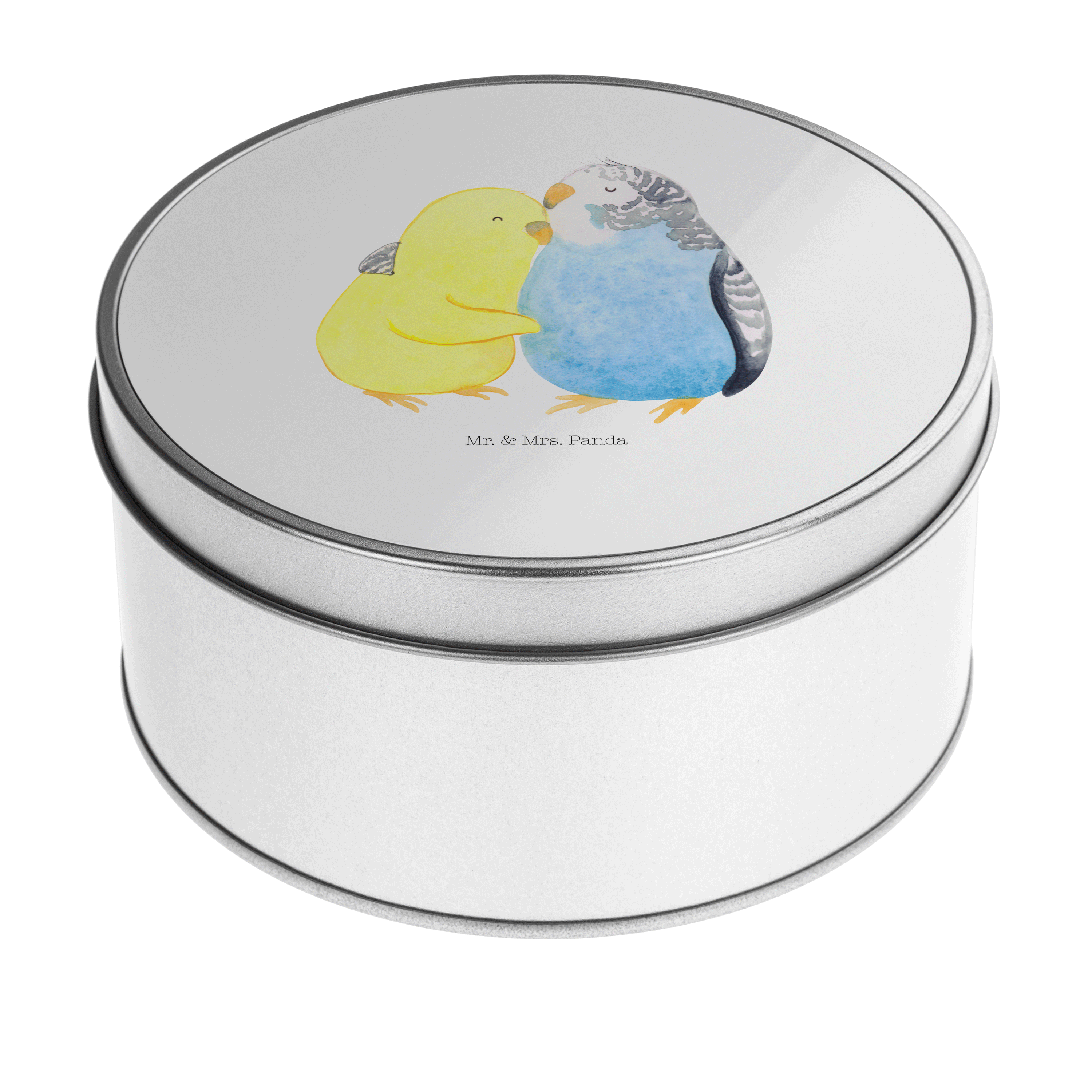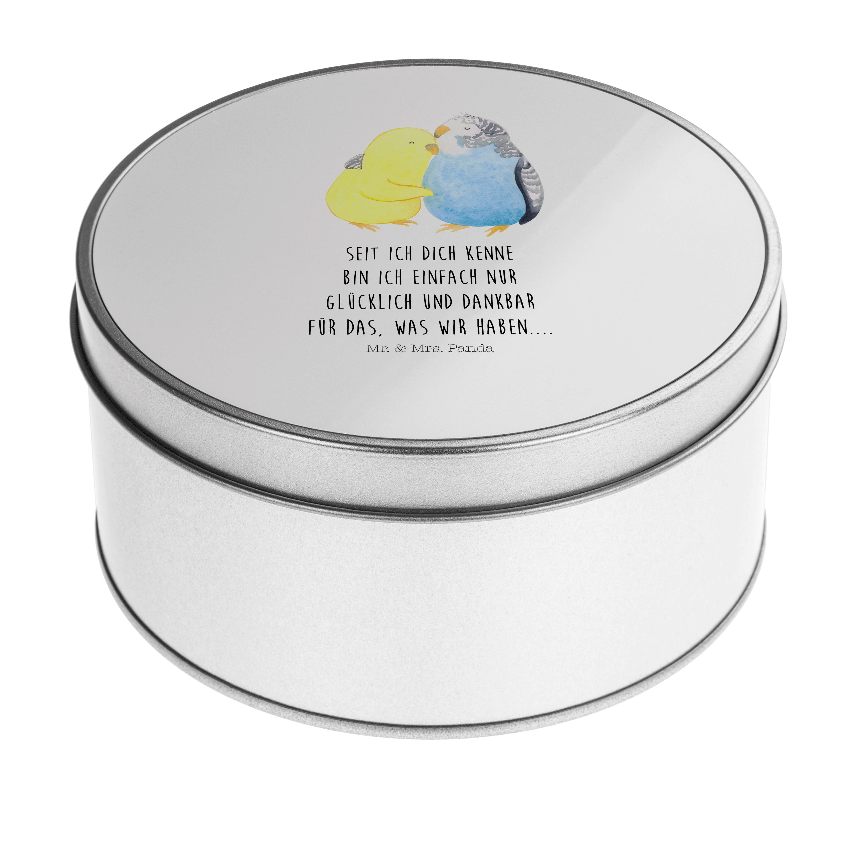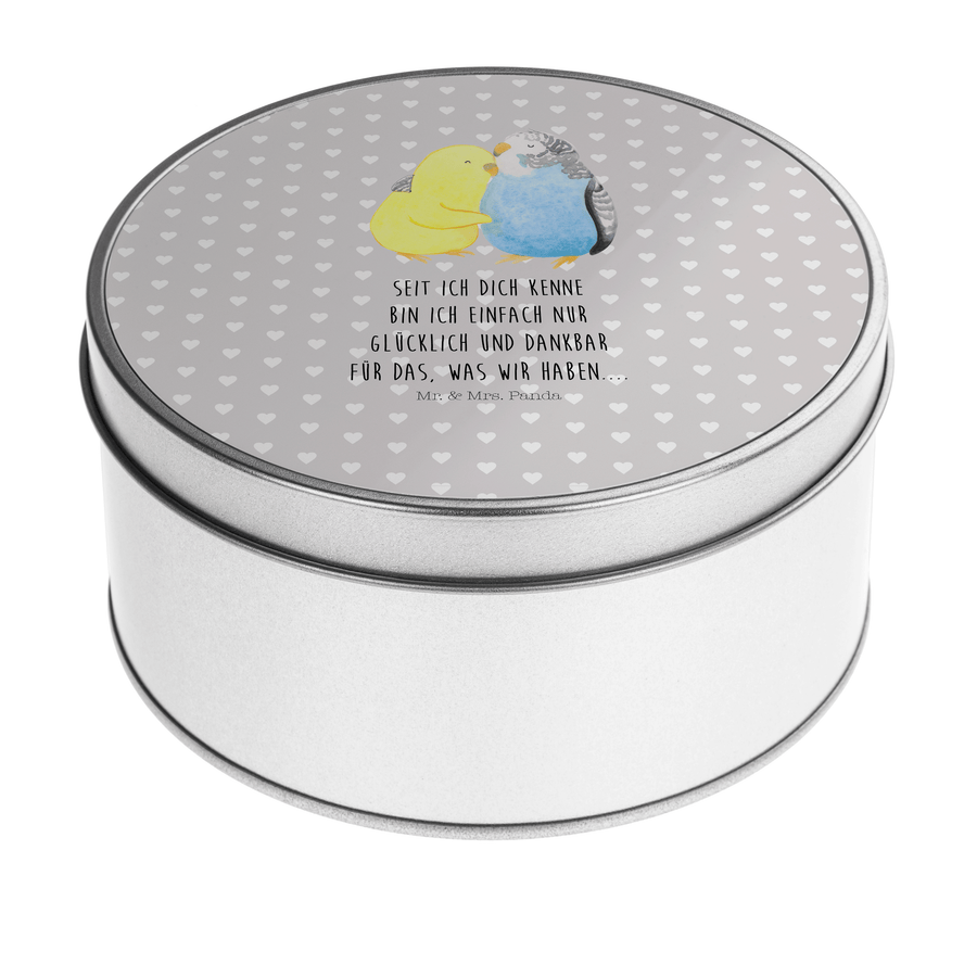 Blechdose rund Wellensittich Liebe - mit Spruch - Grau Pastell
