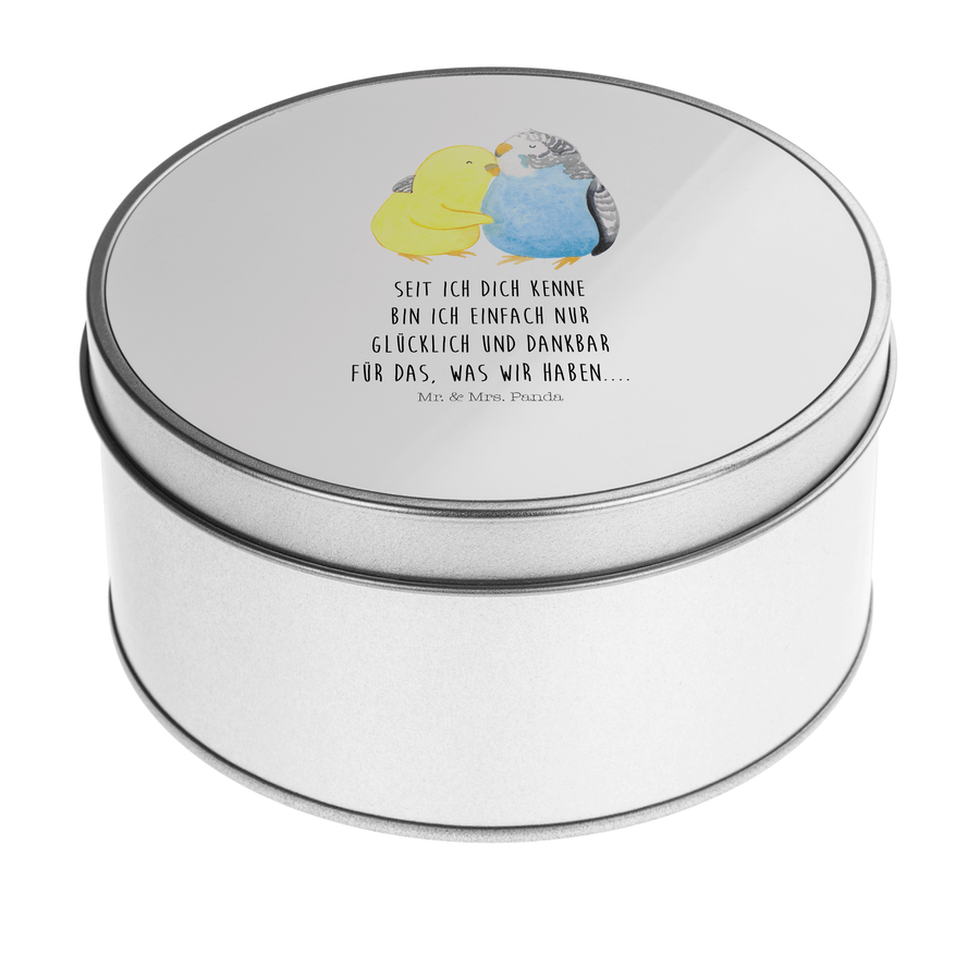 Blechdose rund Wellensittich Liebe - mit Spruch - Weiß