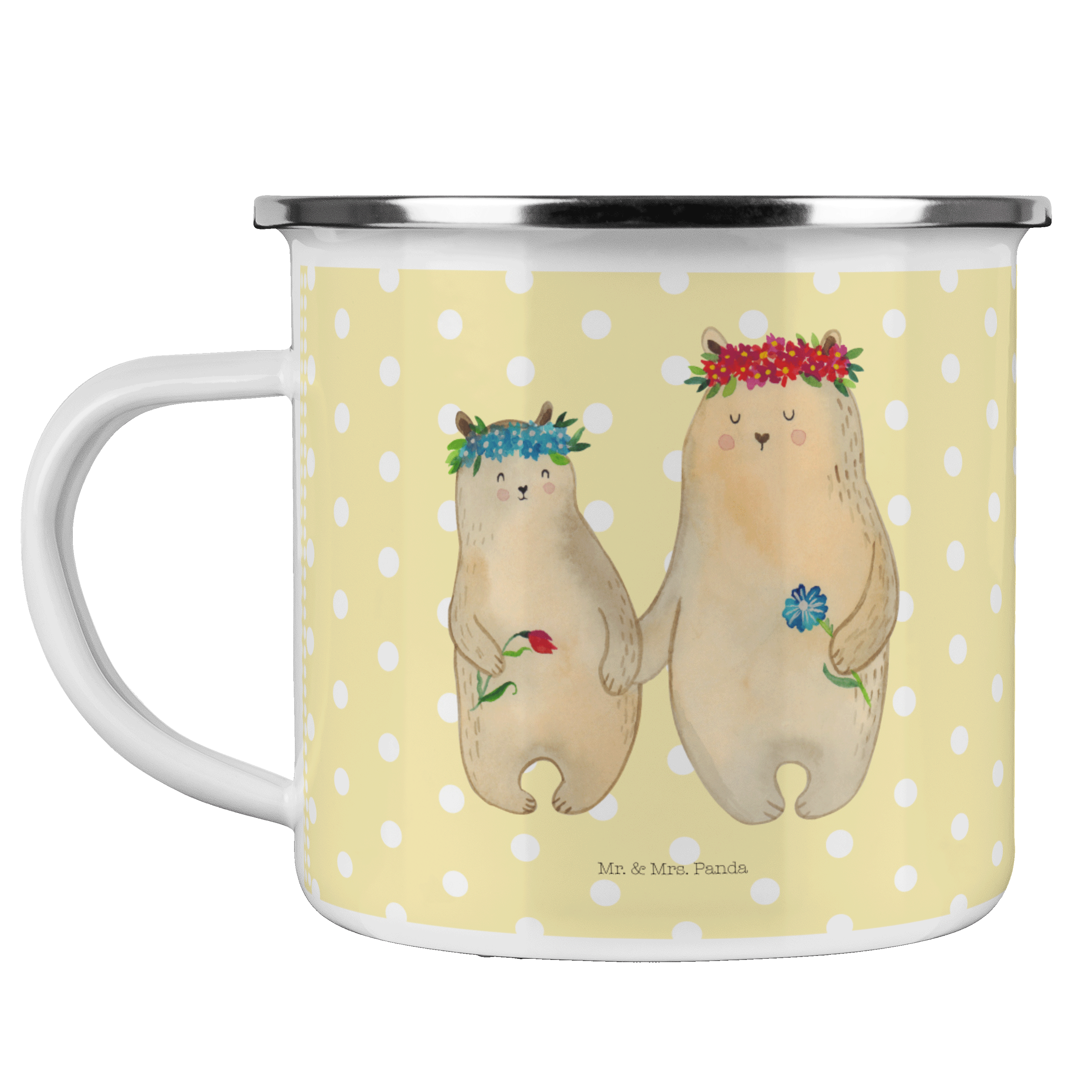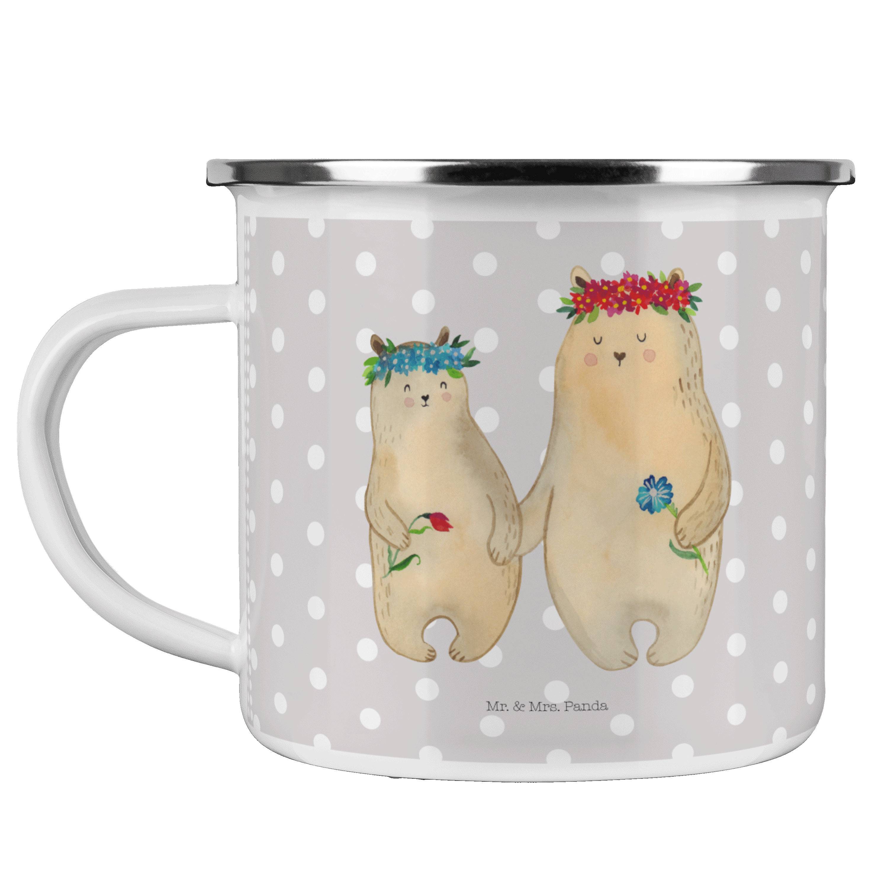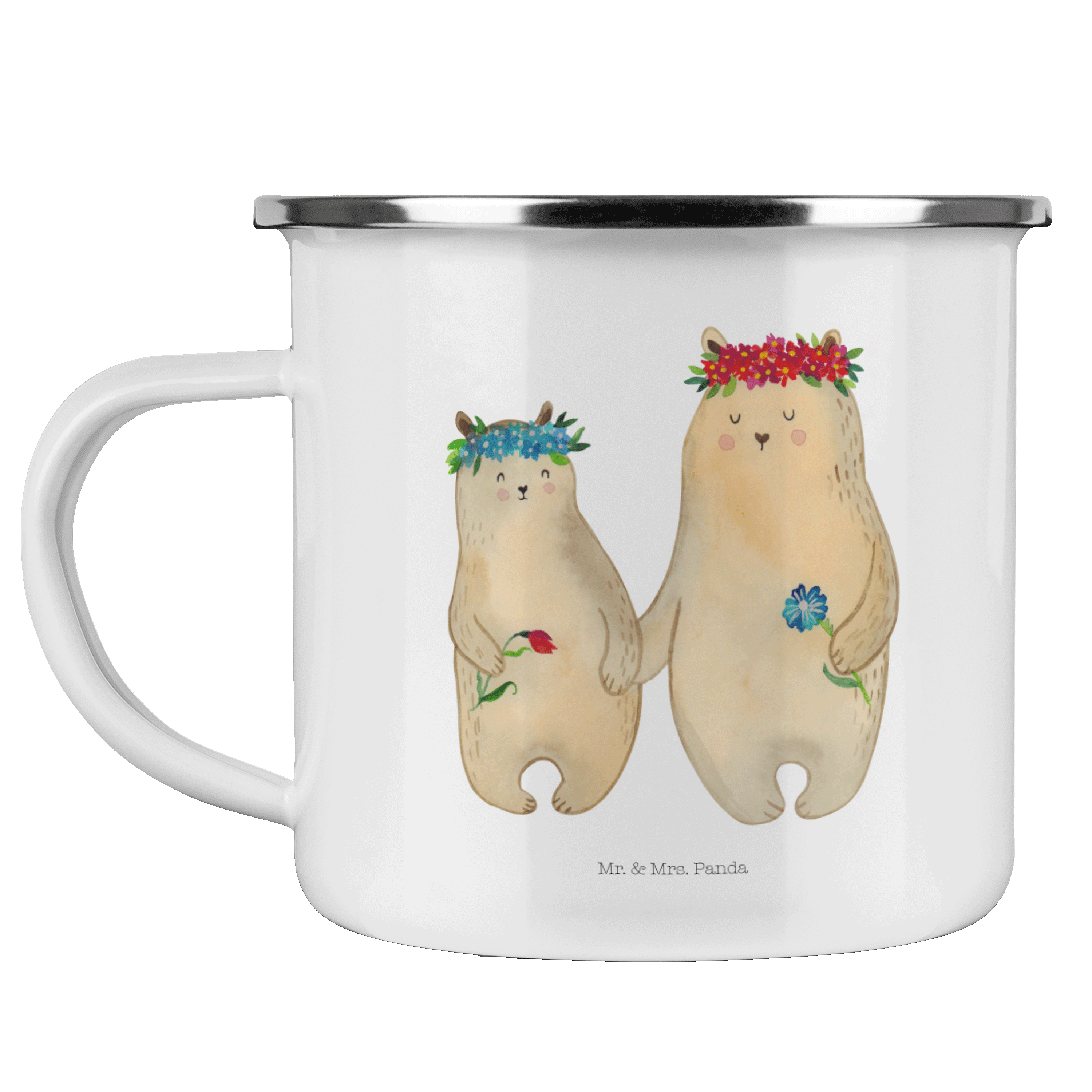 Camping Emaille Tasse Bären mit Blumenkranz - mit Spruch - Weiß