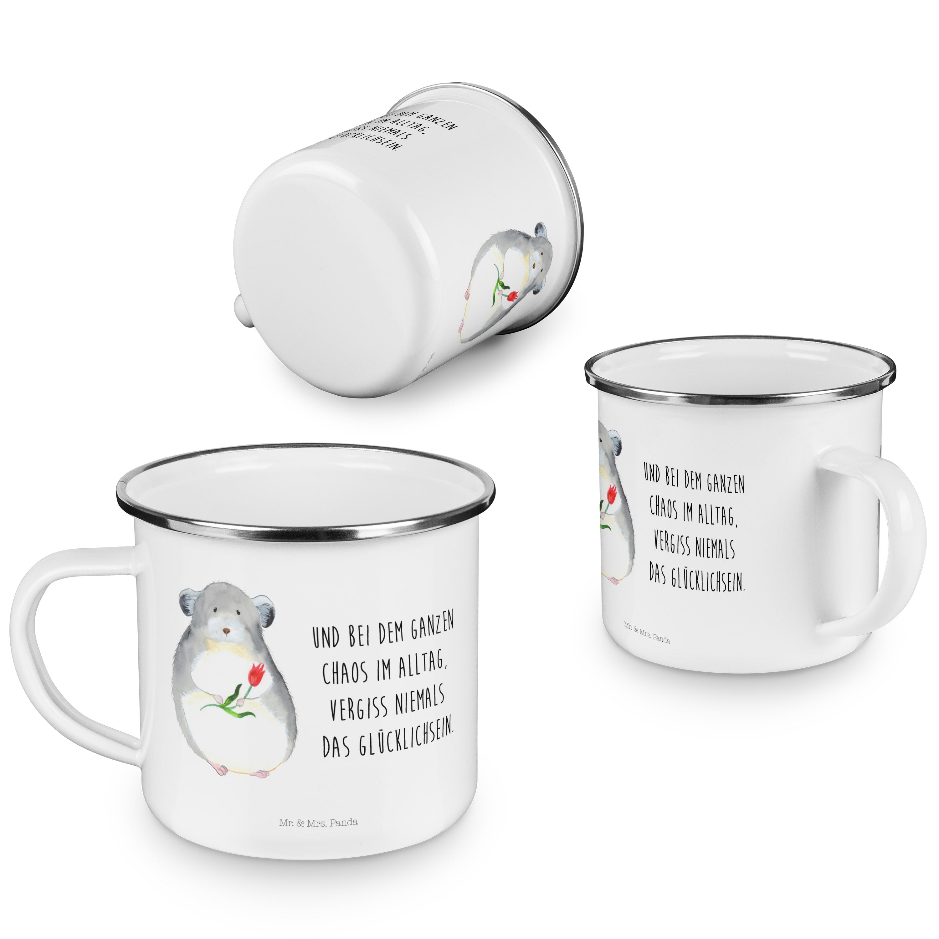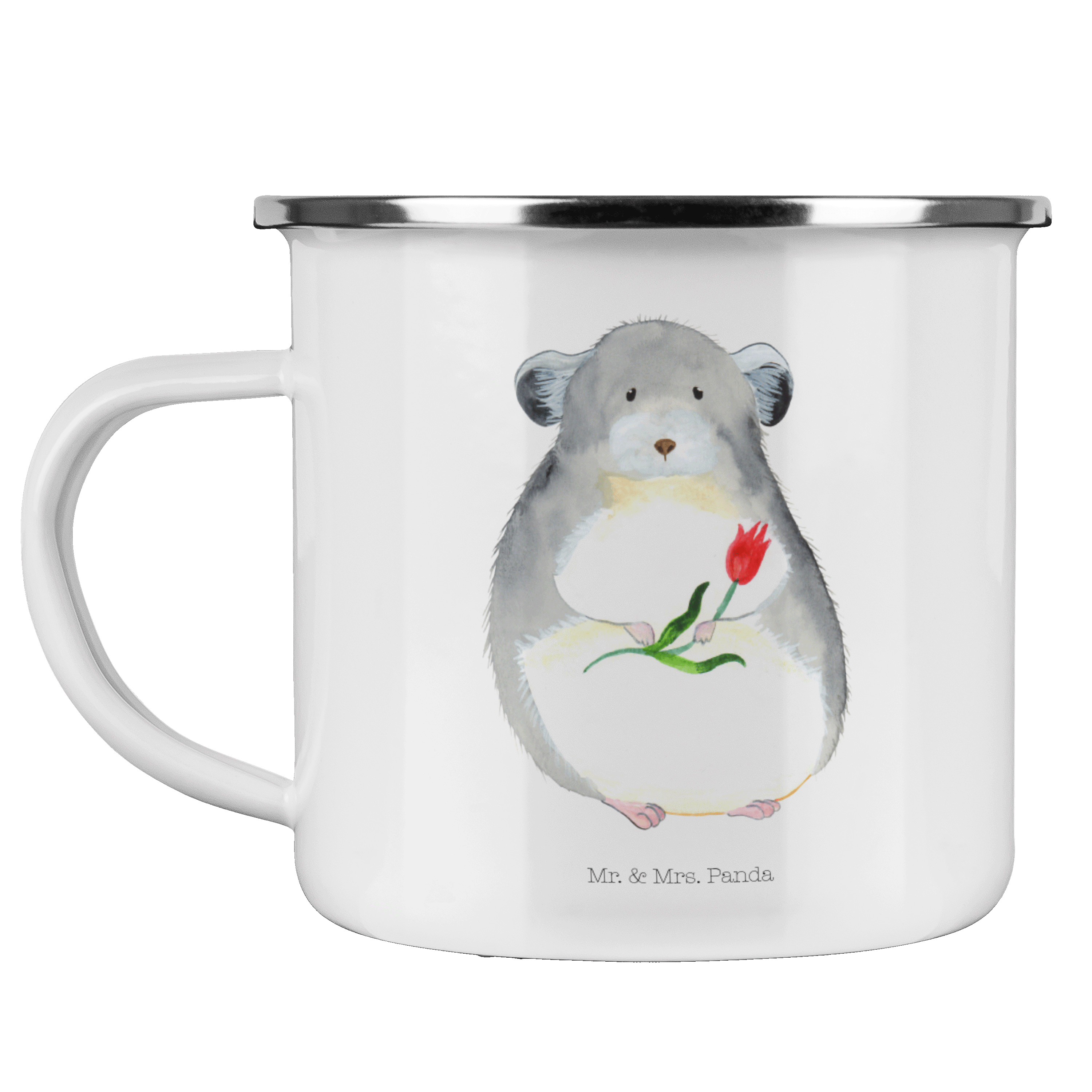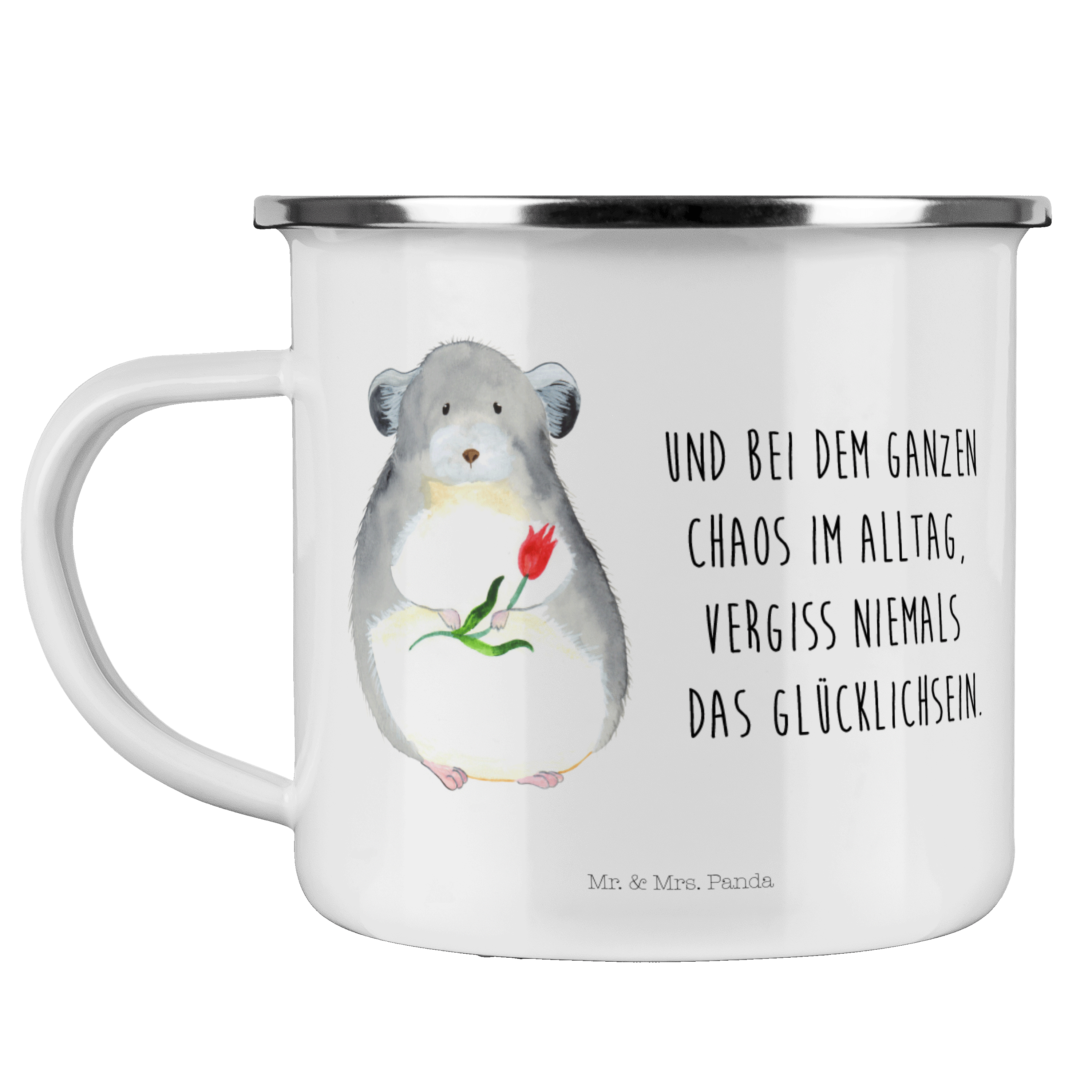 Camping Emaille Tasse Chinchilla mit Blume - mit Spruch - Weiß