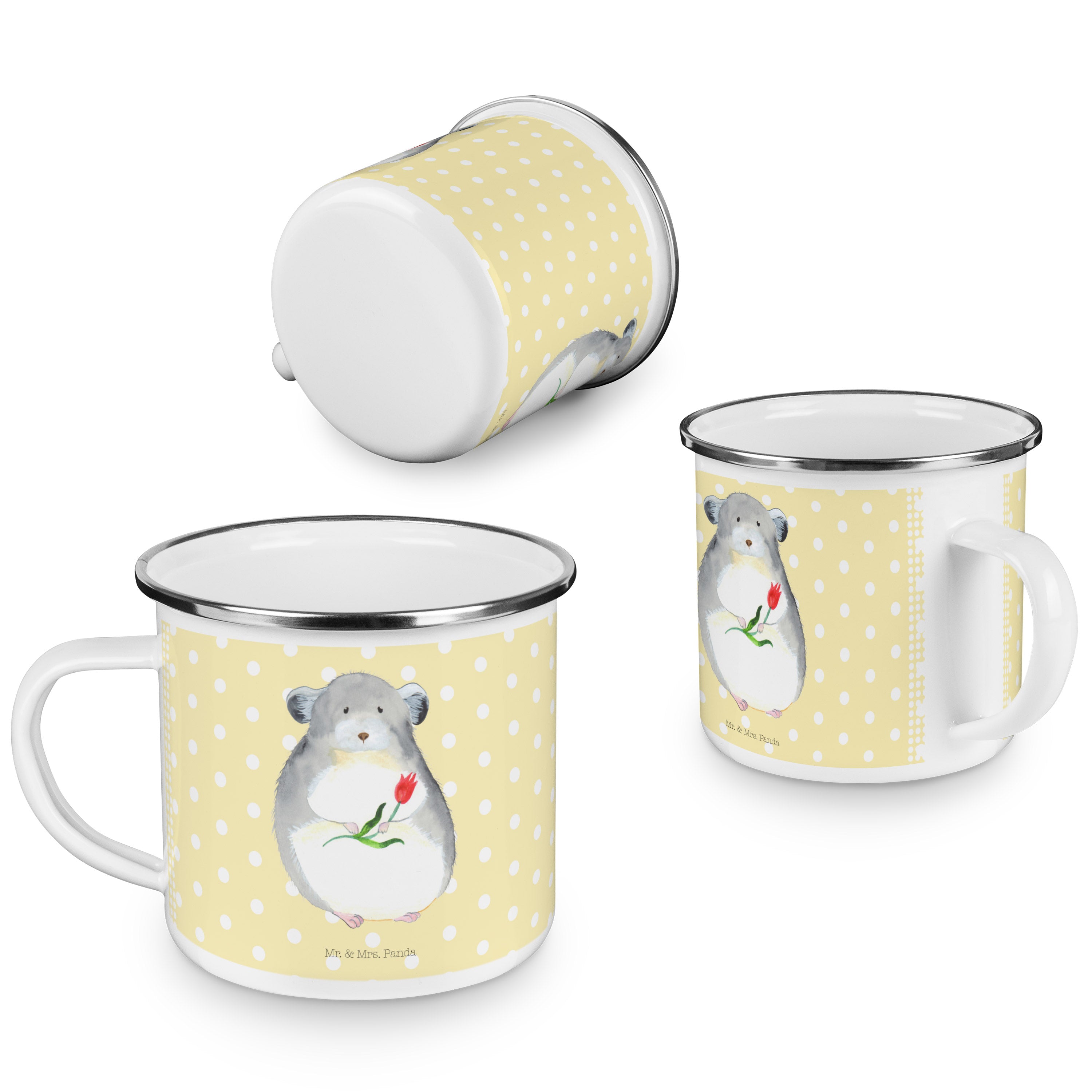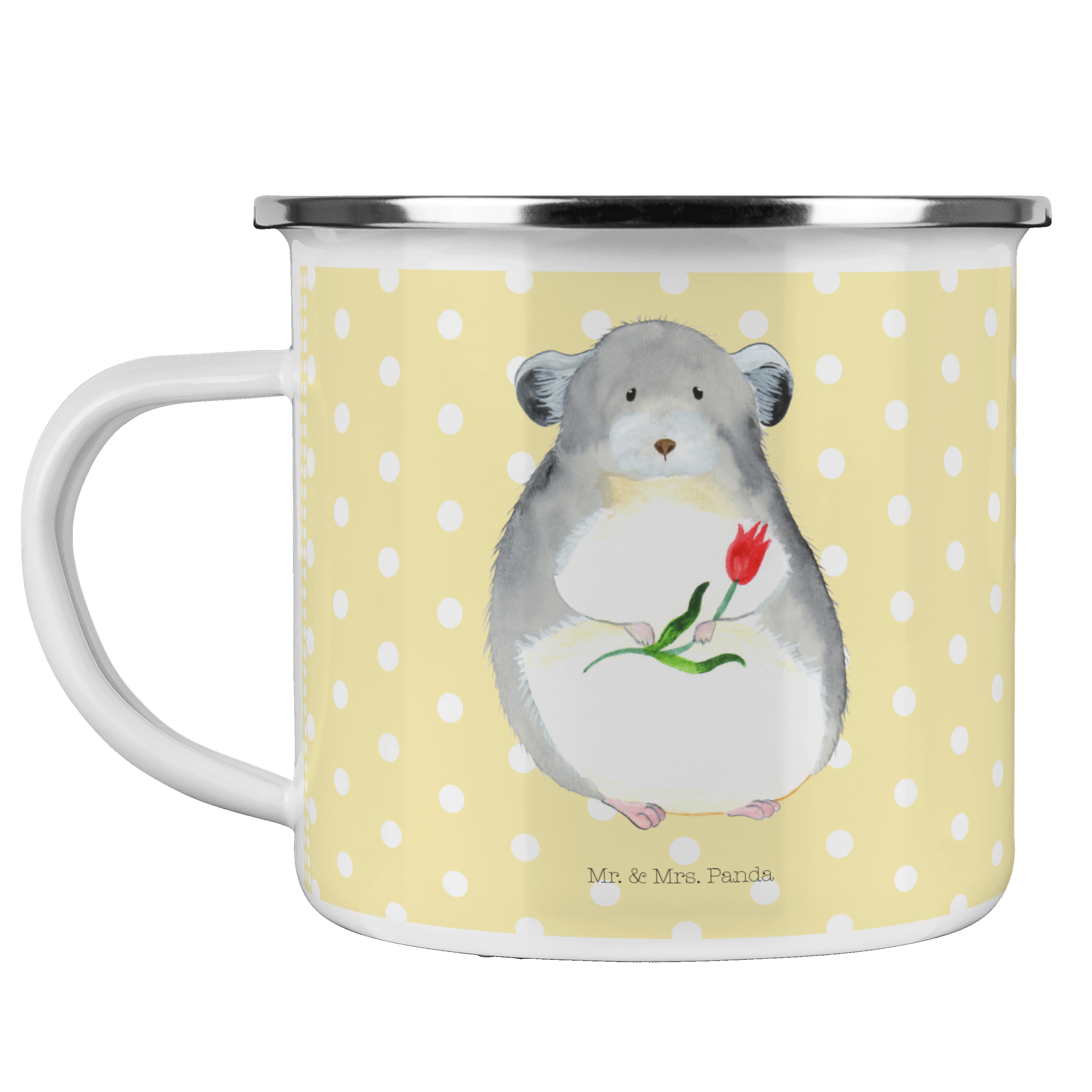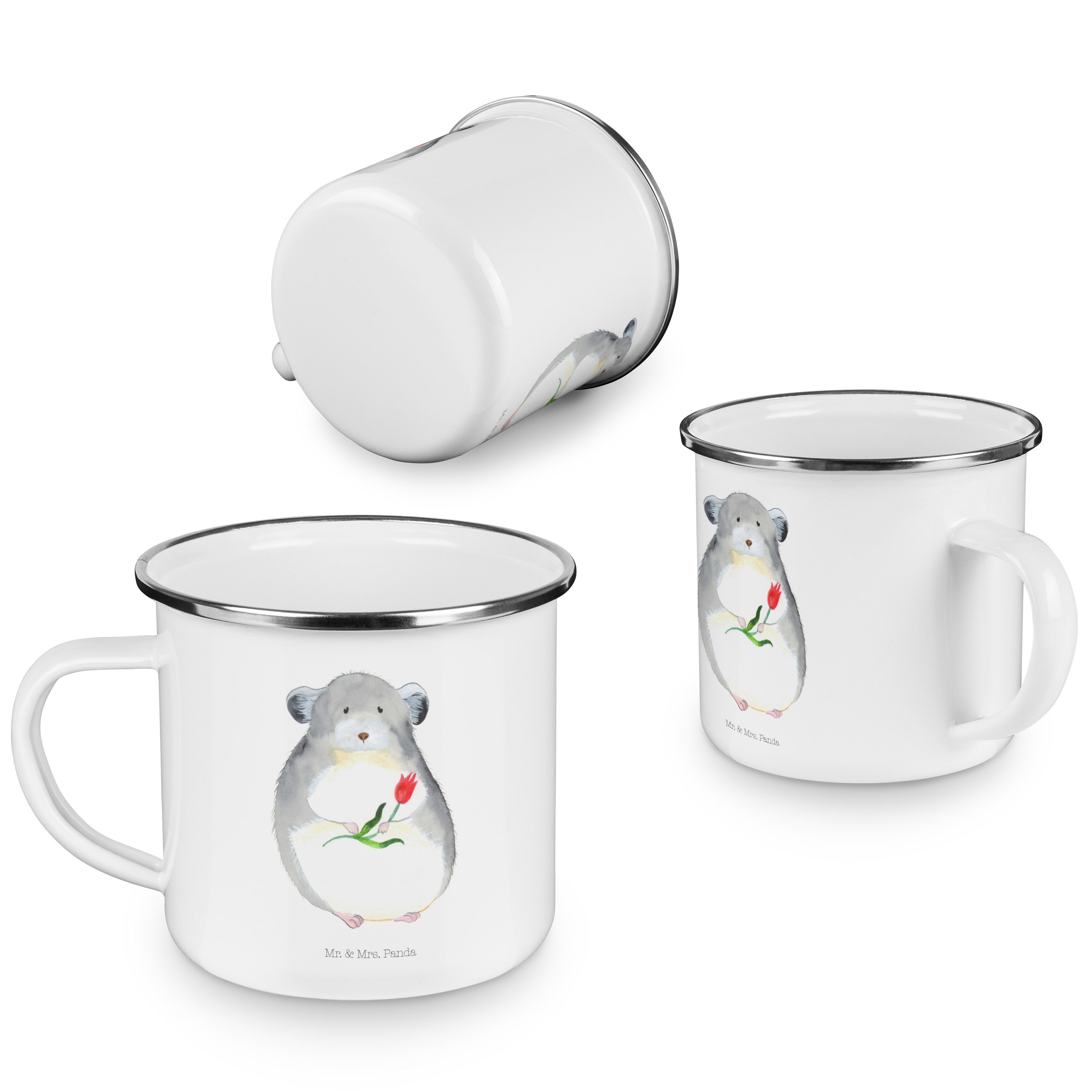 Camping Emaille Tasse Chinchilla mit Blume - mit Spruch - Weiß