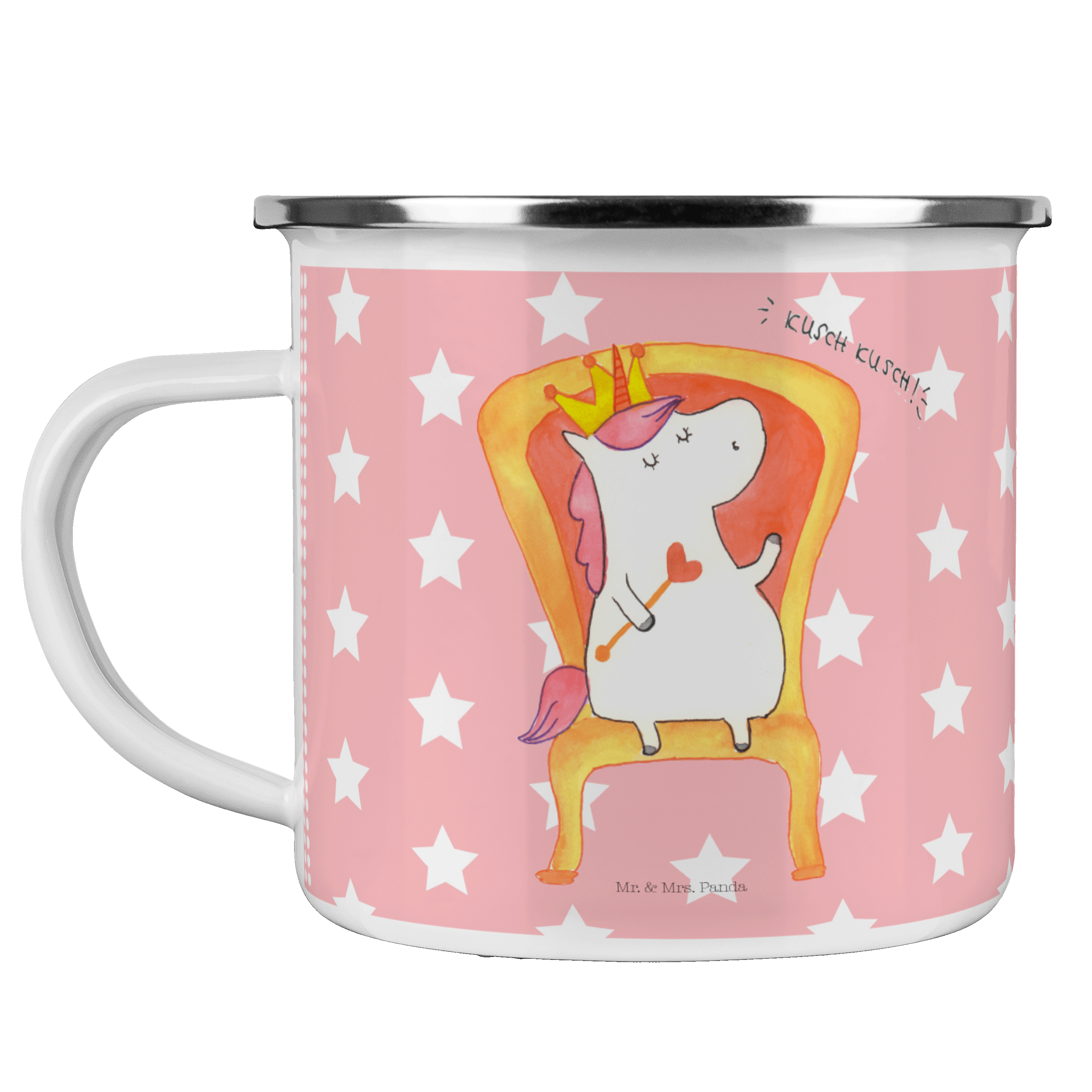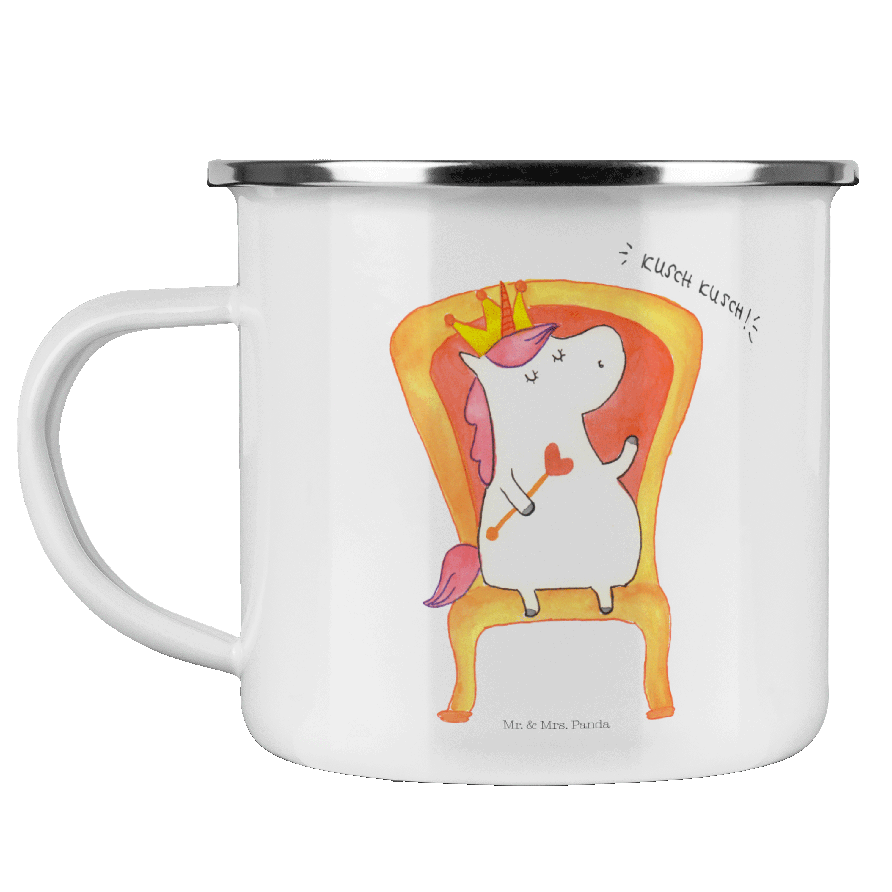 Diese wunderschöne Emailletasse von Mr. & Mrs. Panda mit abgesetztem Edelstahl Rand in Emaille Optik ist der perfekte, bruchsichere Begleiter für dein nächstes Abenteuer. Das Füllvolumen des Bechers beträgt 300 ml. So sind die Motivtassen ideal beim Camping als Campingbecher einsetzbar.