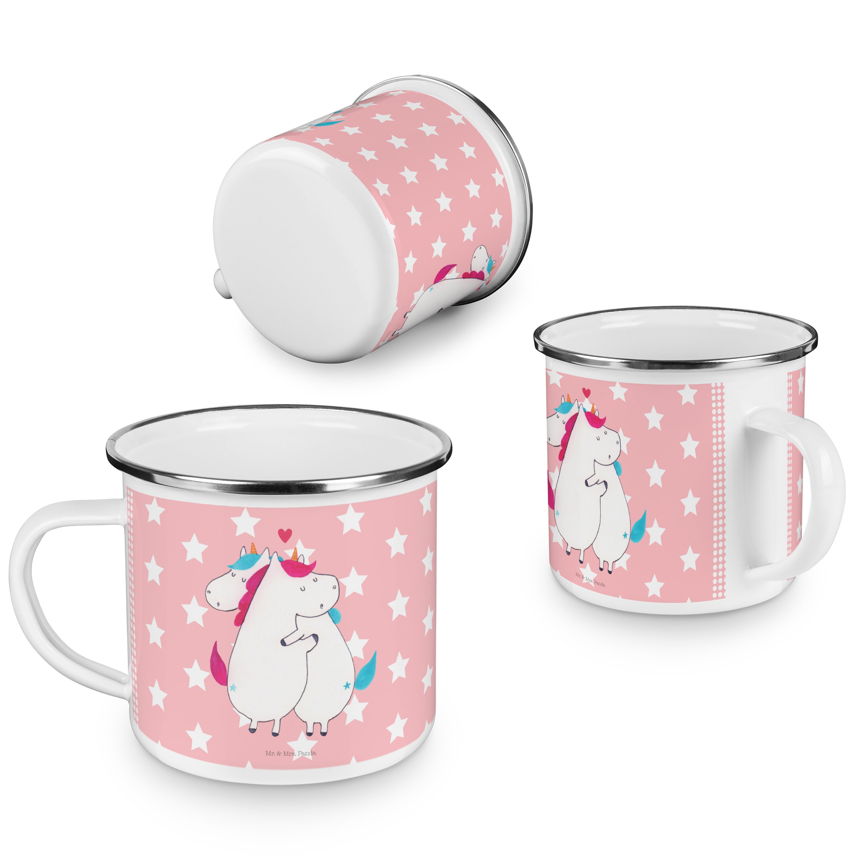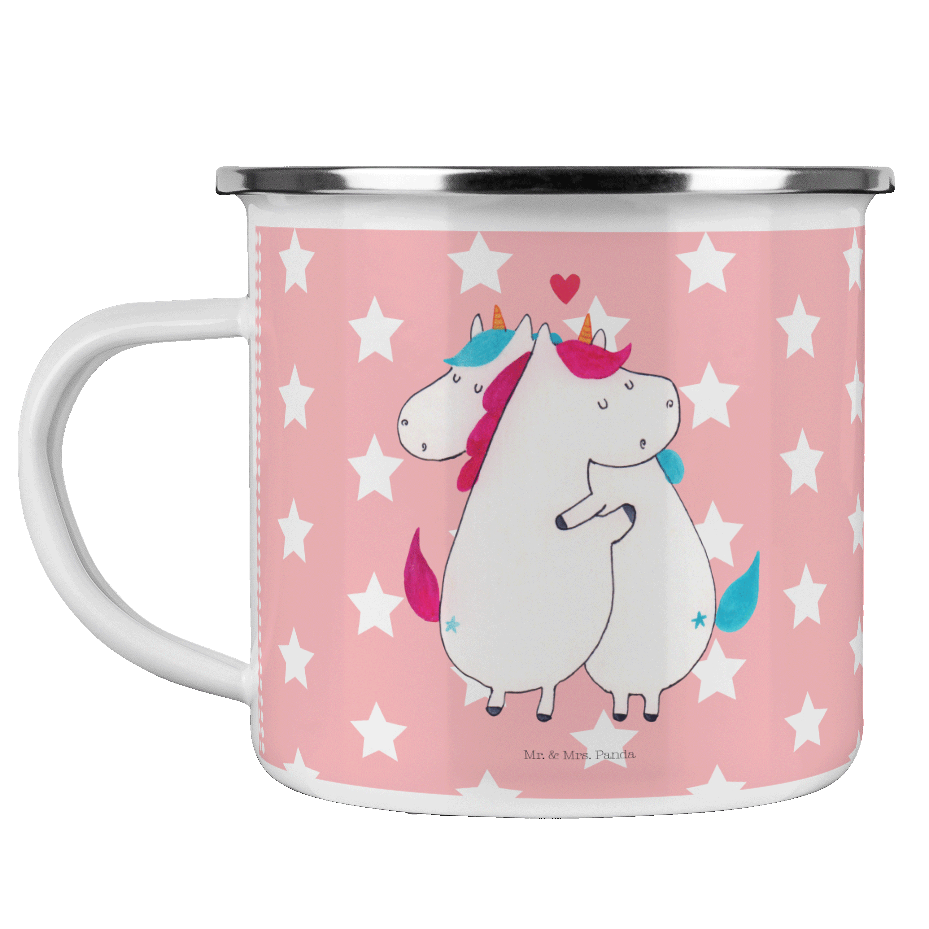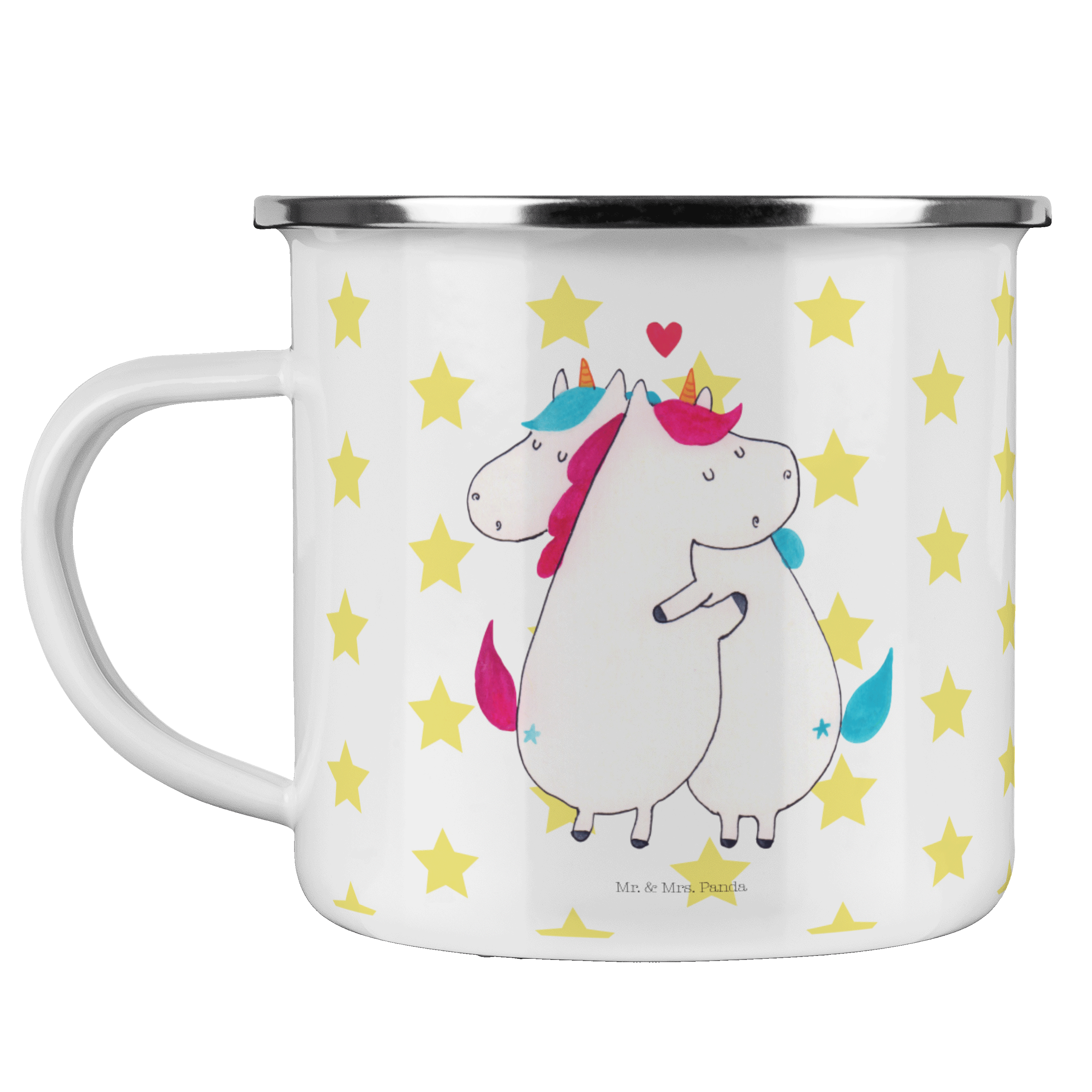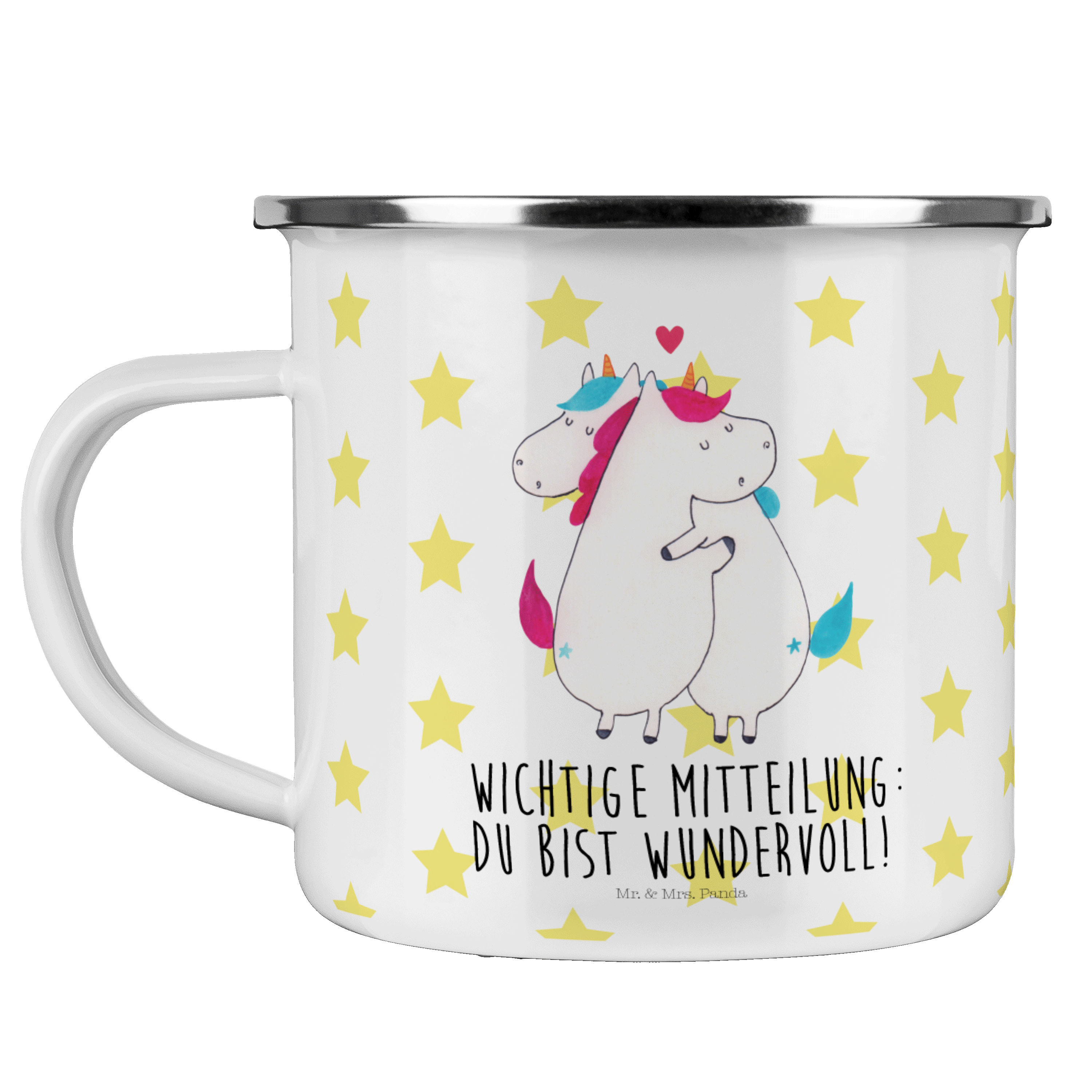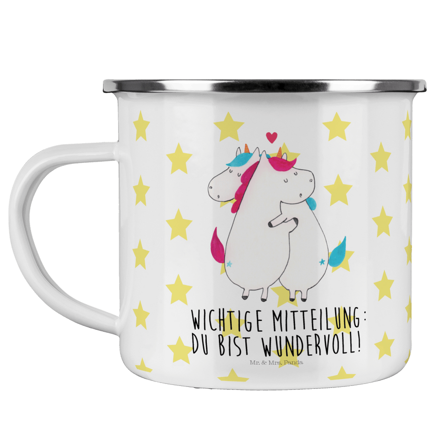 Diese wunderschöne Emailletasse von Mr. & Mrs. Panda mit abgesetztem Edelstahl Rand in Emaille Optik ist der perfekte, bruchsichere Begleiter für dein nächstes Abenteuer. Das Füllvolumen des Bechers beträgt 300 ml. So sind die Motivtassen ideal beim Camping als Campingbecher einsetzbar.