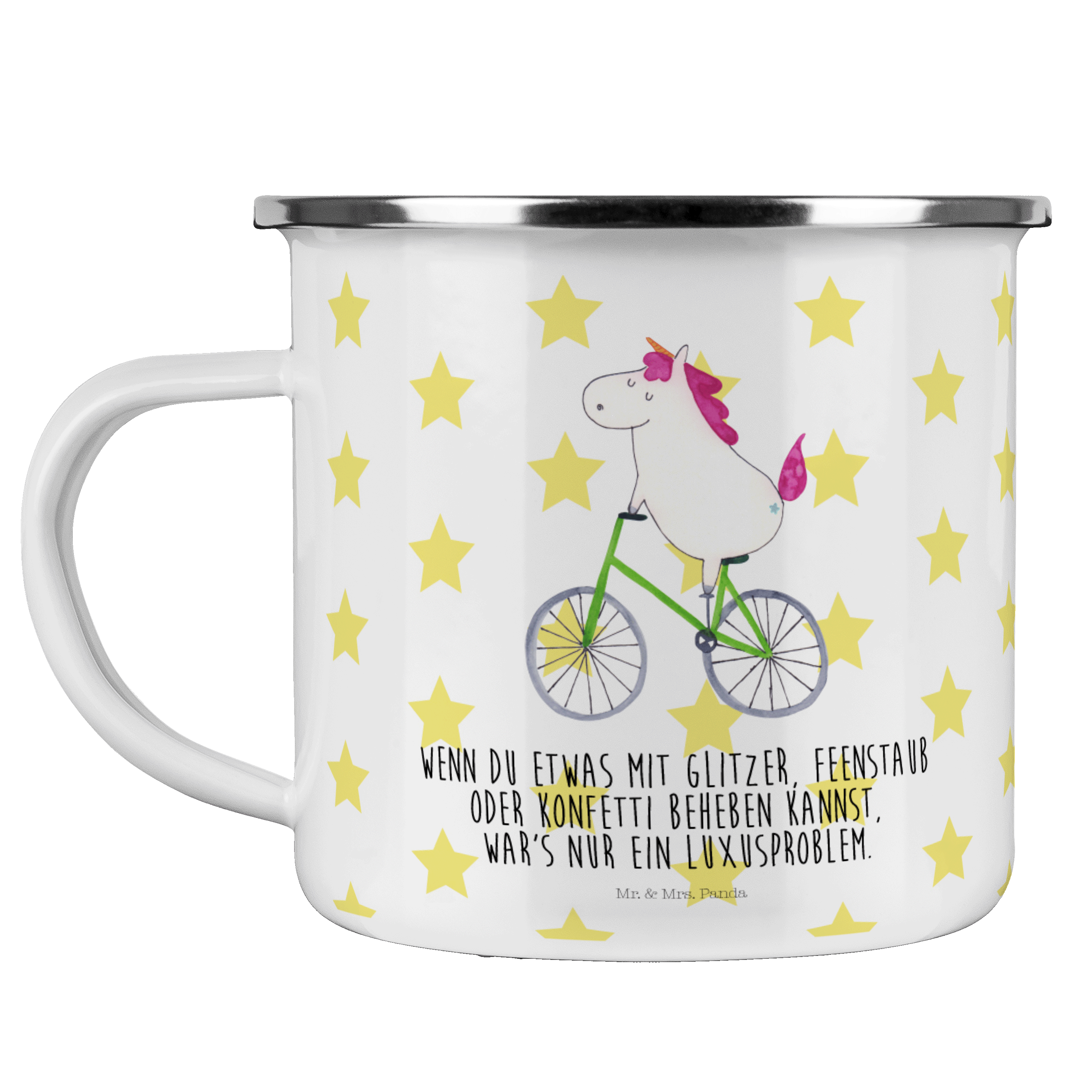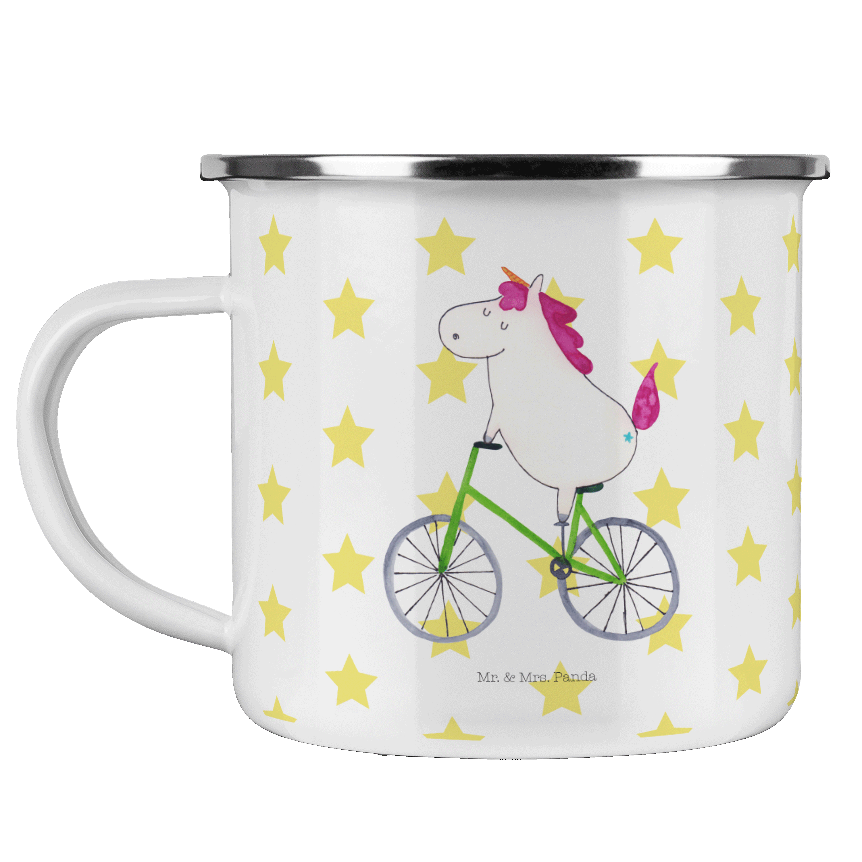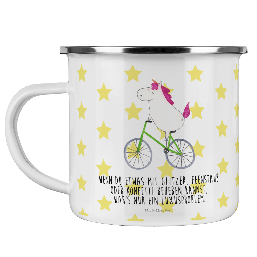 Camping Emaille Tasse Einhorn Radfahrer - mit Spruch - Weiß