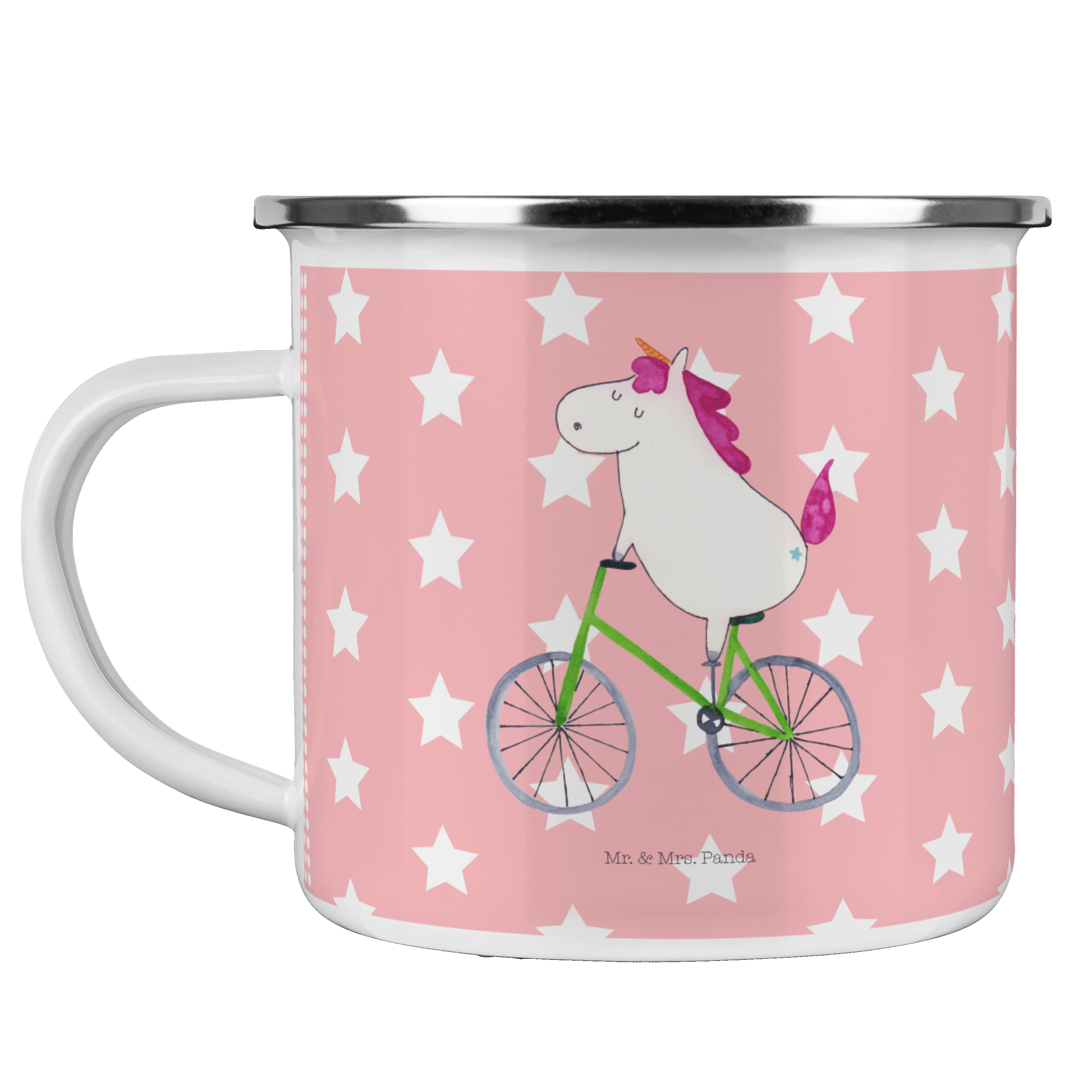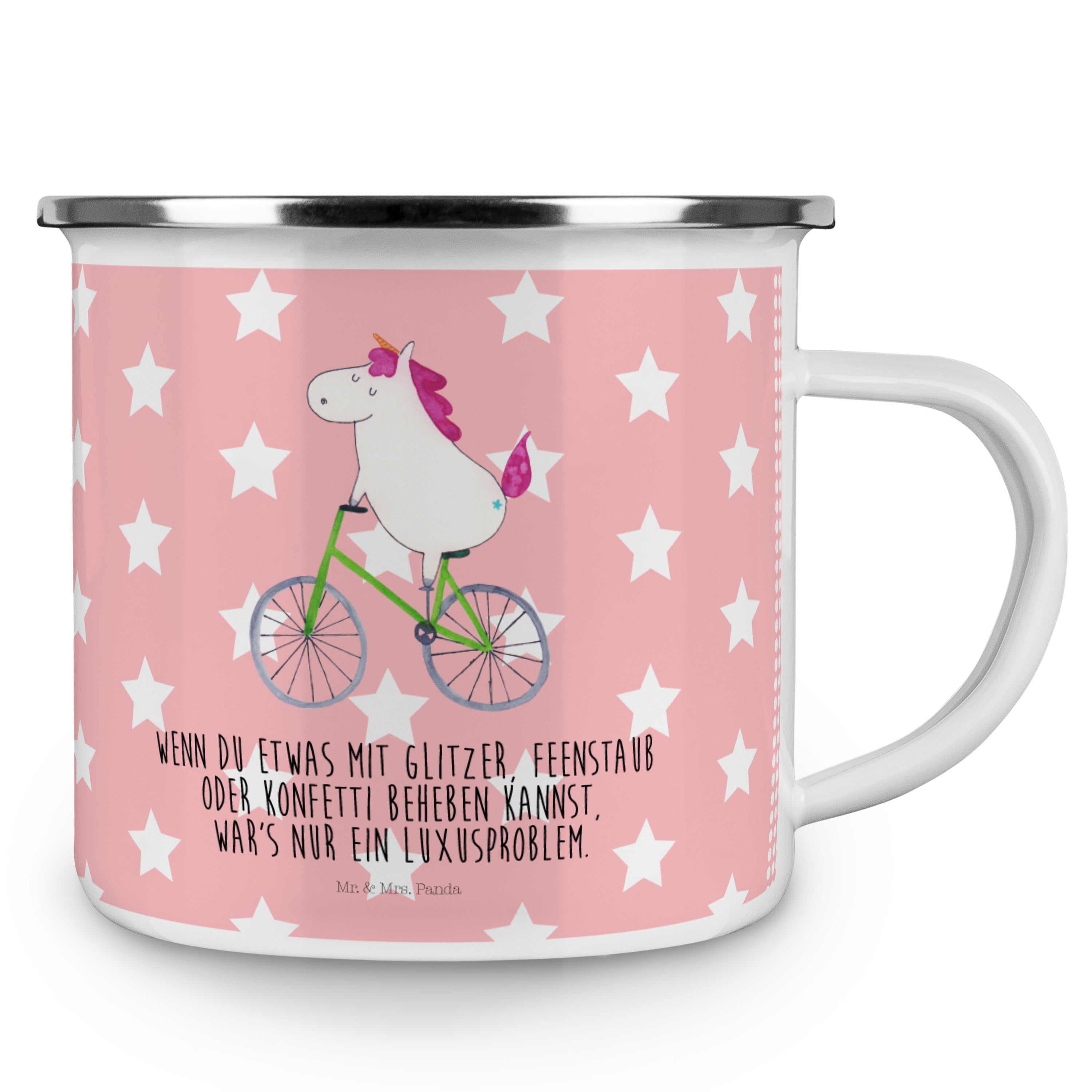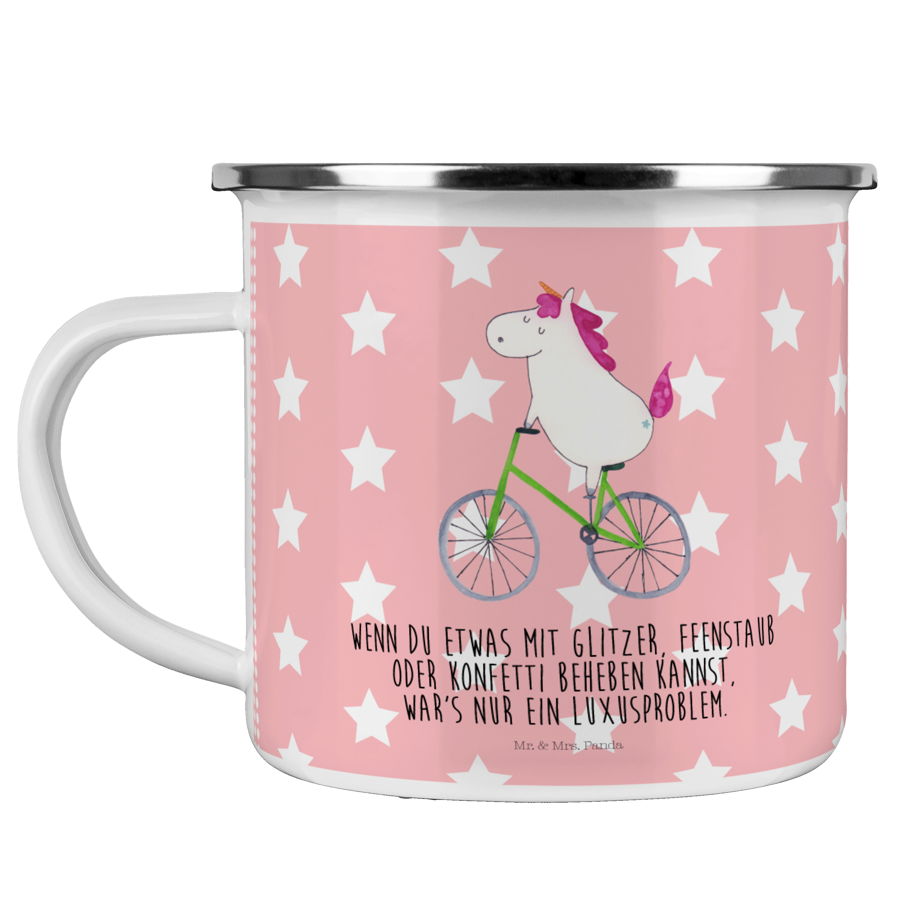 Camping Emaille Tasse Einhorn Radfahrer - mit Spruch - Weiß