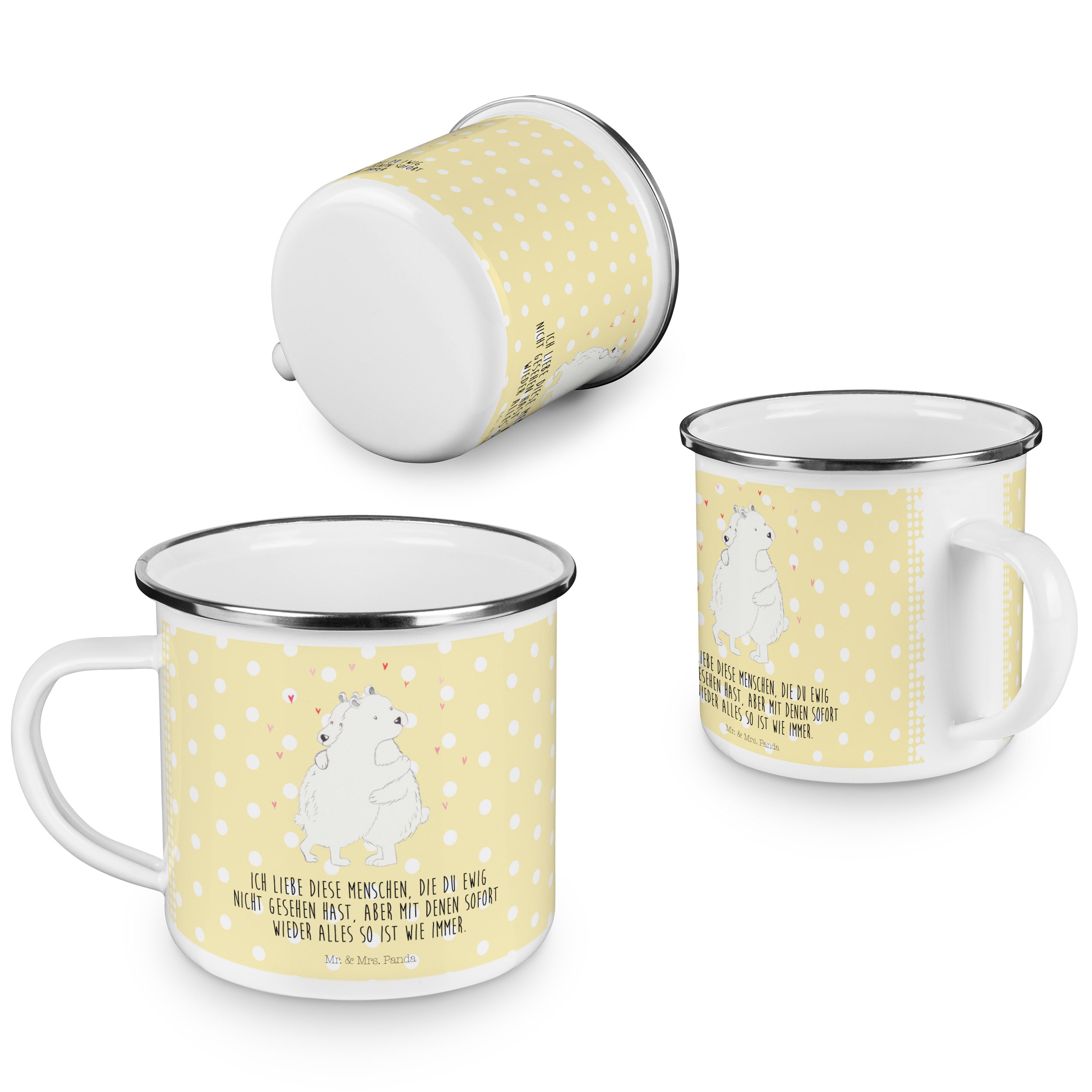 Diese wunderschöne Emailletasse von Mr. & Mrs. Panda mit abgesetztem Edelstahl Rand in Emaille Optik ist der perfekte, bruchsichere Begleiter für dein nächstes Abenteuer. Das Füllvolumen des Bechers beträgt 300 ml. So sind die Motivtassen ideal beim Camping als Campingbecher einsetzbar.
