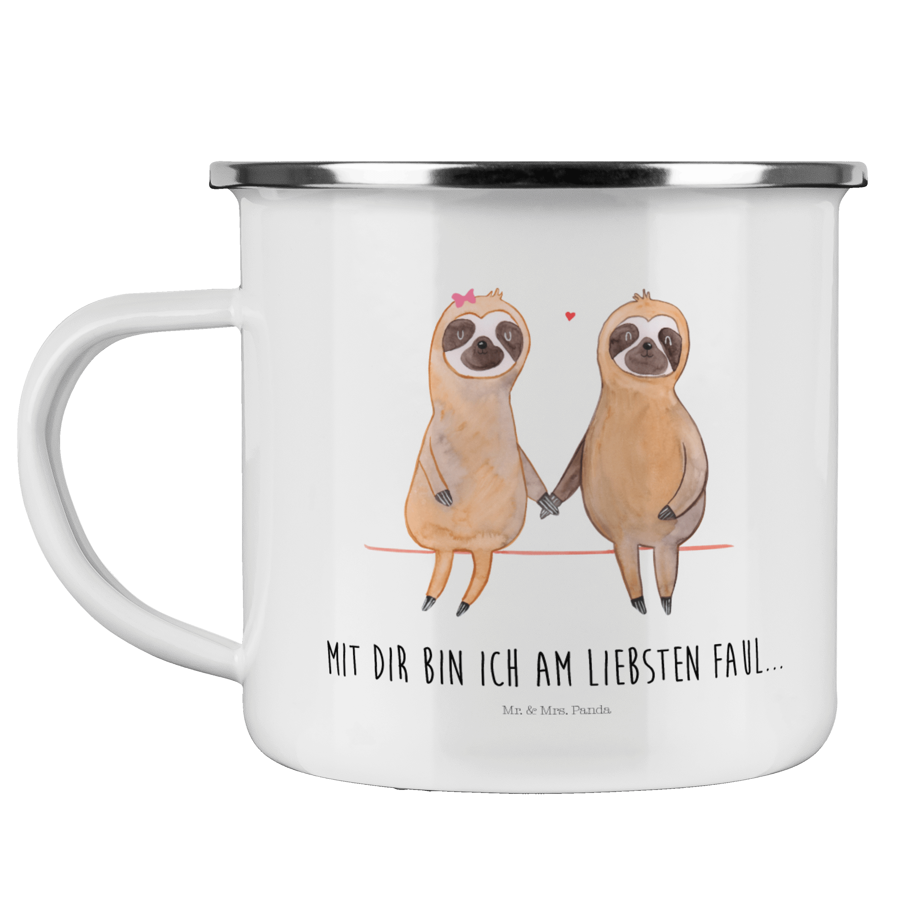 Camping Emaille Tasse Faultier Pärchen - mit Spruch - Weiß