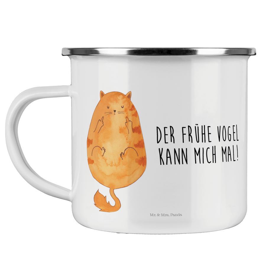 Camping Emaille Tasse Katze Frühaufsteher - mit Spruch - Weiß