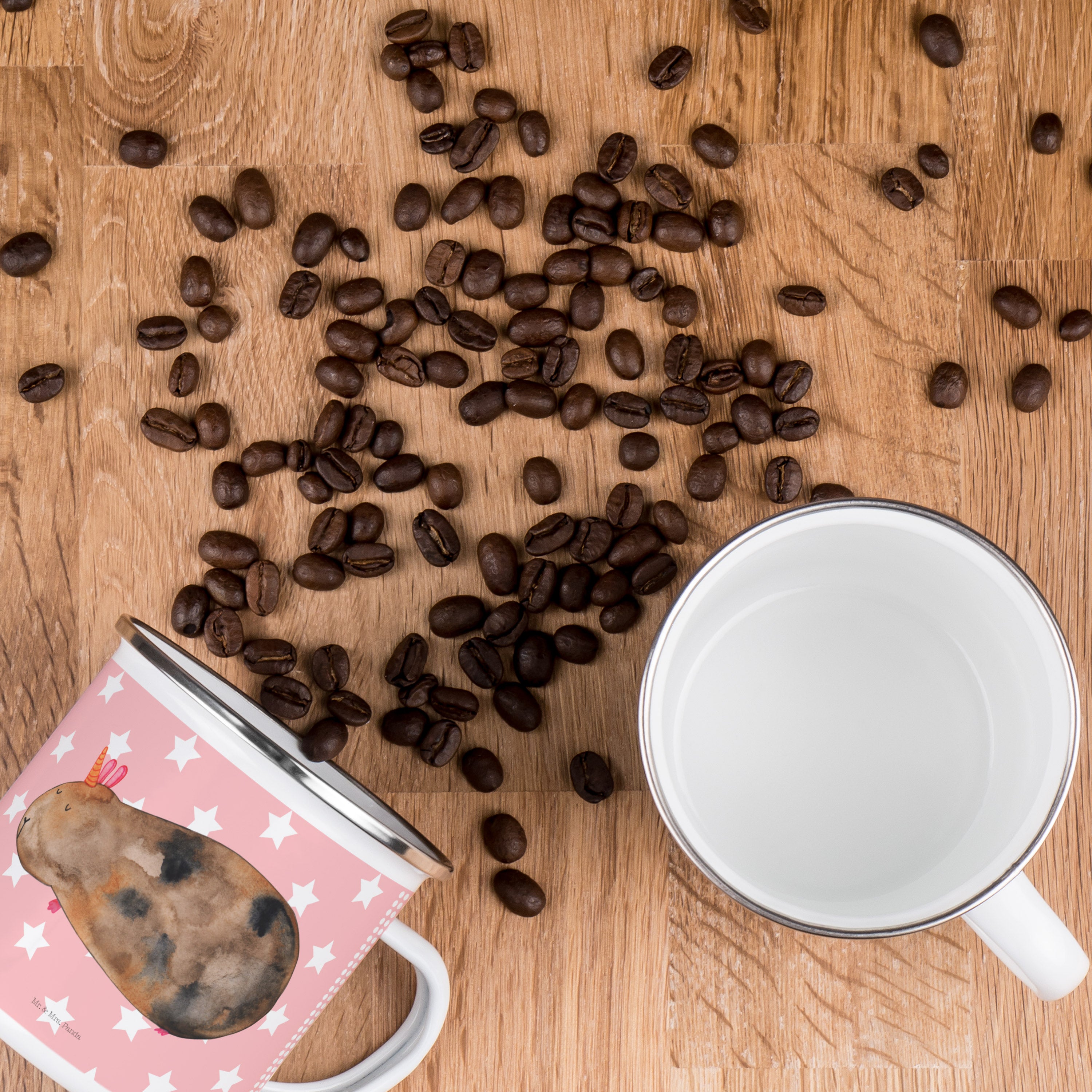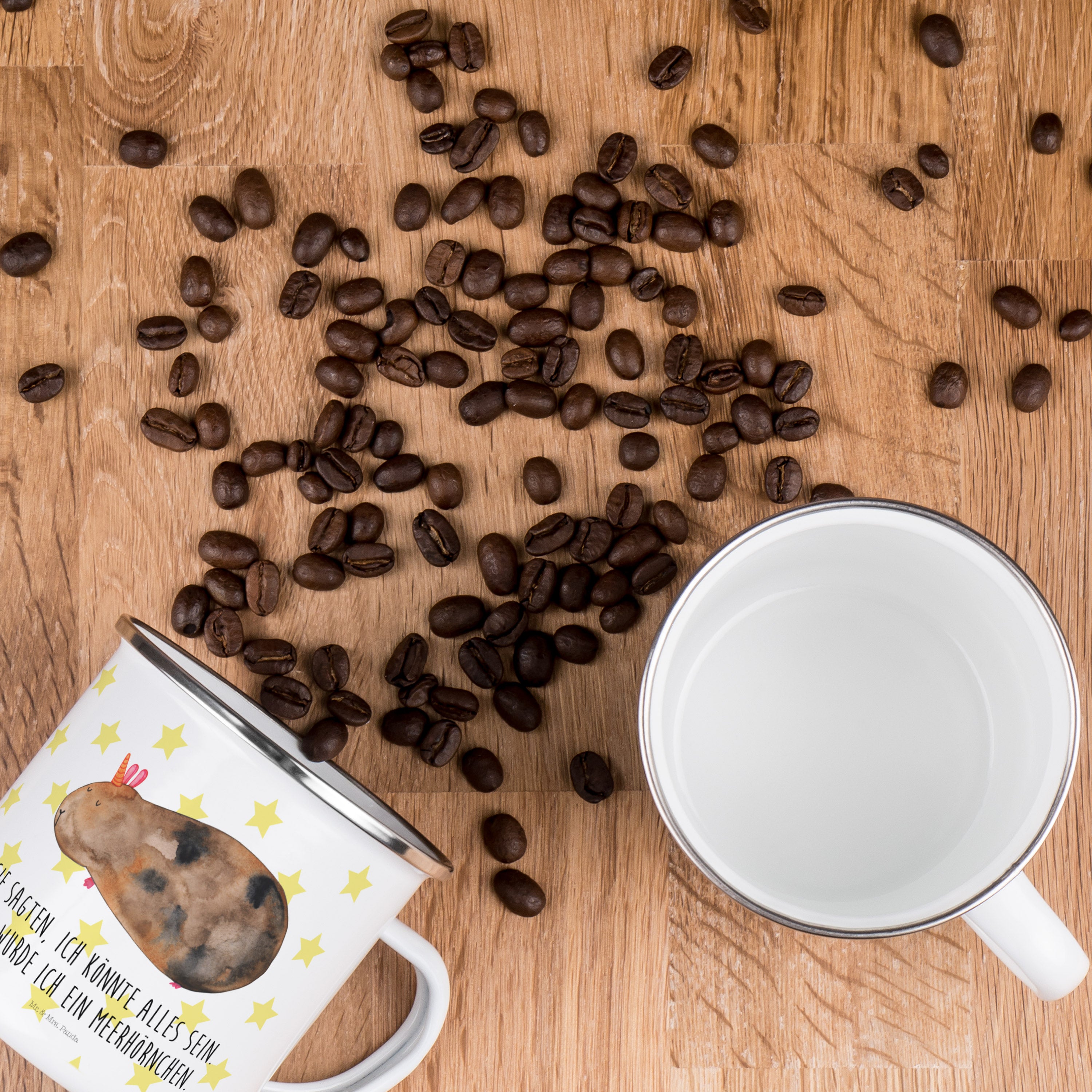 Diese wunderschöne Emailletasse von Mr. & Mrs. Panda mit abgesetztem Edelstahl Rand in Emaille Optik ist der perfekte, bruchsichere Begleiter für dein nächstes Abenteuer. Das Füllvolumen des Bechers beträgt 300 ml. So sind die Motivtassen ideal beim Camping als Campingbecher einsetzbar.