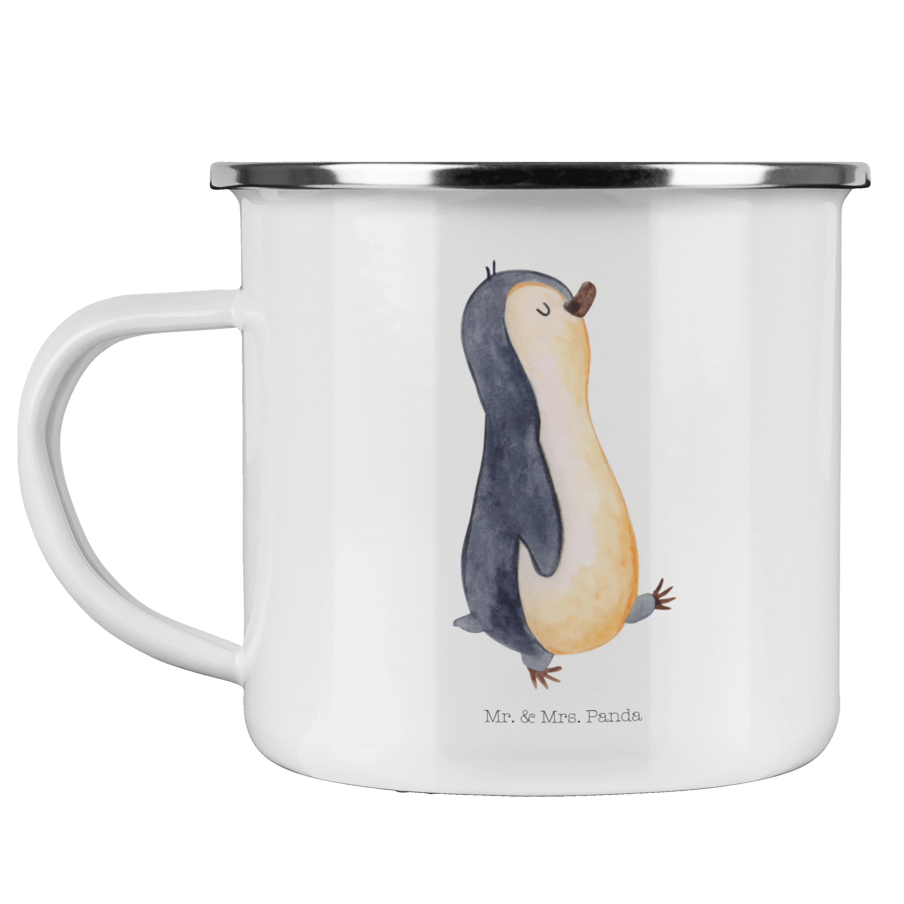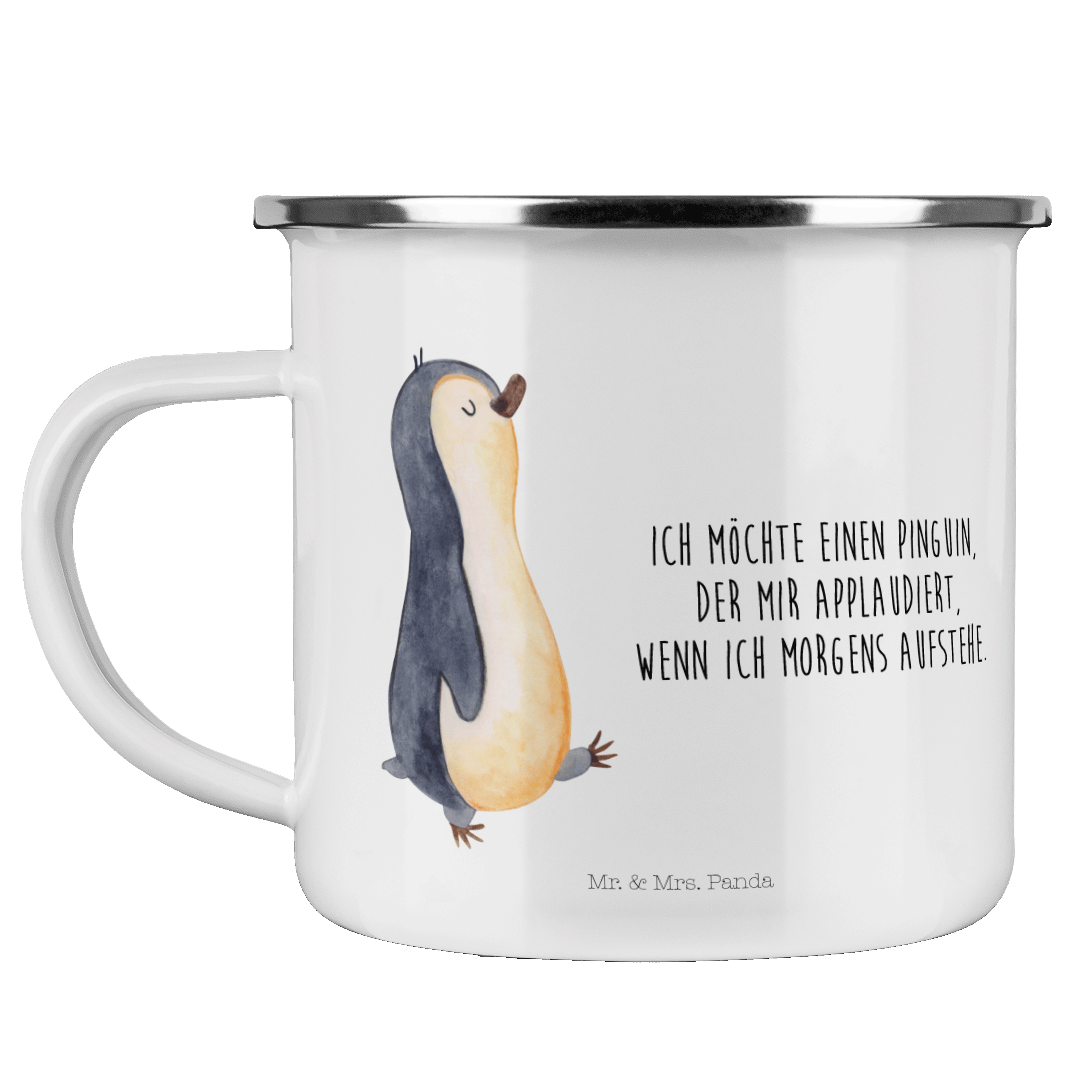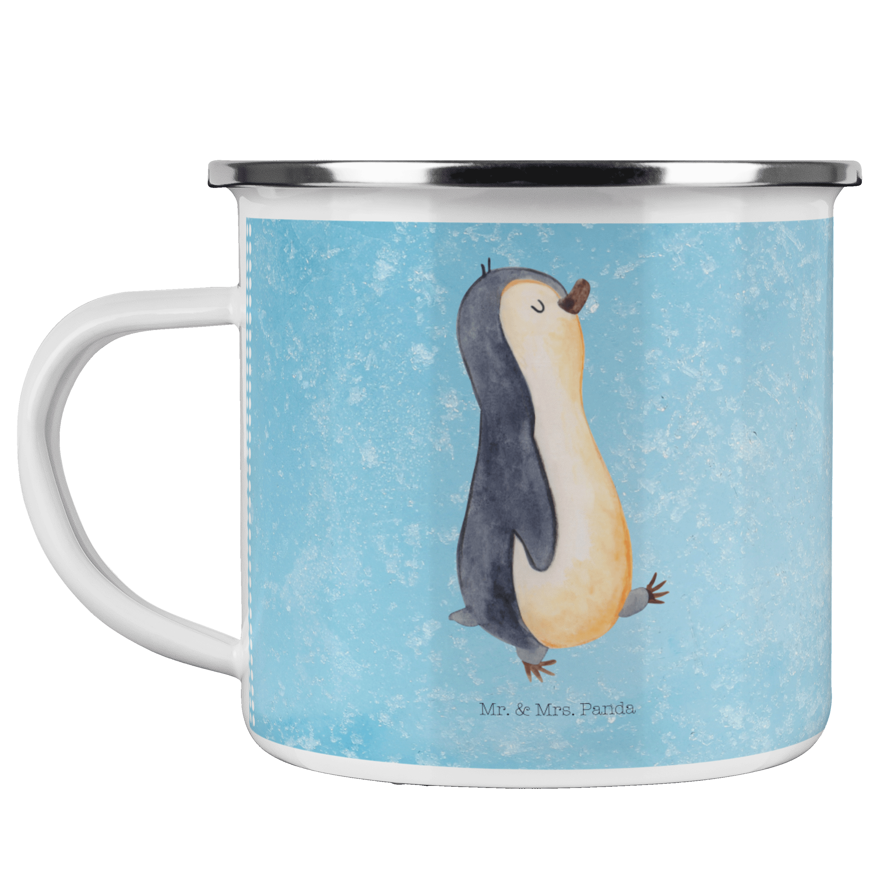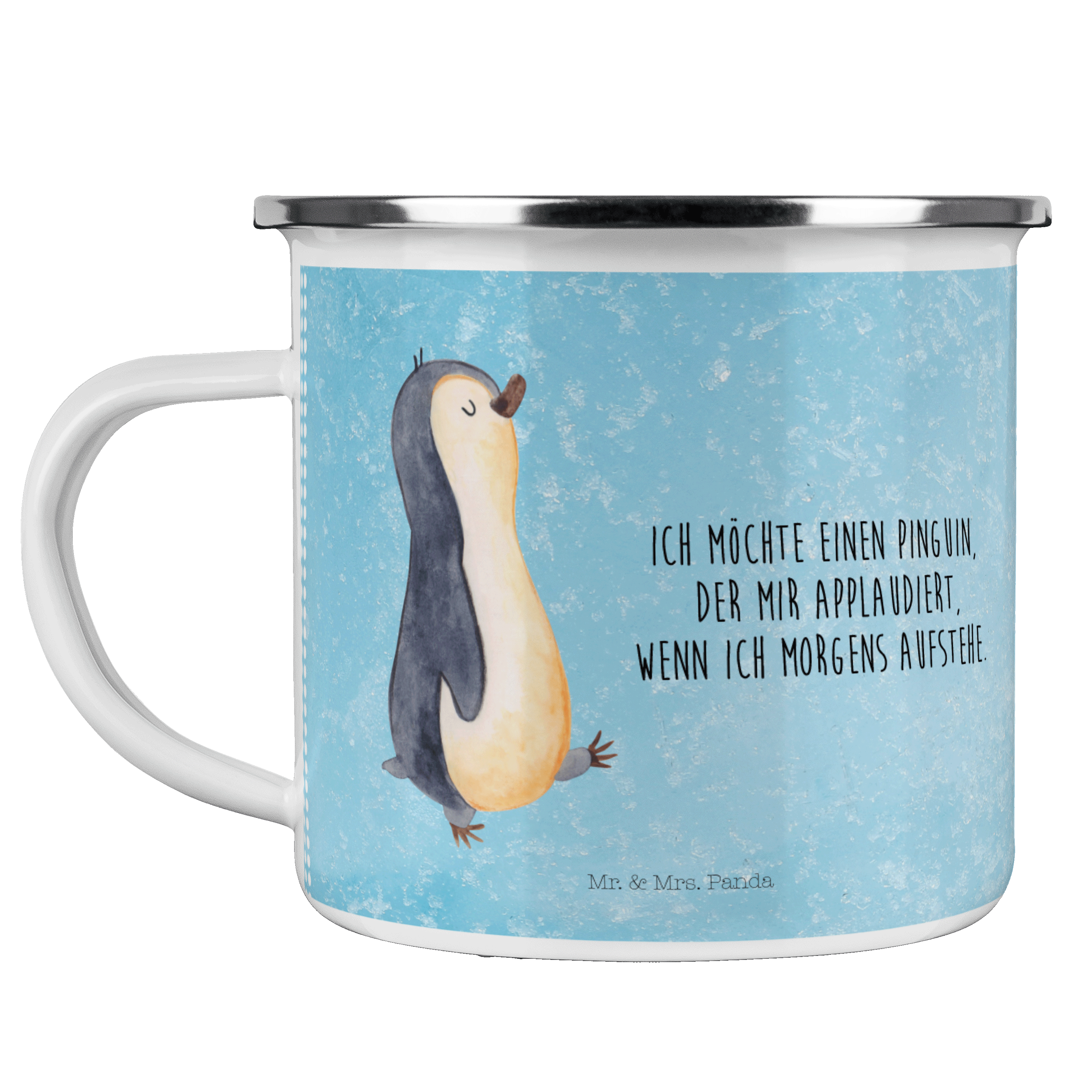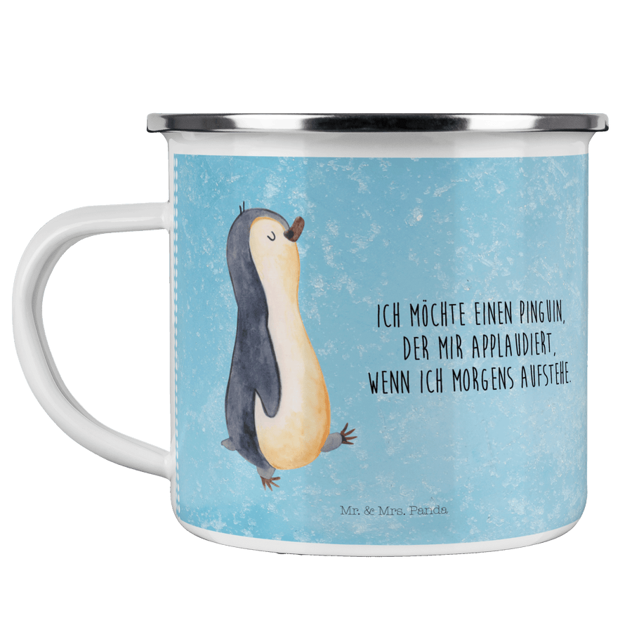 Camping Emaille Tasse Pinguin marschierend - mit Spruch - Eisblau