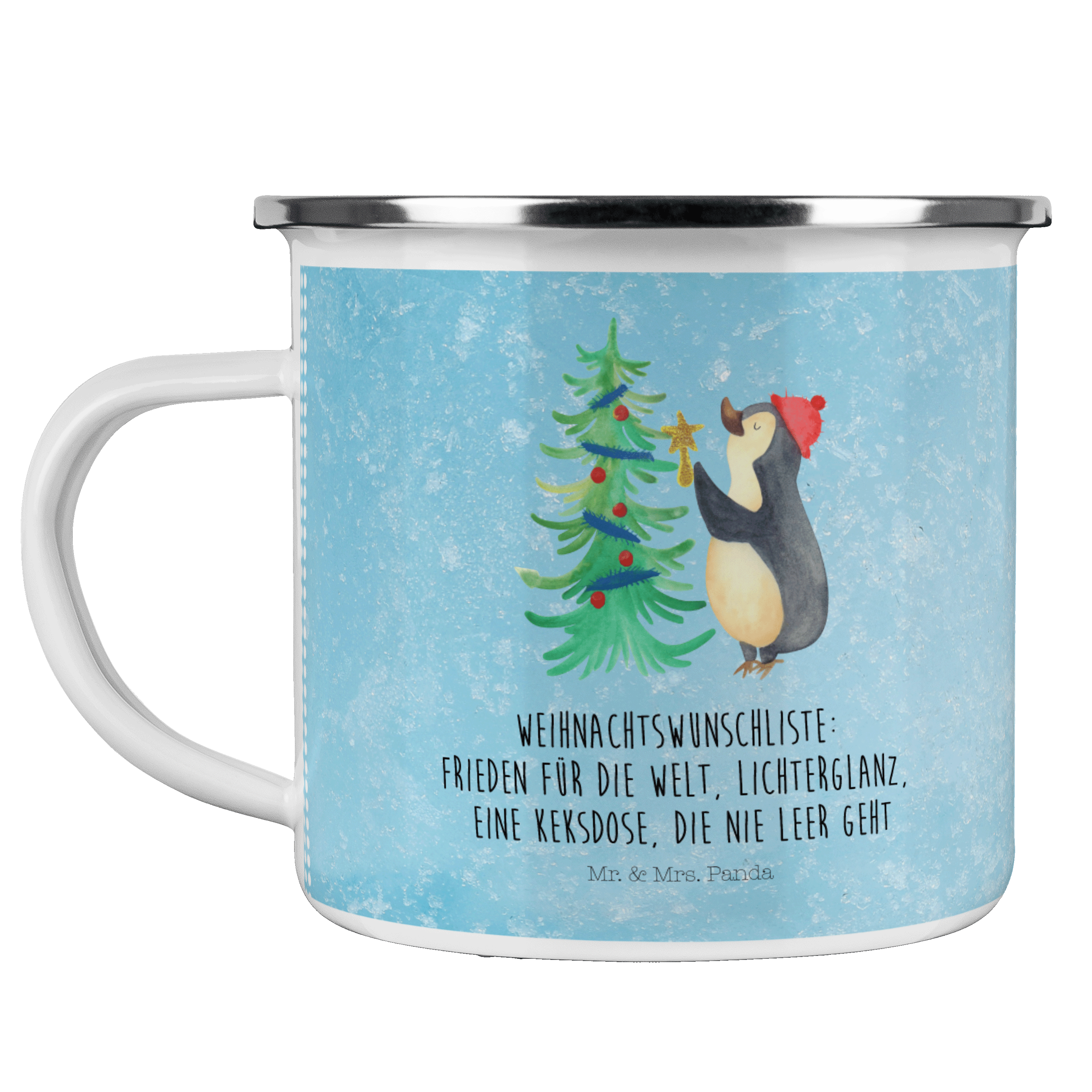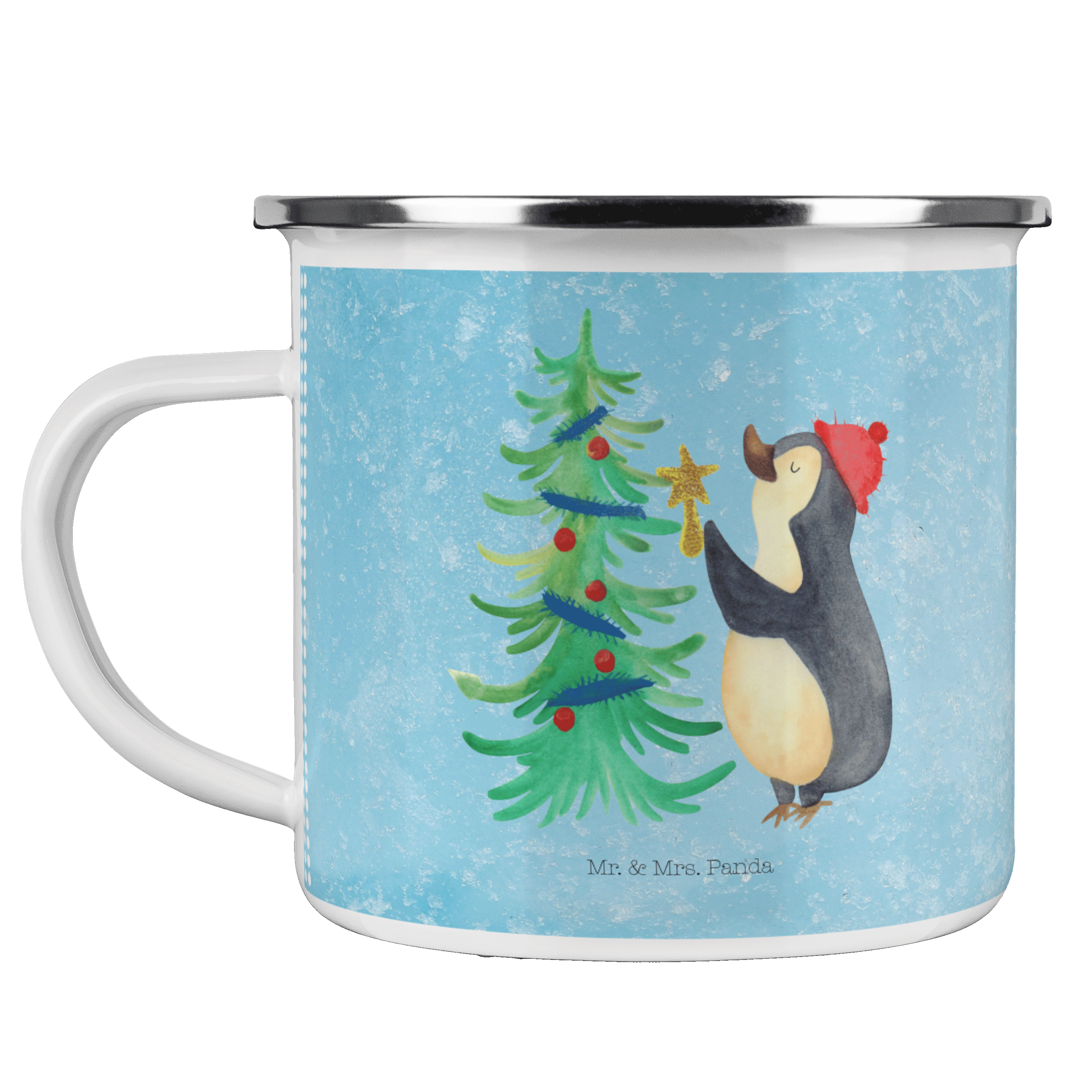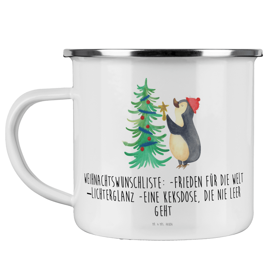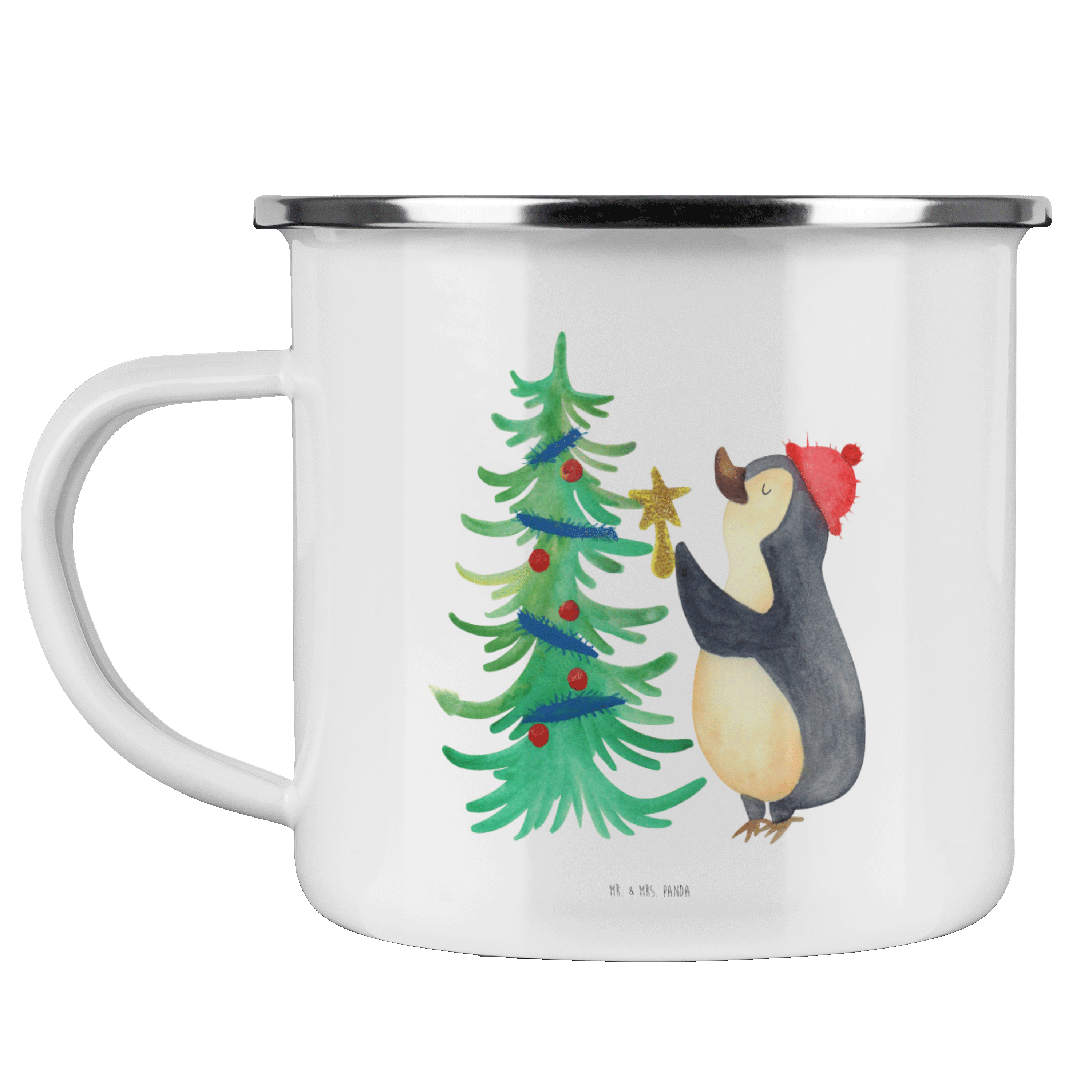 Camping Emaille Tasse Pinguin Weihnachtsbaum - mit Spruch - Weiß