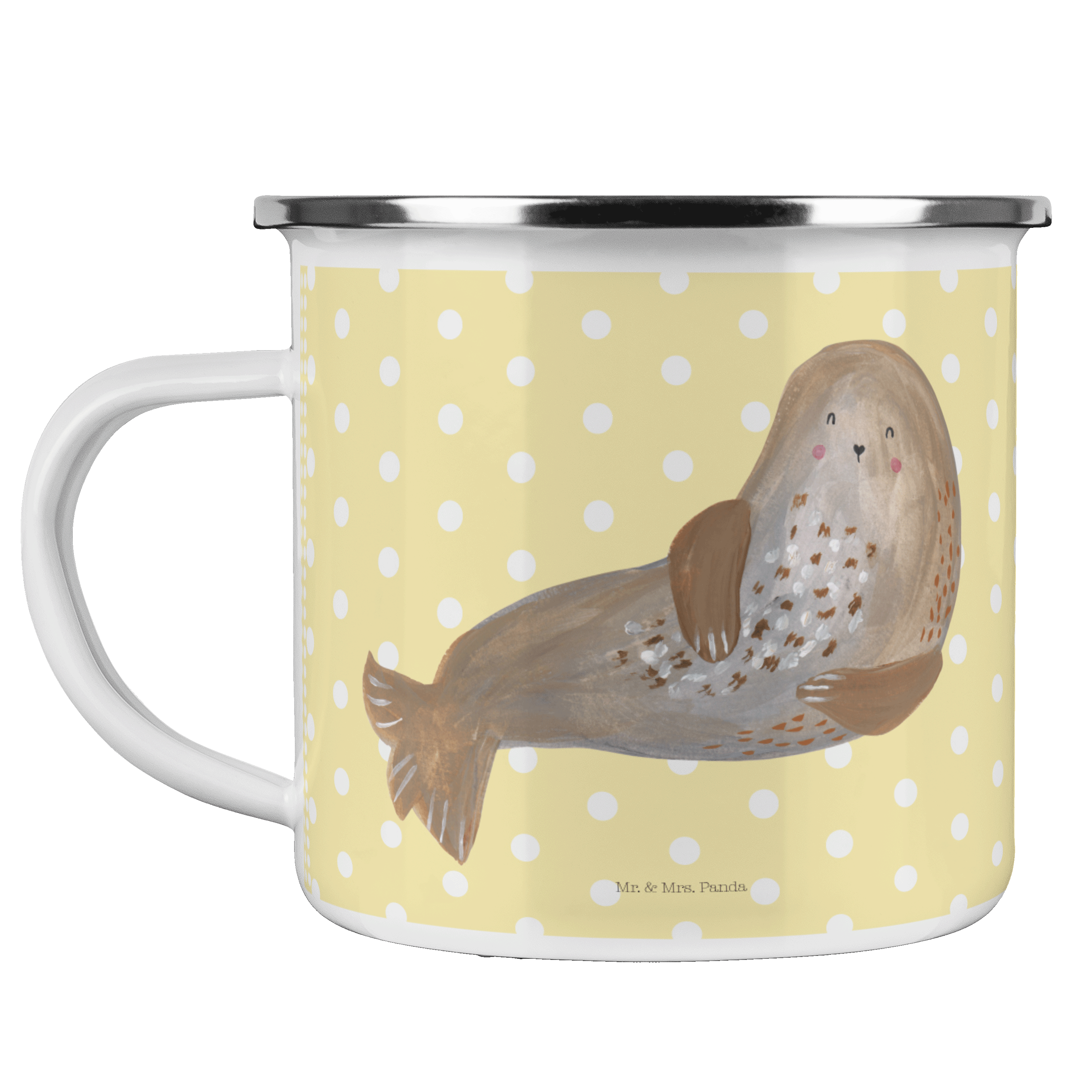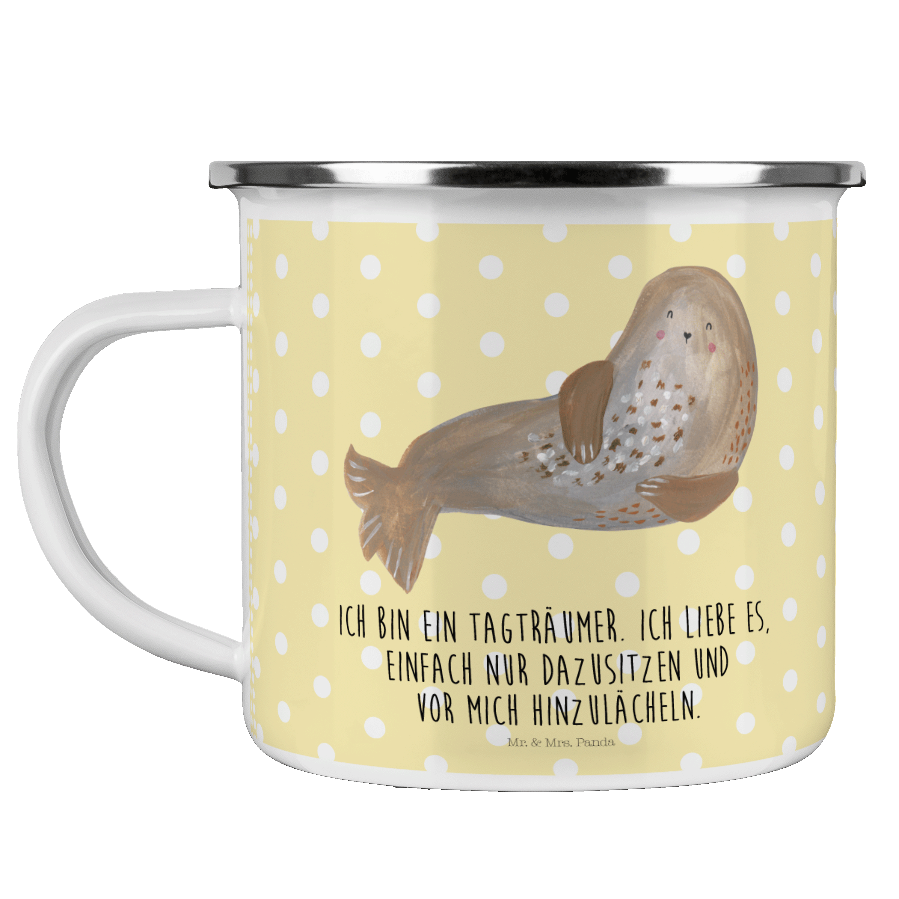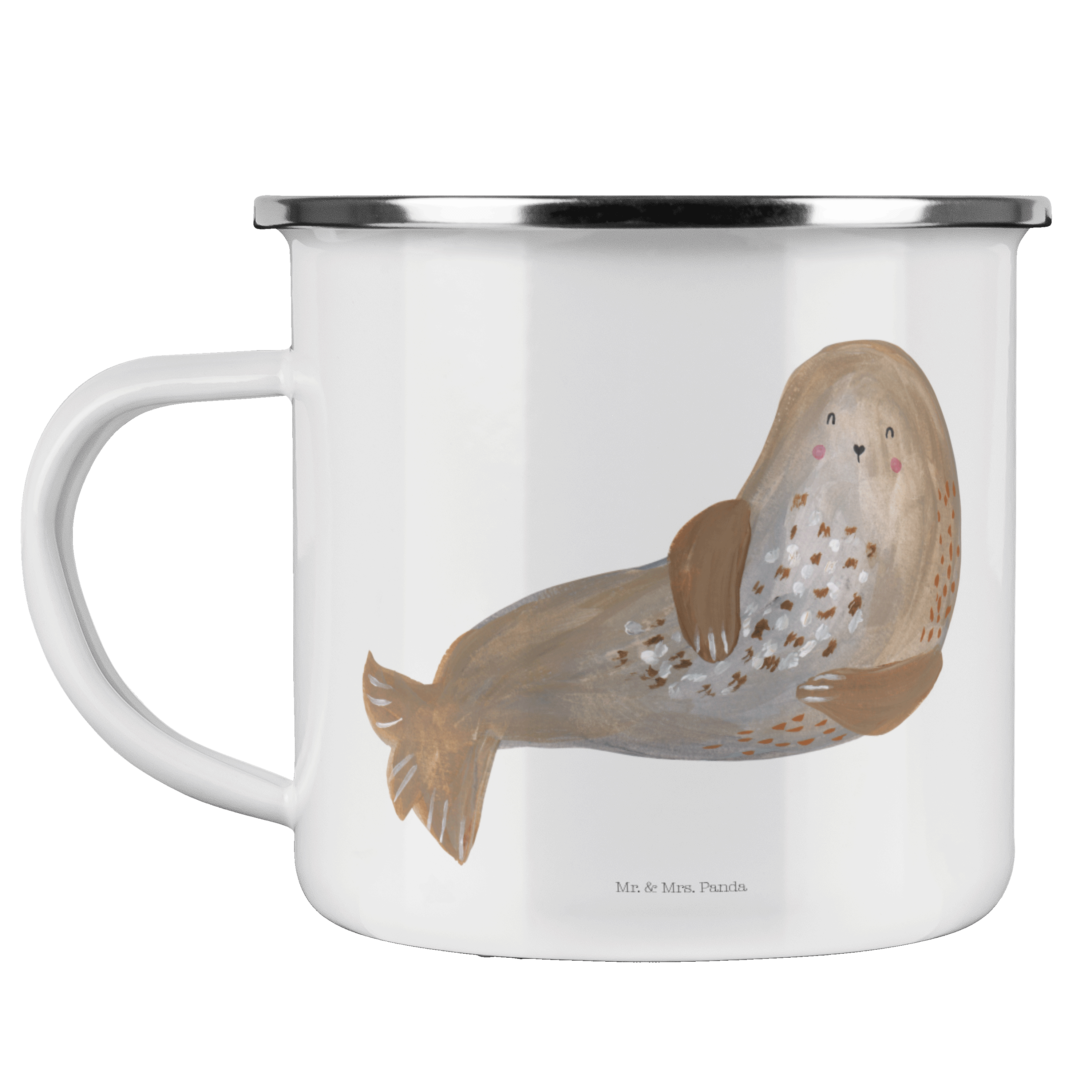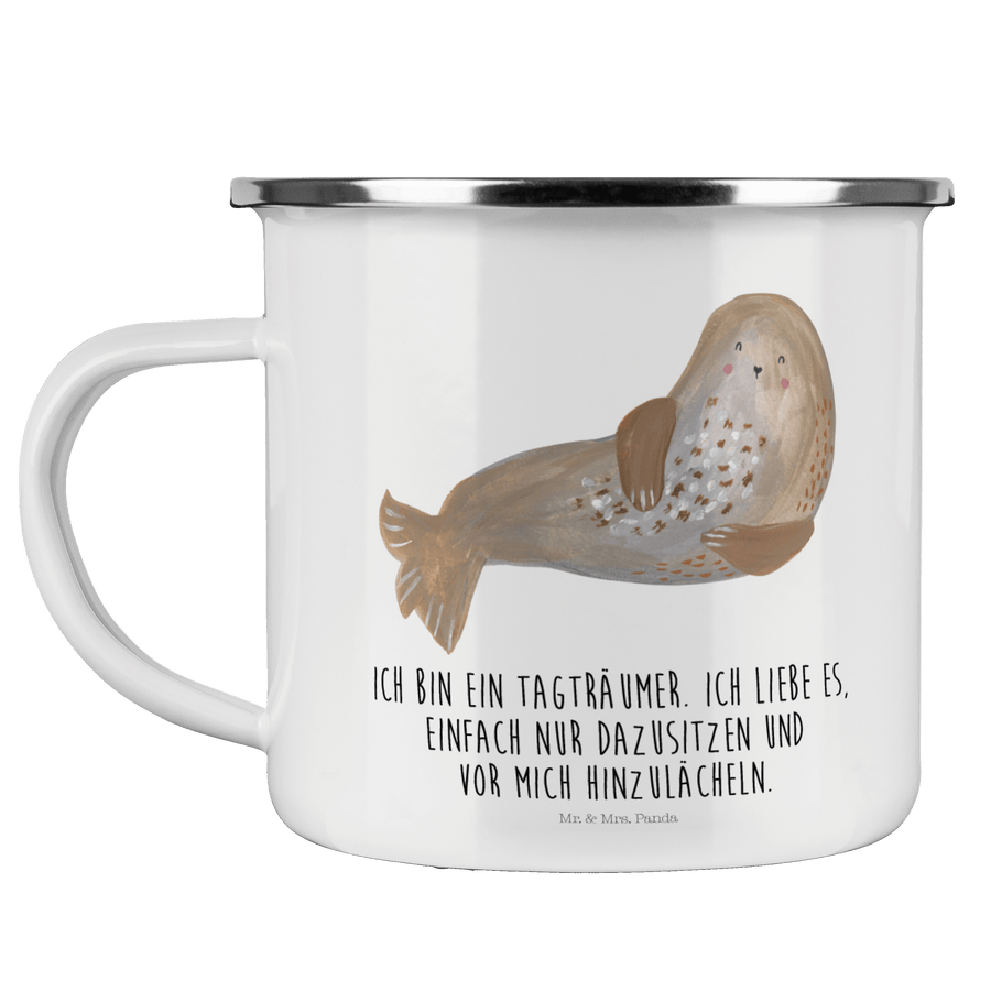 Camping Emaille Tasse Robbe lachend - mit Spruch - Weiß