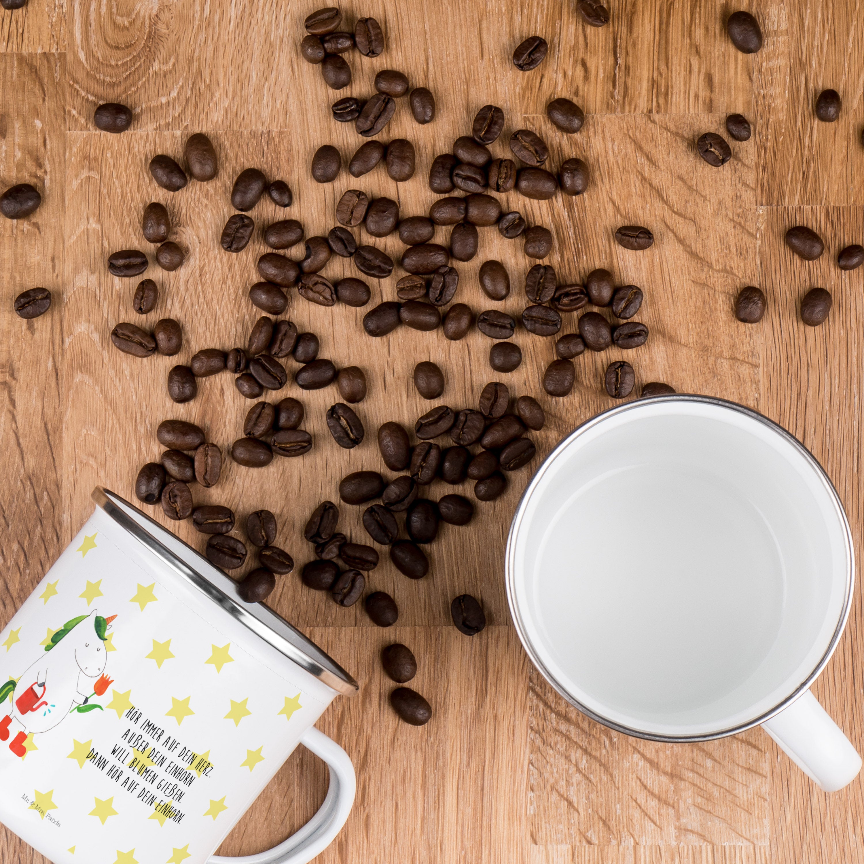 Diese wunderschöne Emailletasse von Mr. & Mrs. Panda mit abgesetztem Edelstahl Rand in Emaille Optik ist der perfekte, bruchsichere Begleiter für dein nächstes Abenteuer. Das Füllvolumen des Bechers beträgt 300 ml. So sind die Motivtassen ideal beim Camping als Campingbecher einsetzbar.