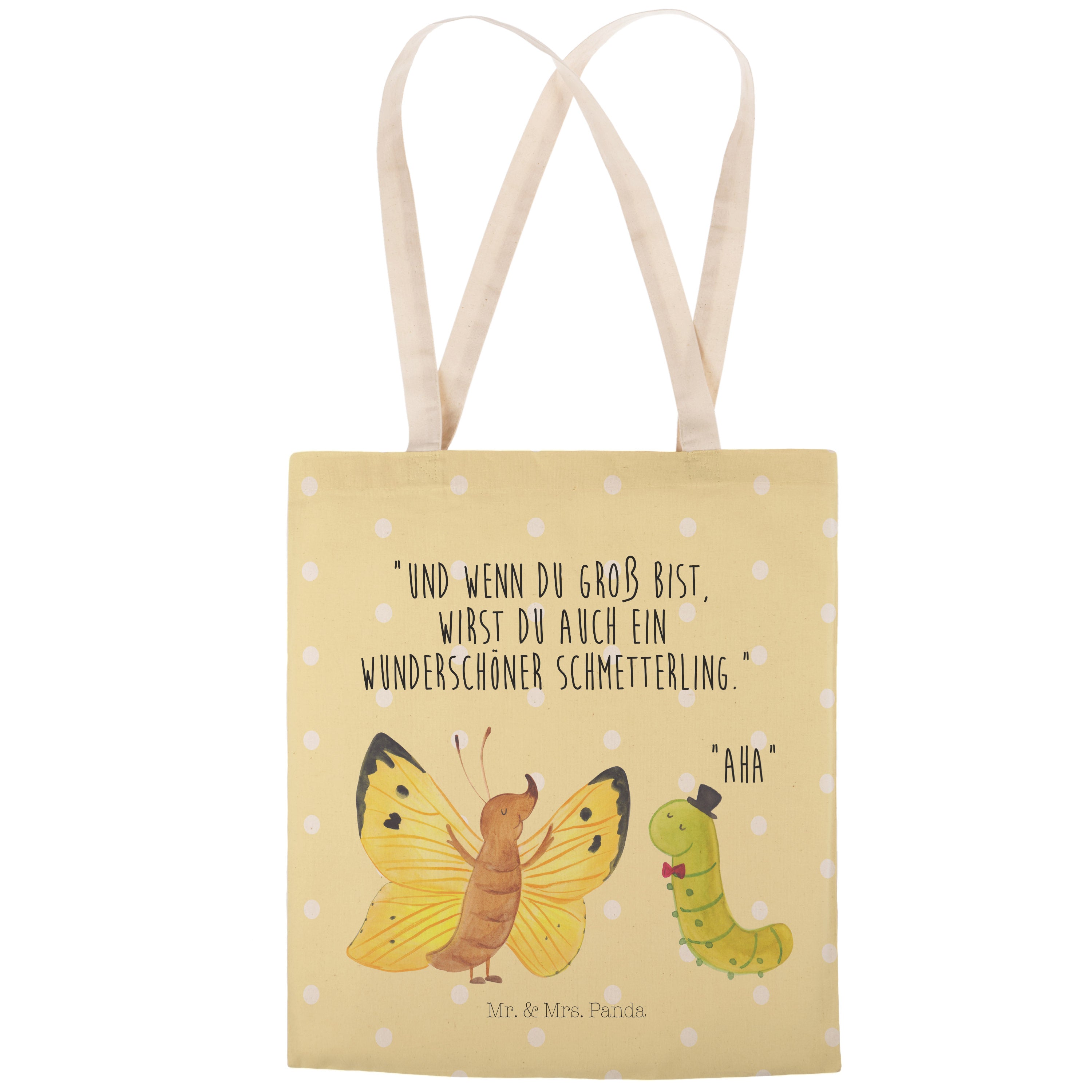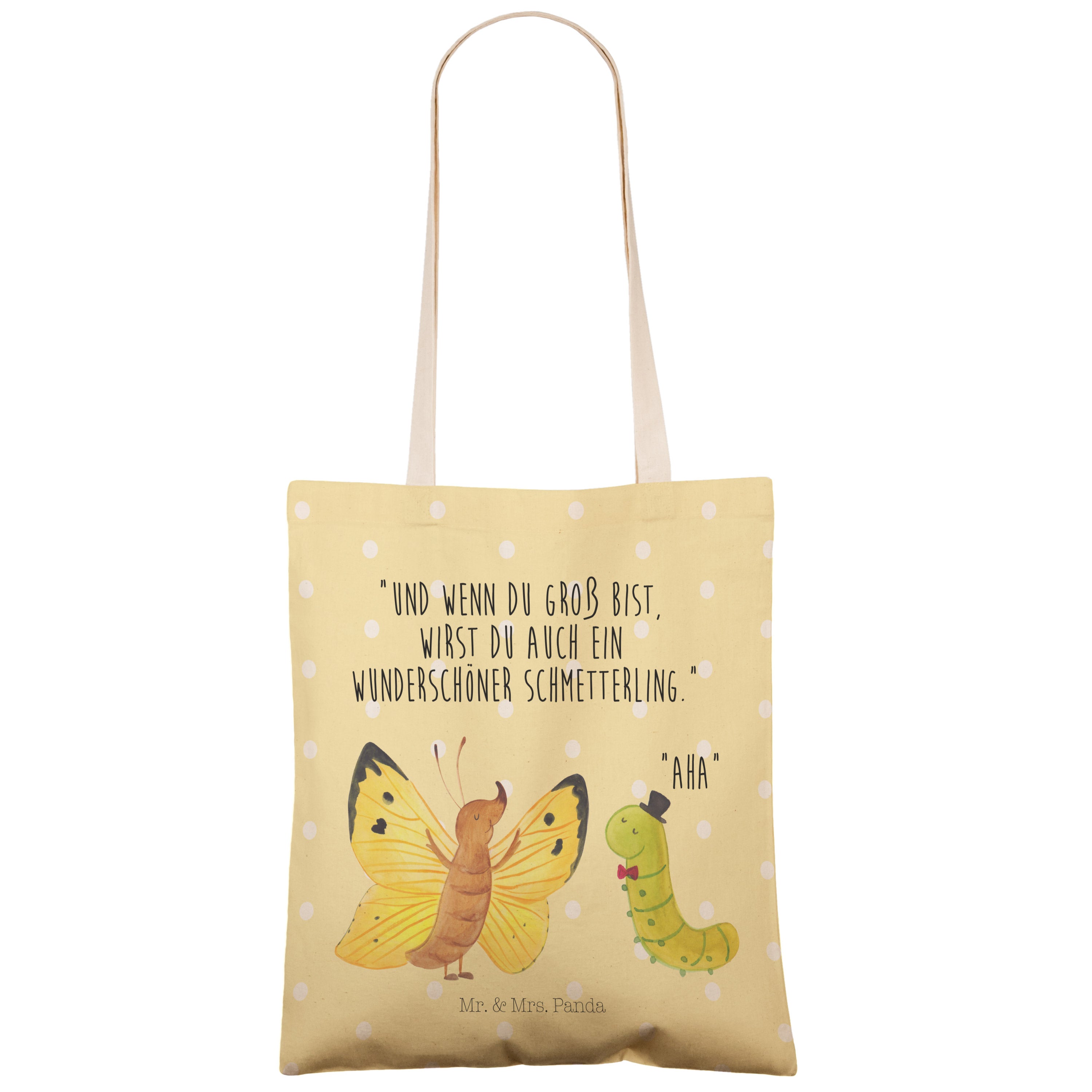 Einkaufstasche Raupe & Schmetterling Tragetasche, Tasche, Beutel, Stofftasche, Baumwolltasche, Umhängetasche, Shopper, Tiermotive, Gute Laune, lustige Sprüche, Tiere, Raupe, Schmetterling, Zitronenfalter, Entwicklung, Erwachsen werden, Kokon, Hut, Hütchen, Schönheit, Aufwachsen