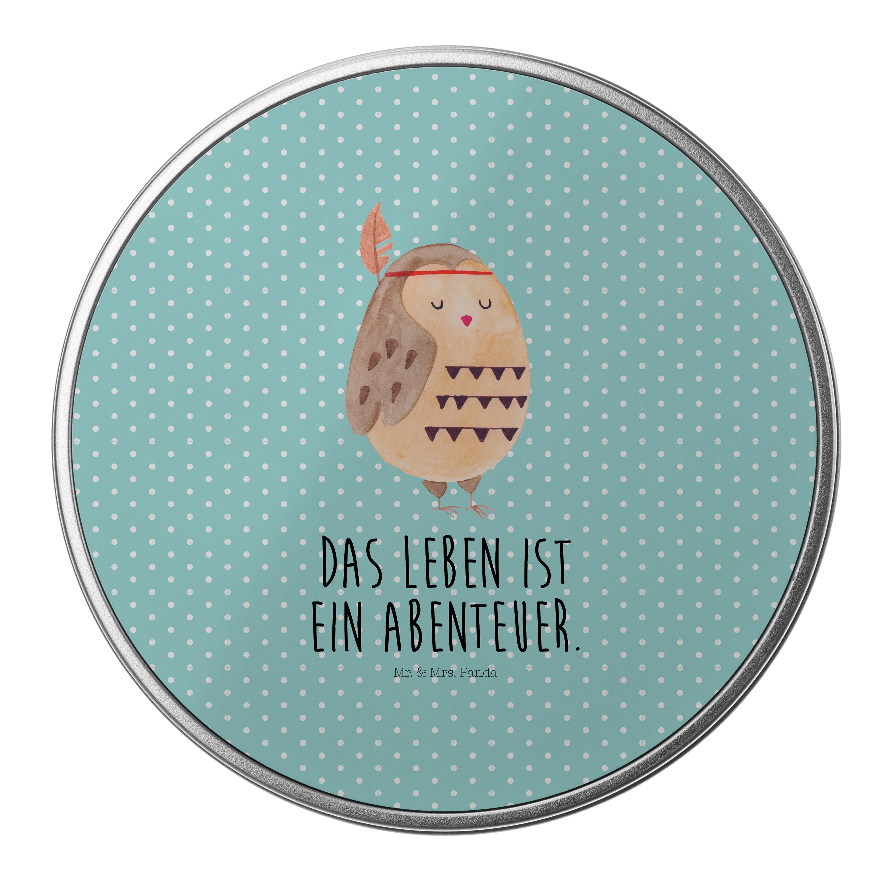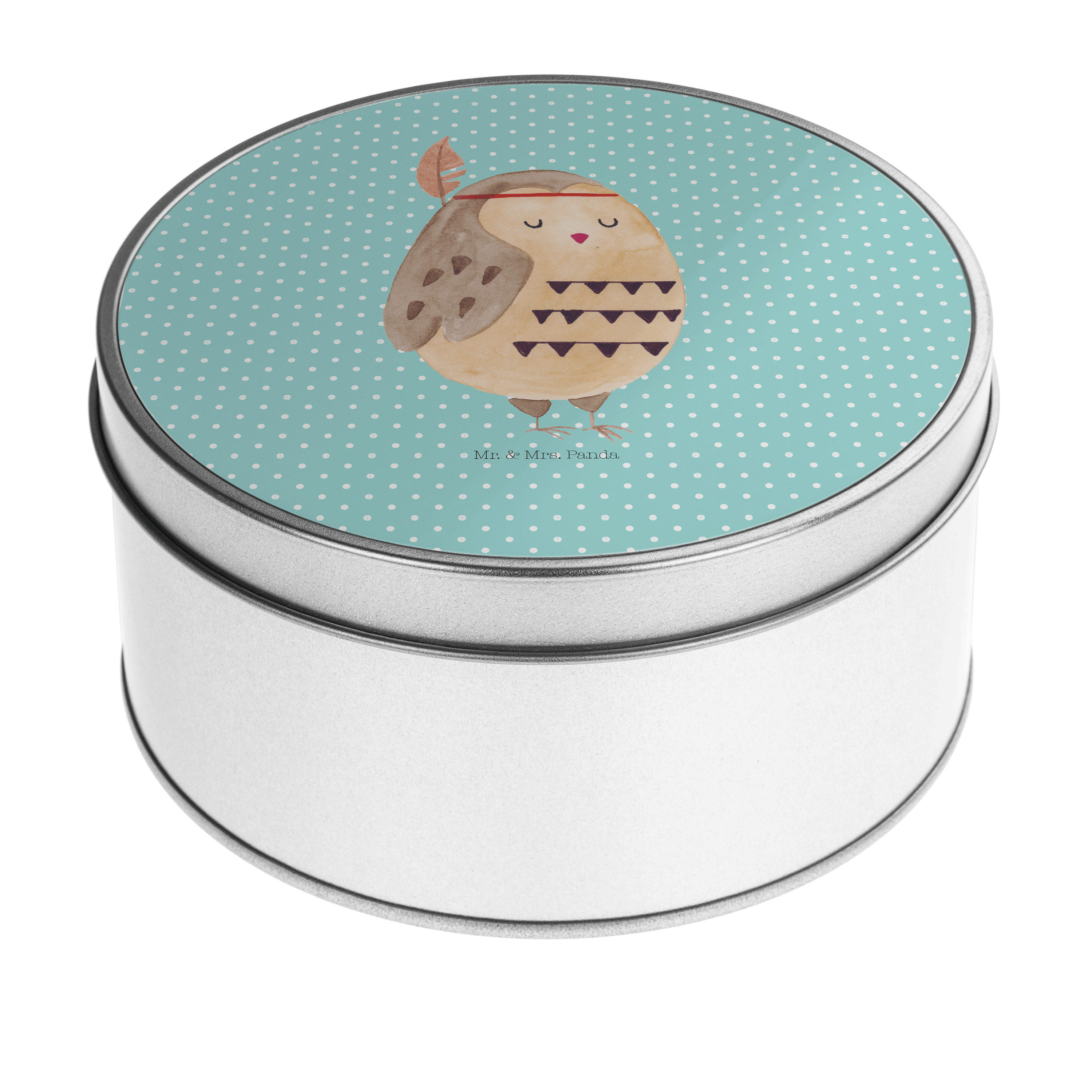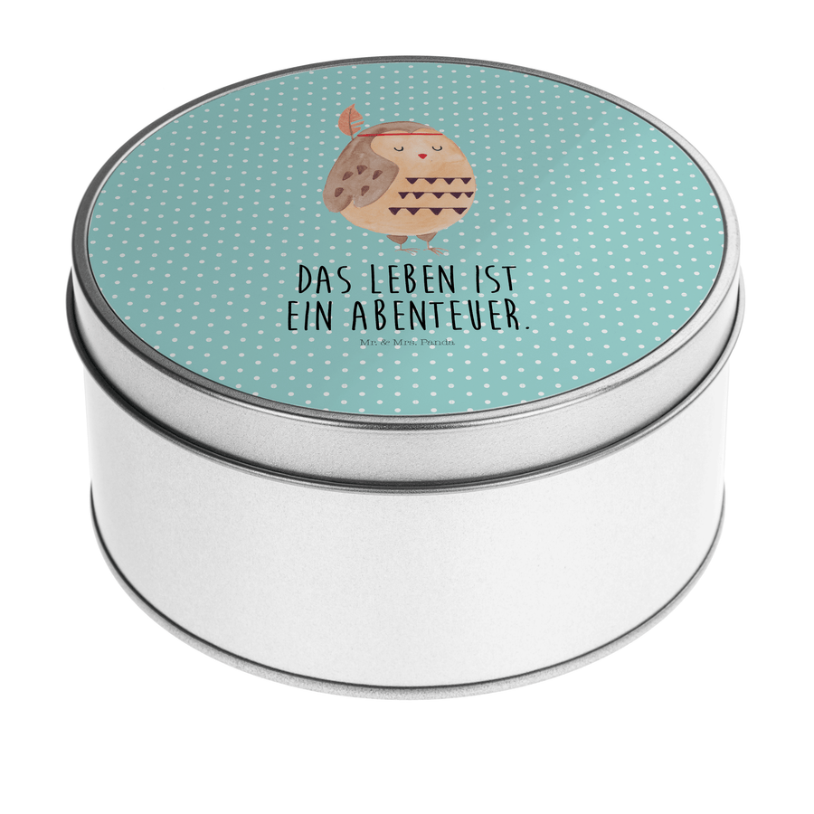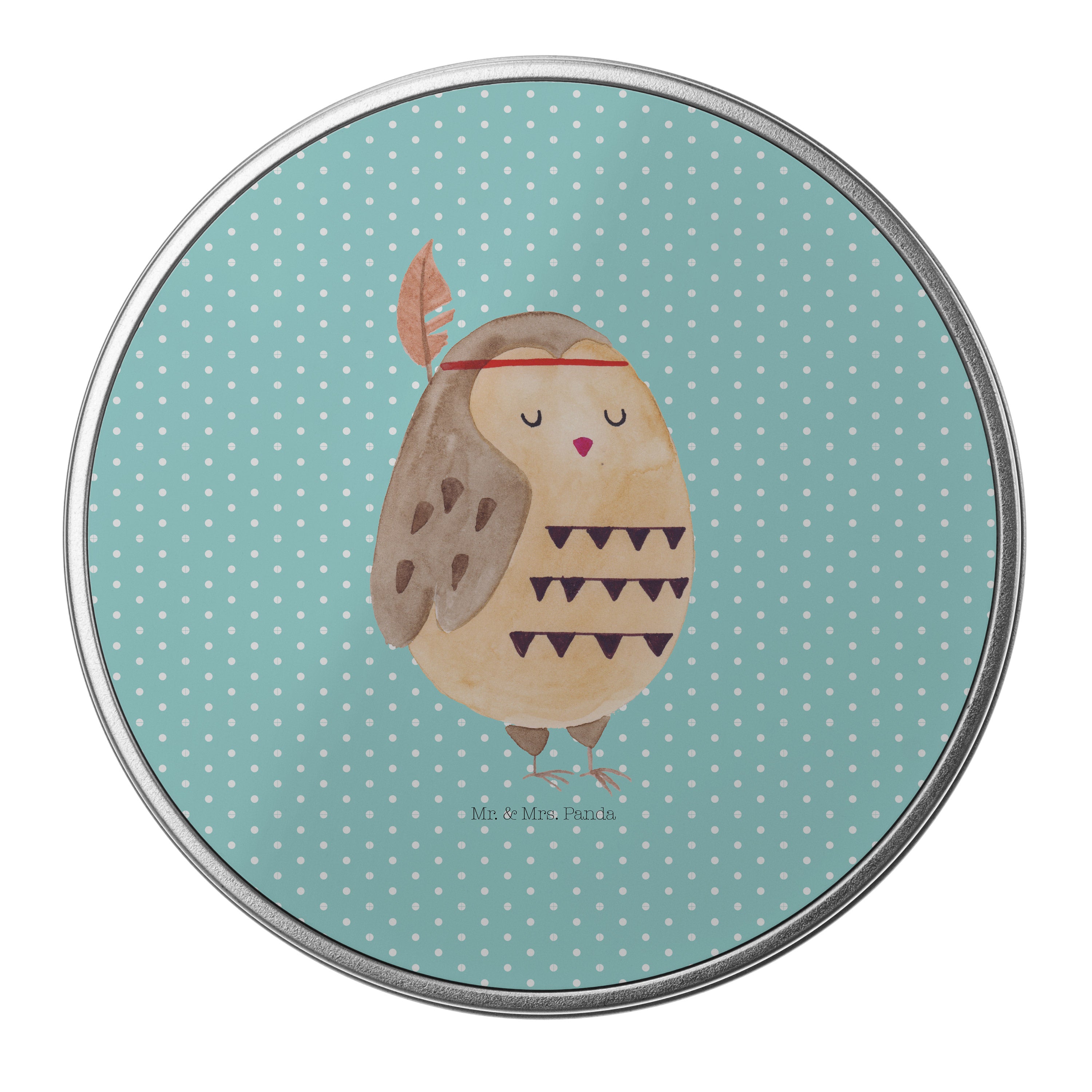 Blechdose rund Eule Federschmuck - mit Spruch - Türkis Pastell