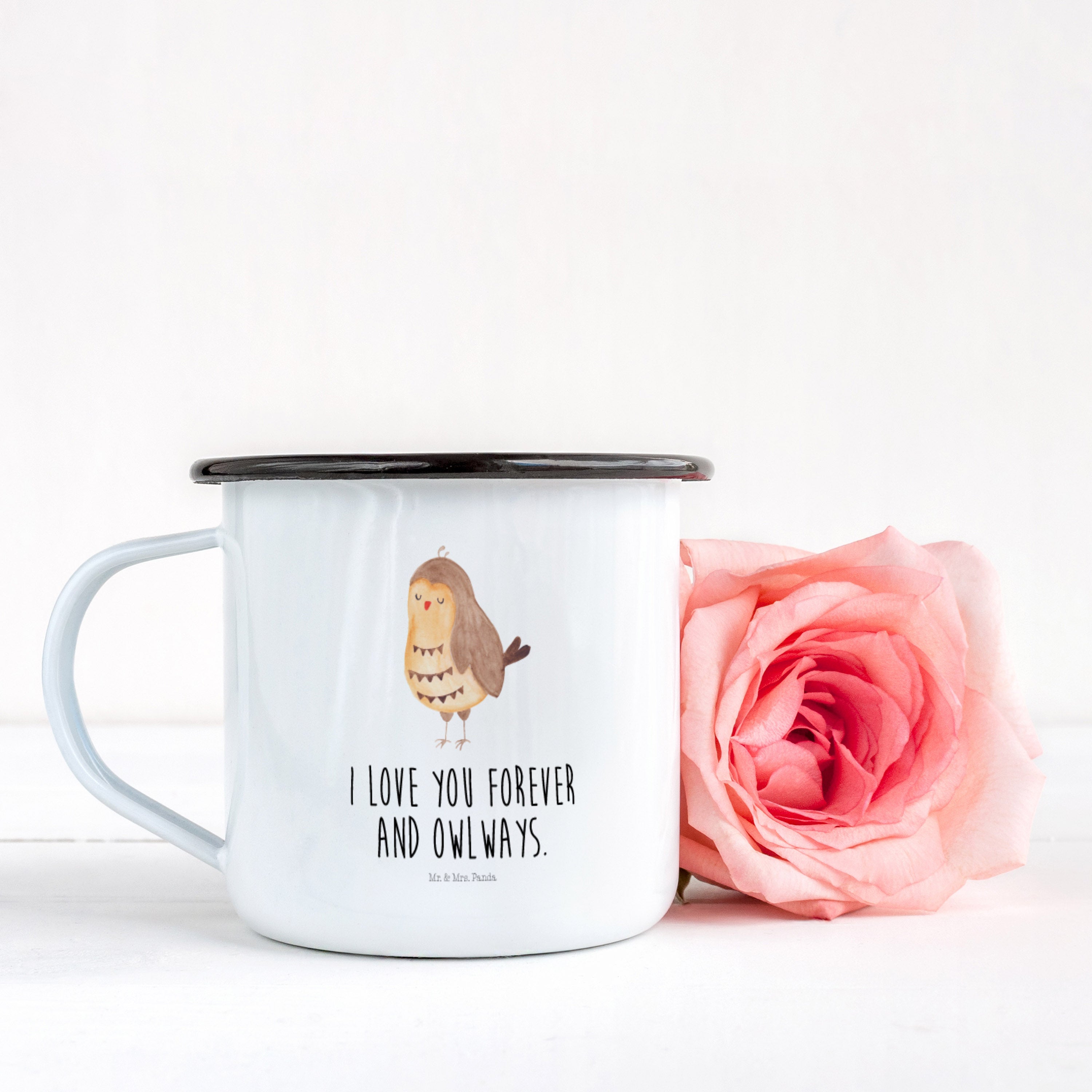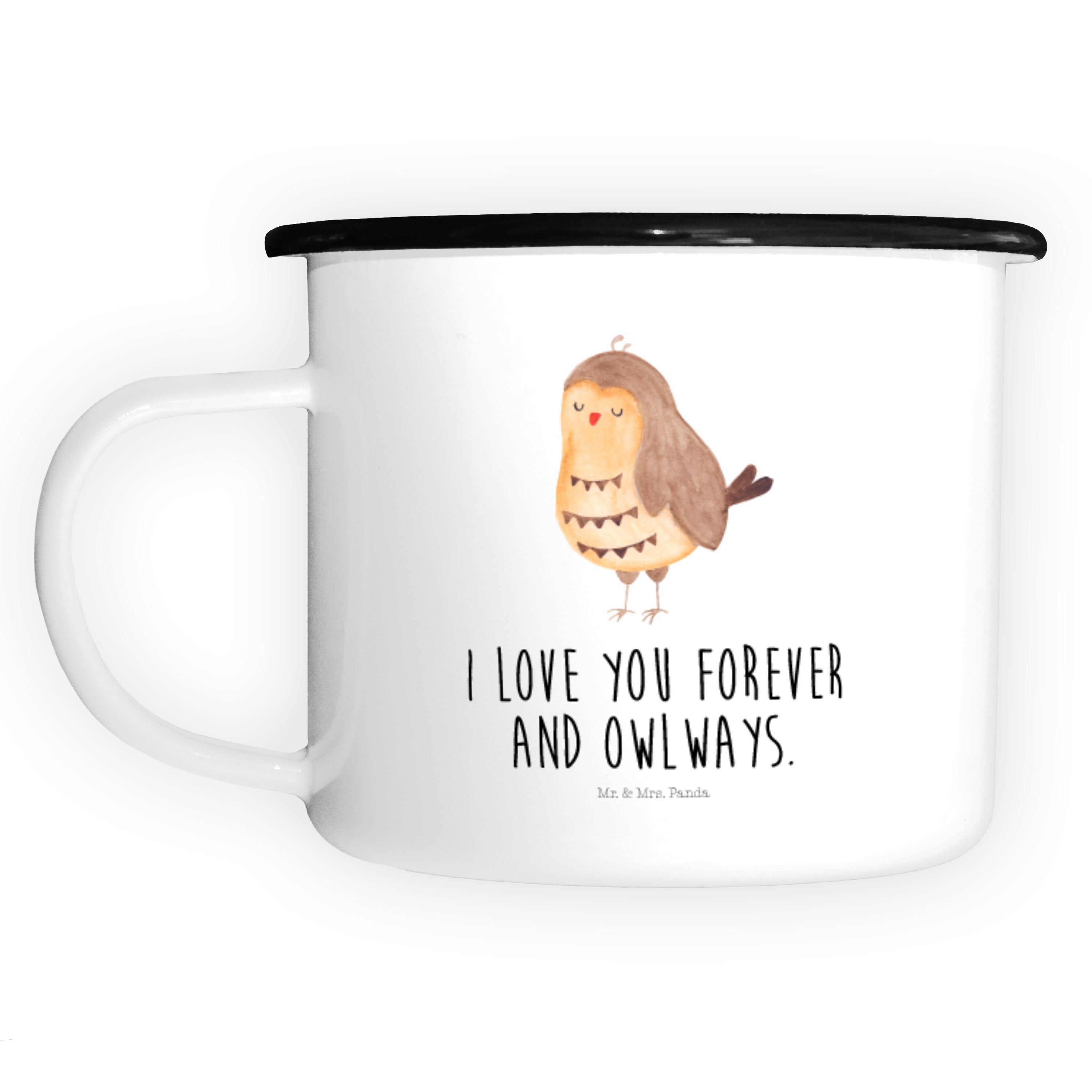 XL Emaille Tasse Eule Zufrieden - mit Spruch