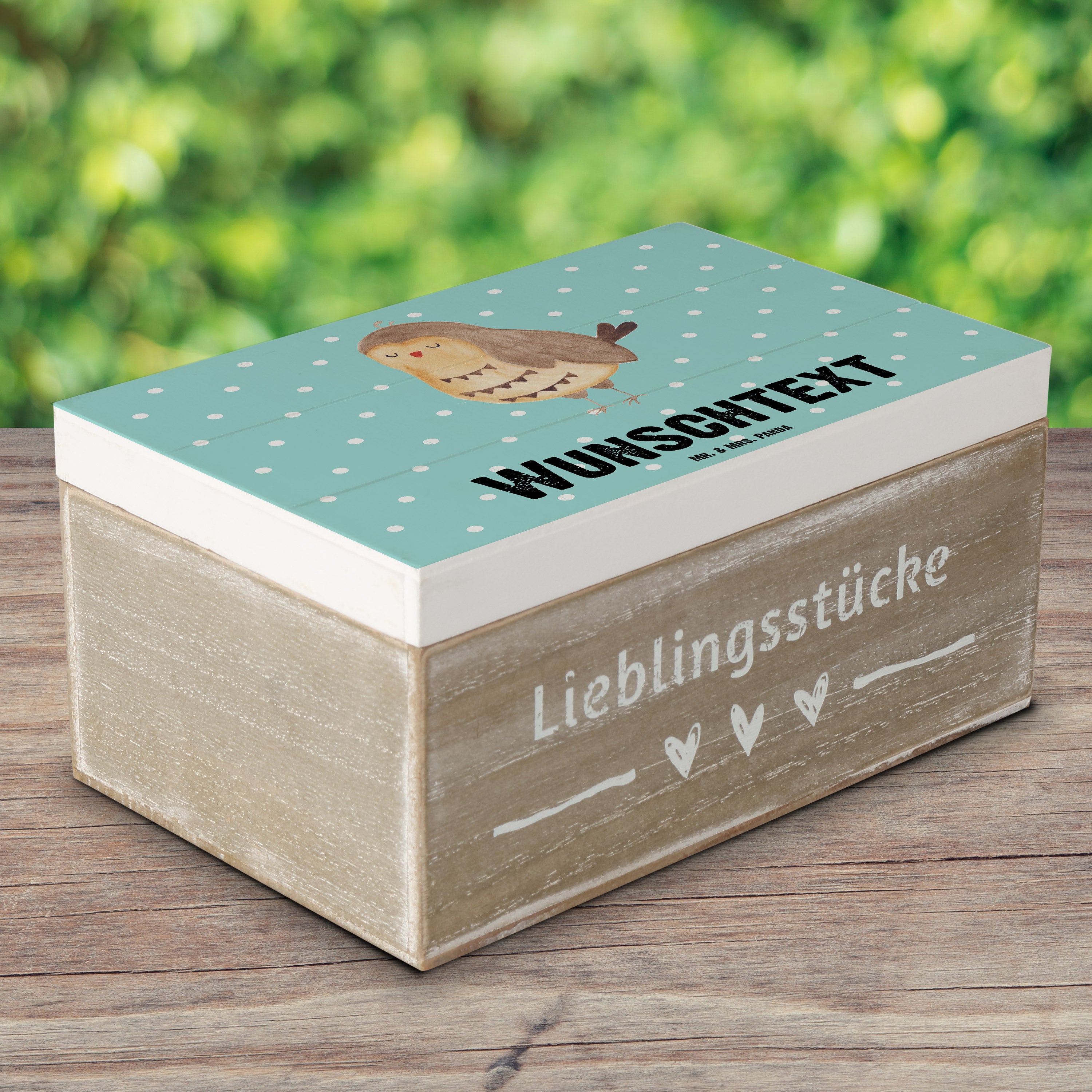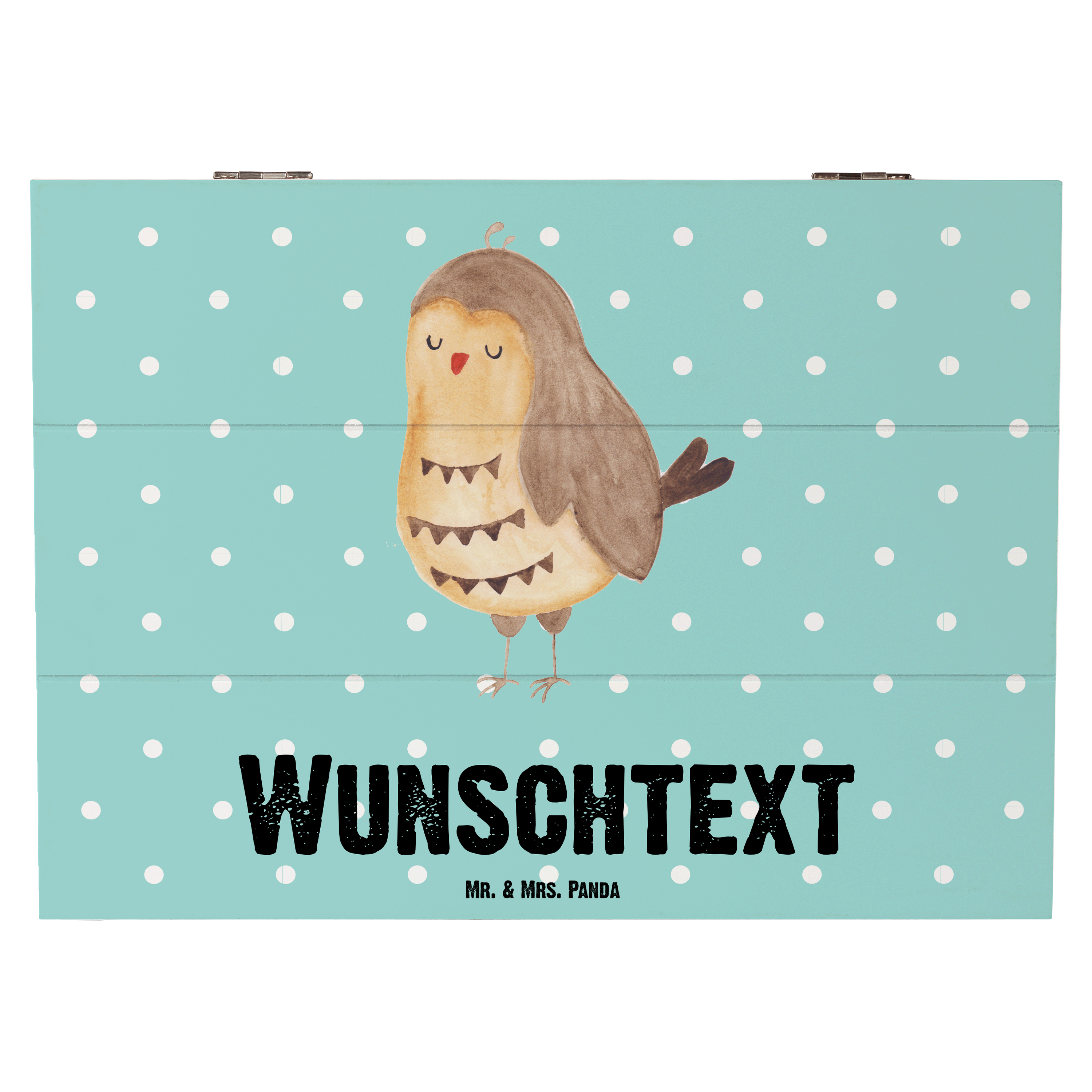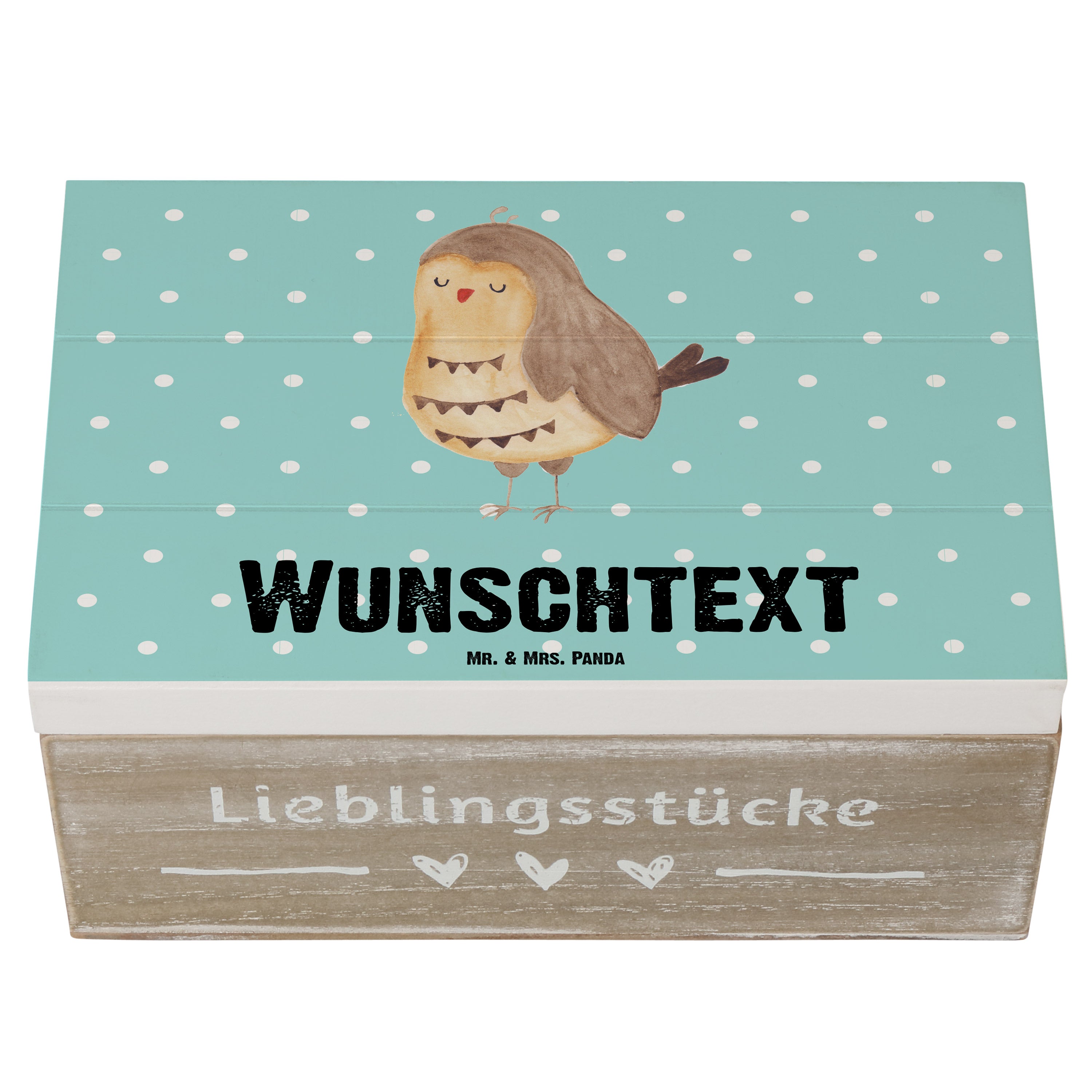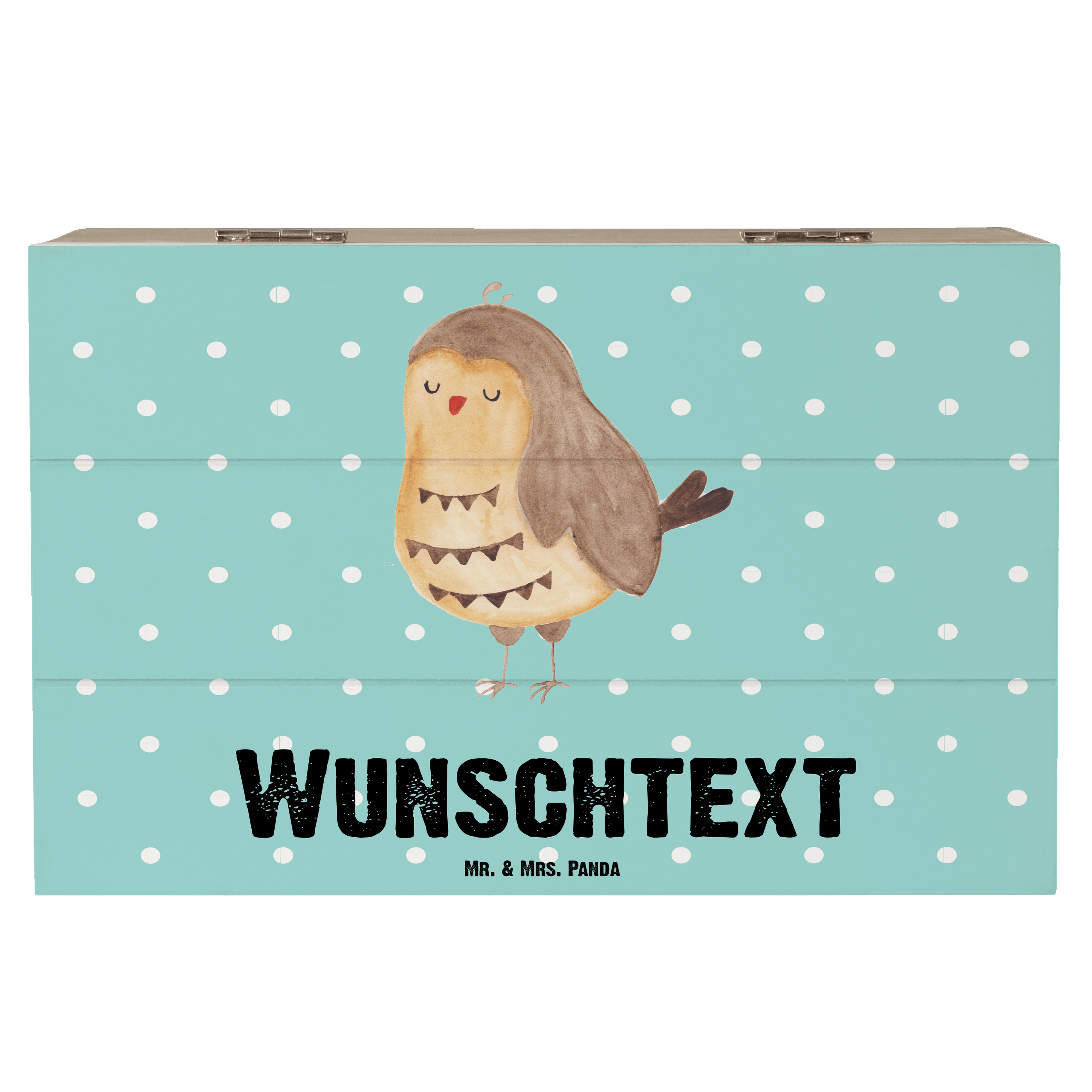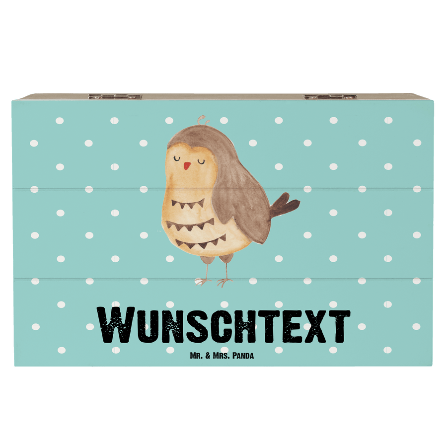 Personalisierte Holzkiste Eule Zufrieden - Türkis Pastell - 19 x 12 cm