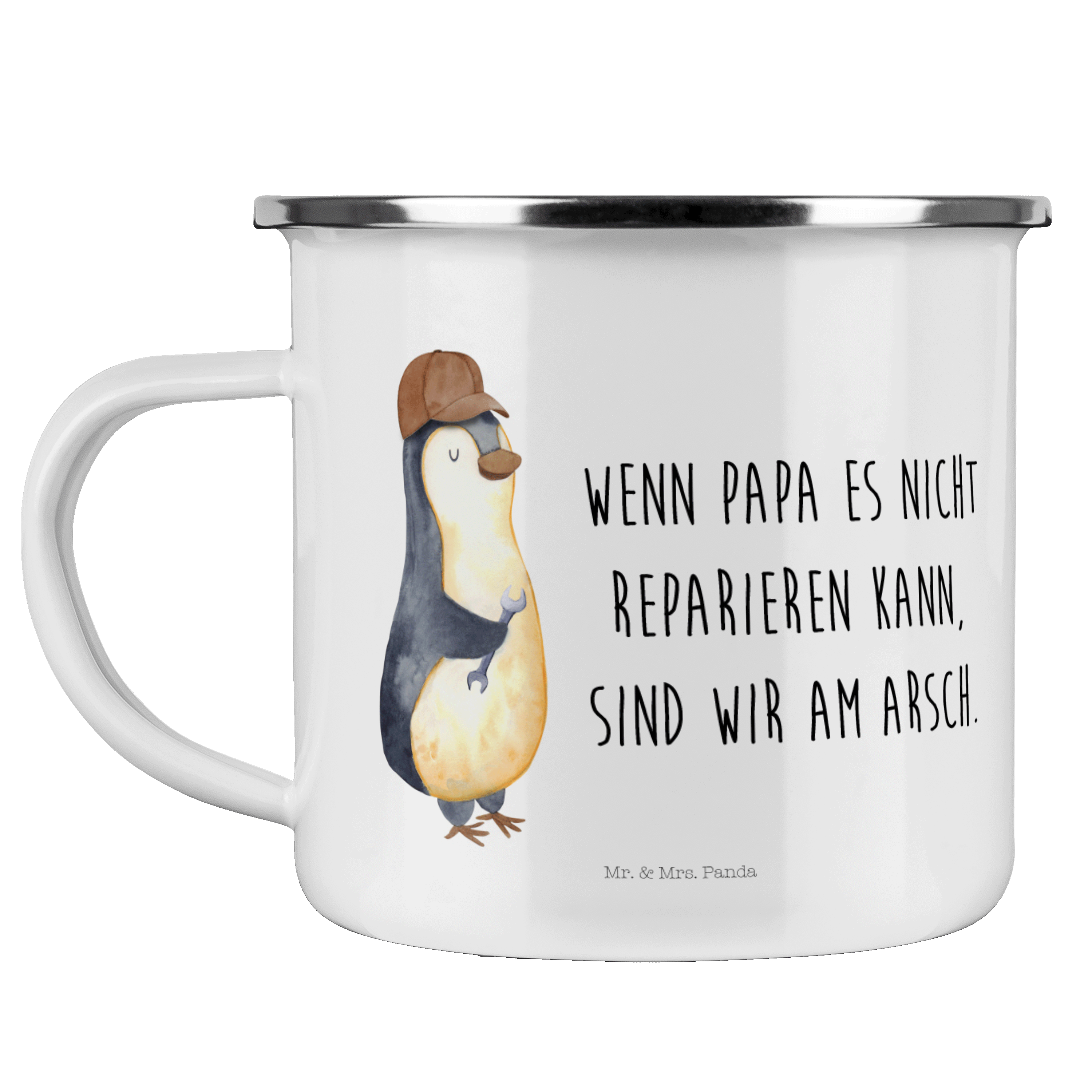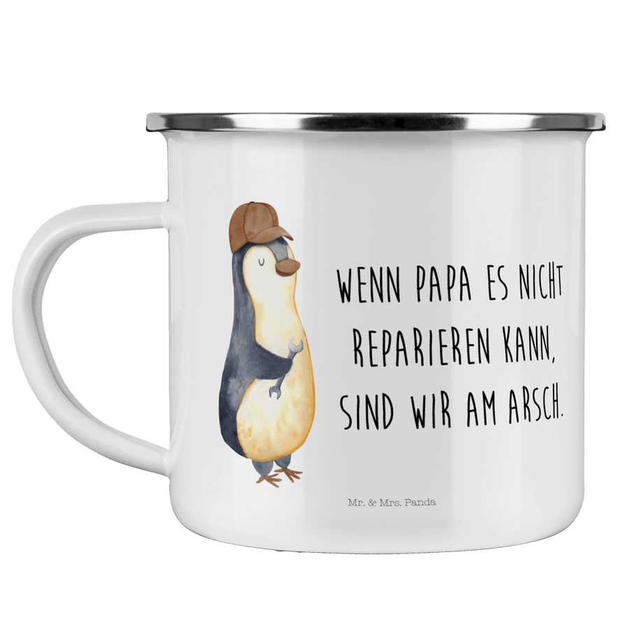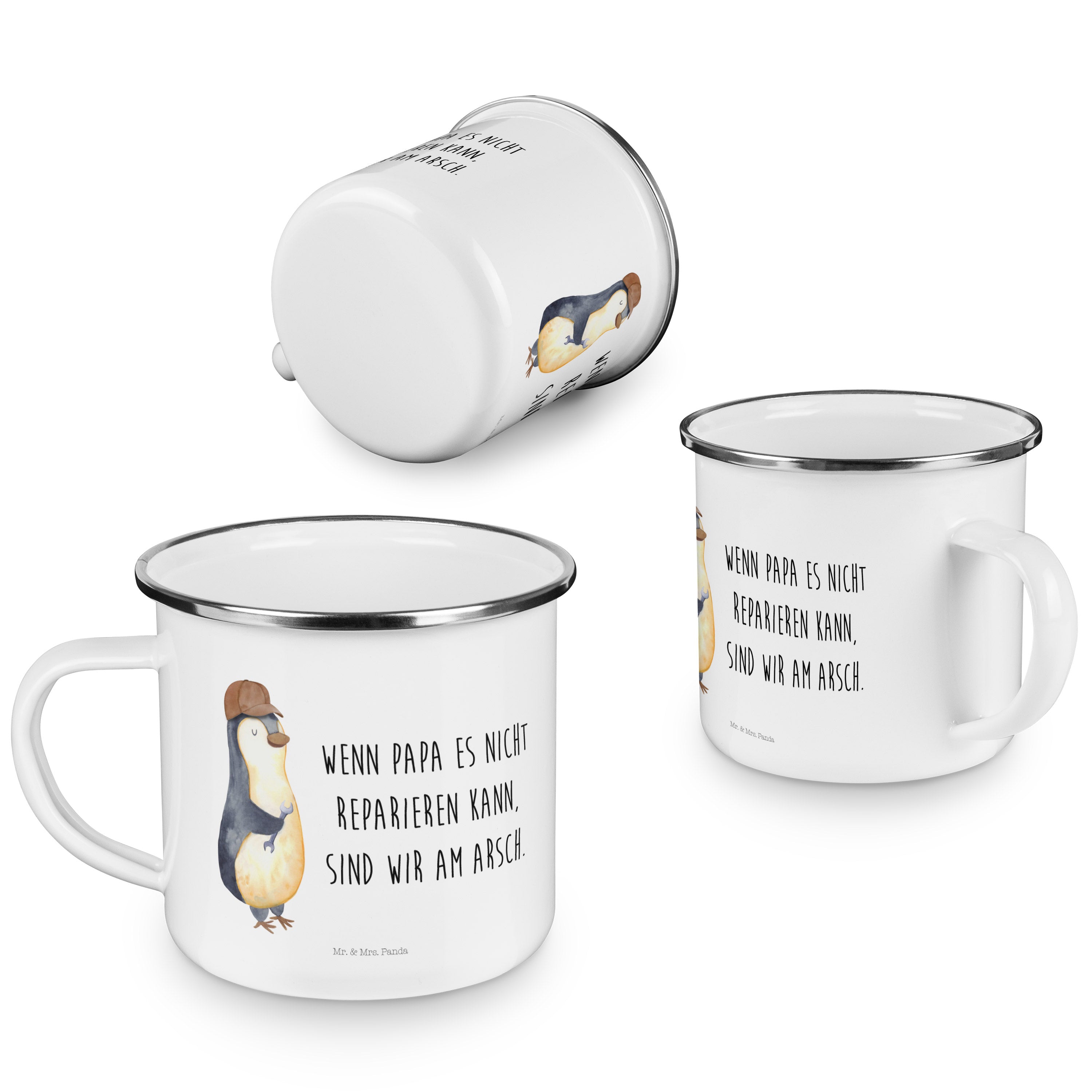 Camping Emaille Tasse Pinguin mit Schraubenschlüssel
