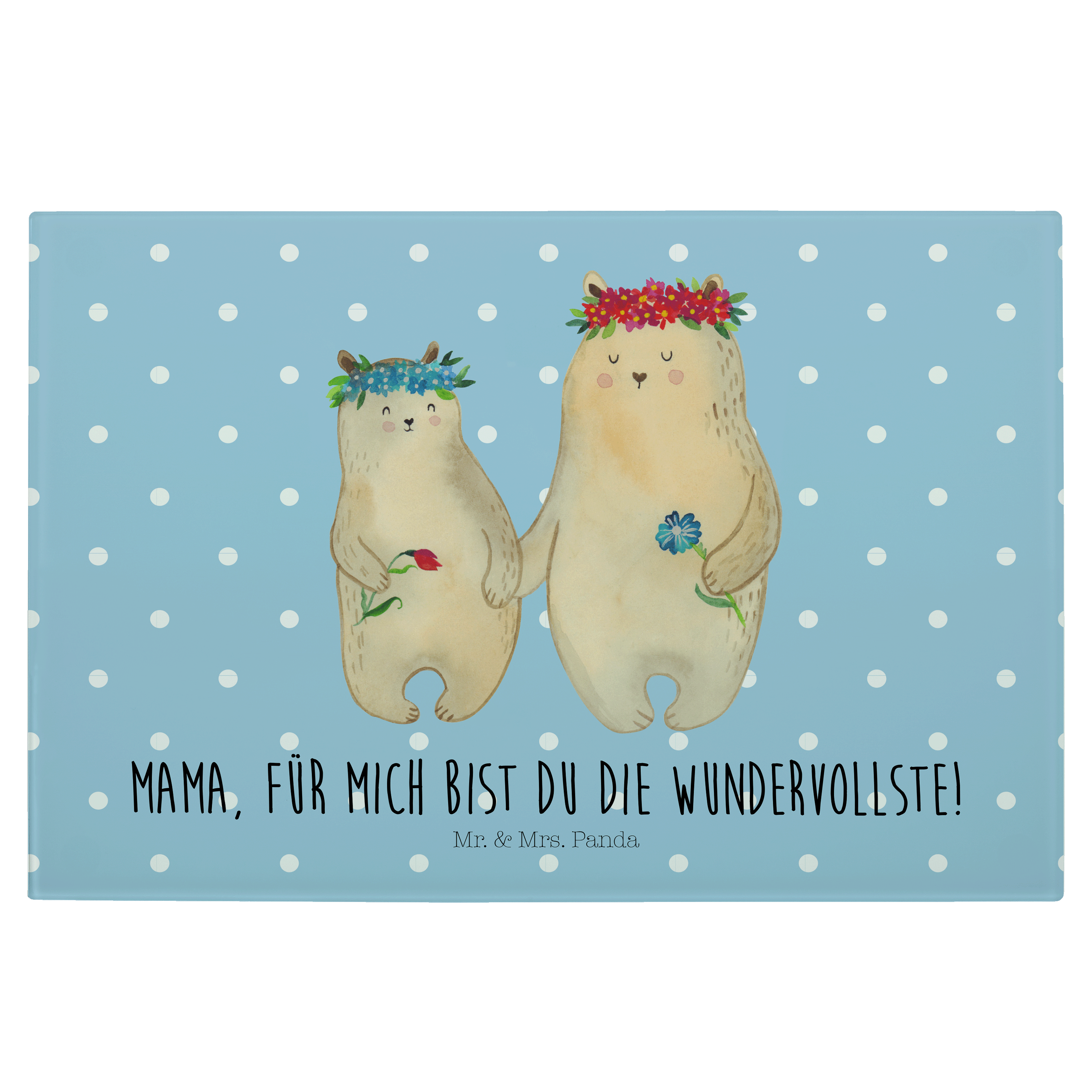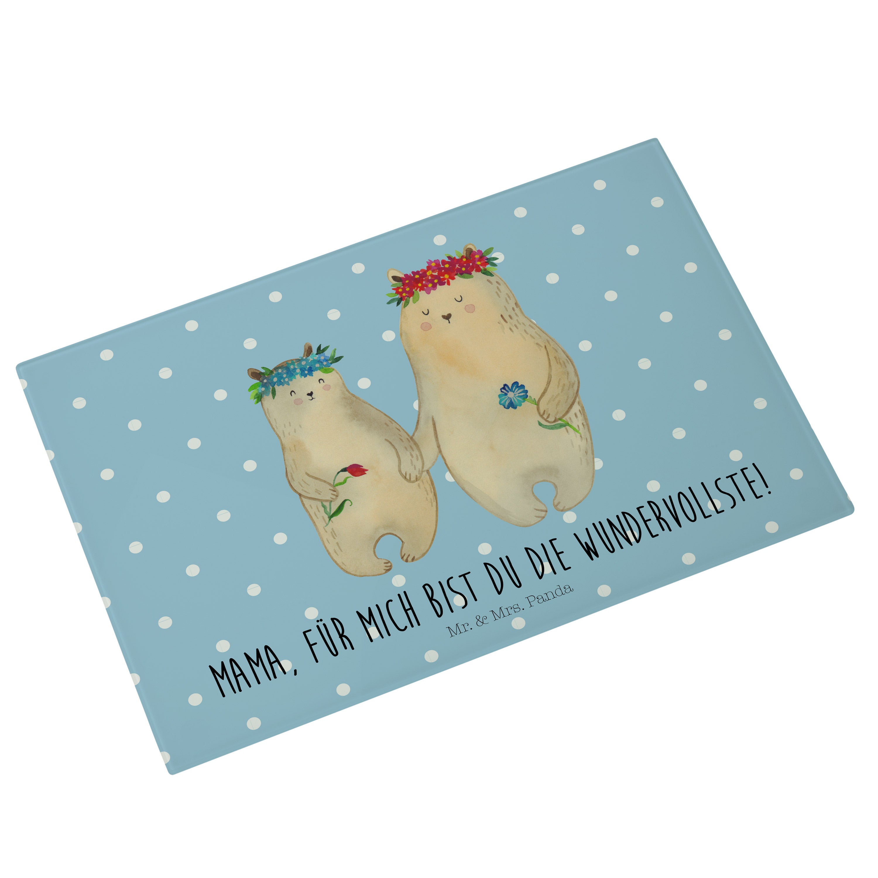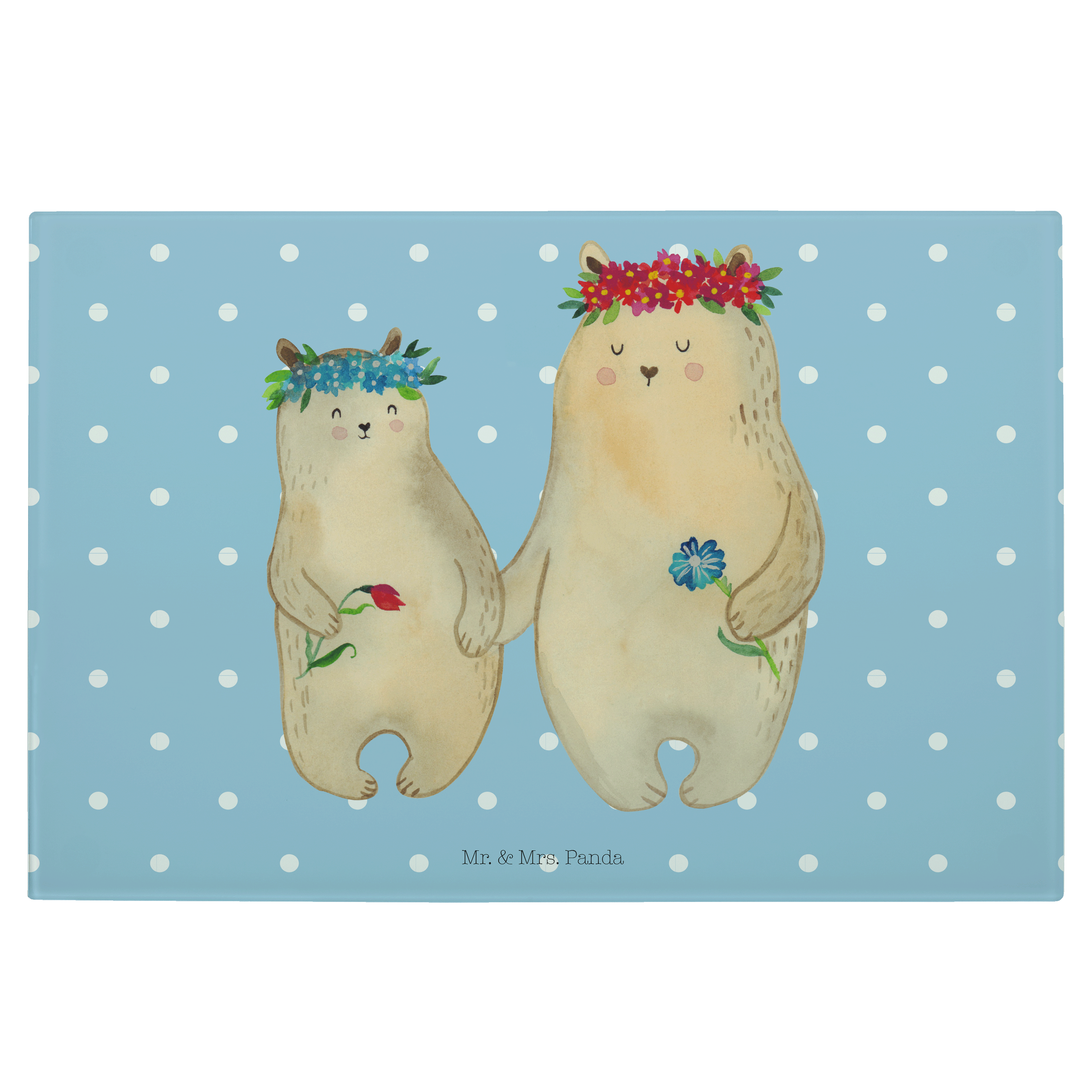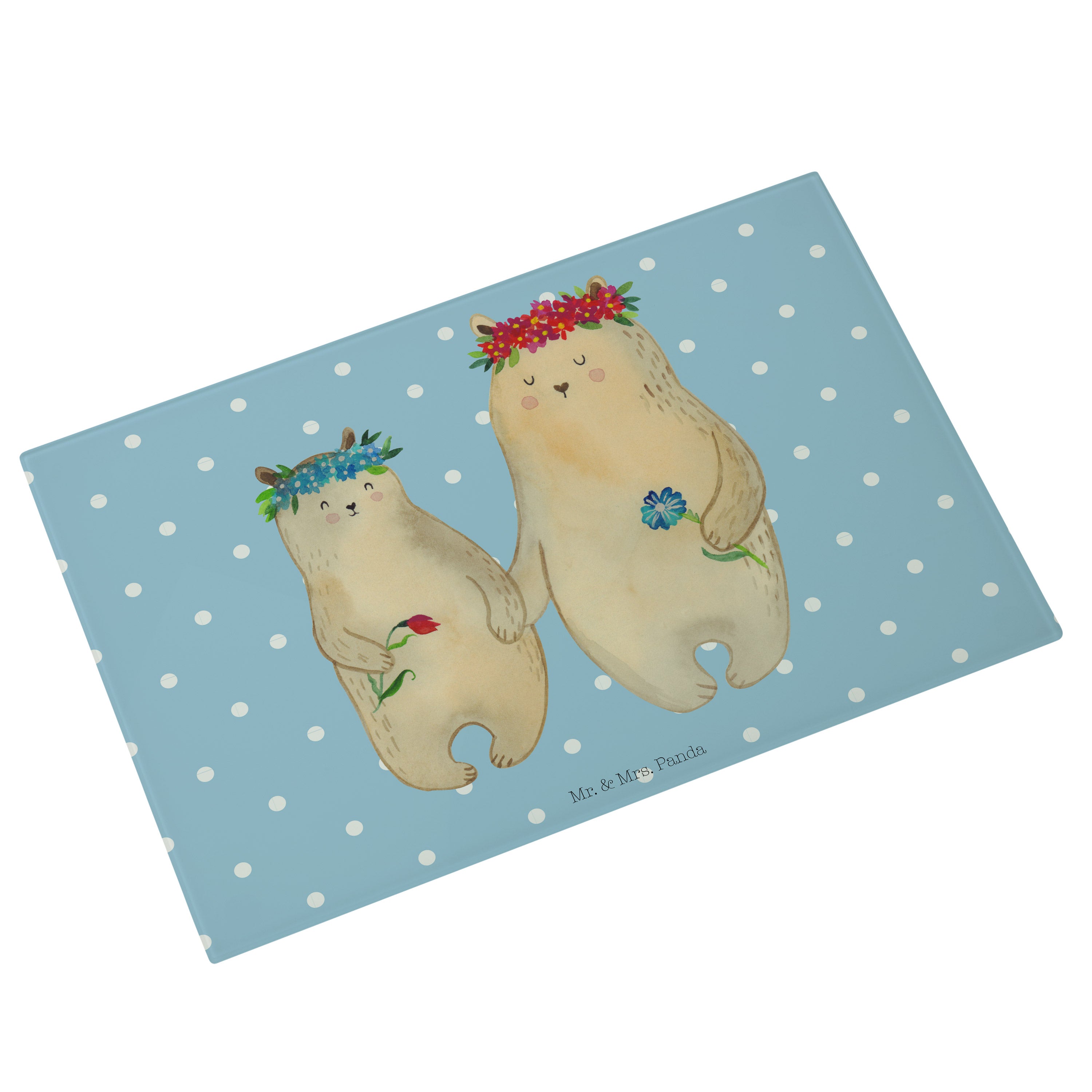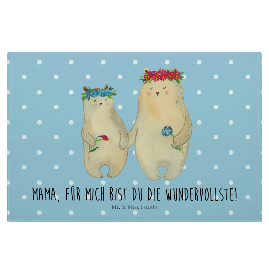 Medium Glas Schneidbrett Bären mit Blumenkranz - mit Spruch - Blau Pastell