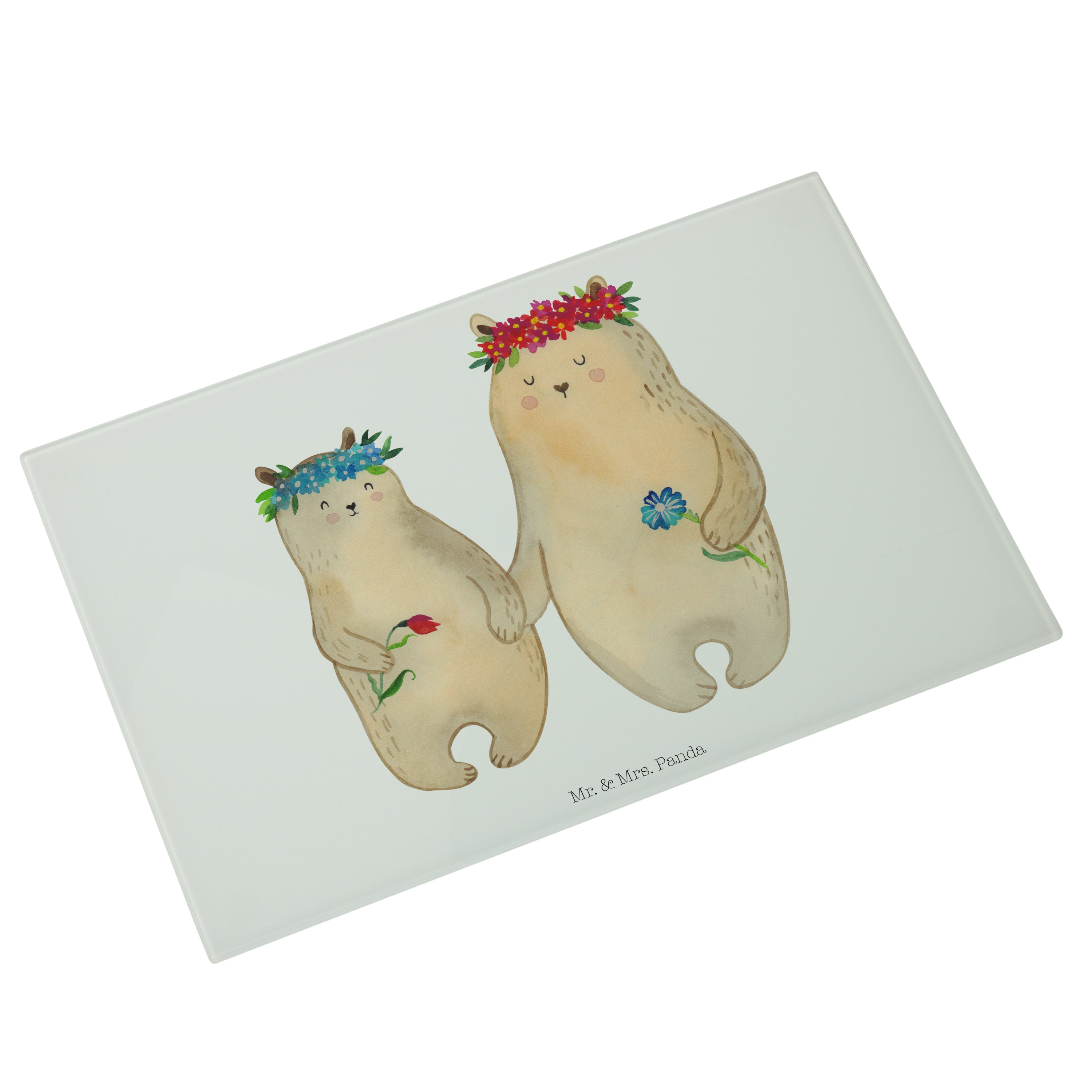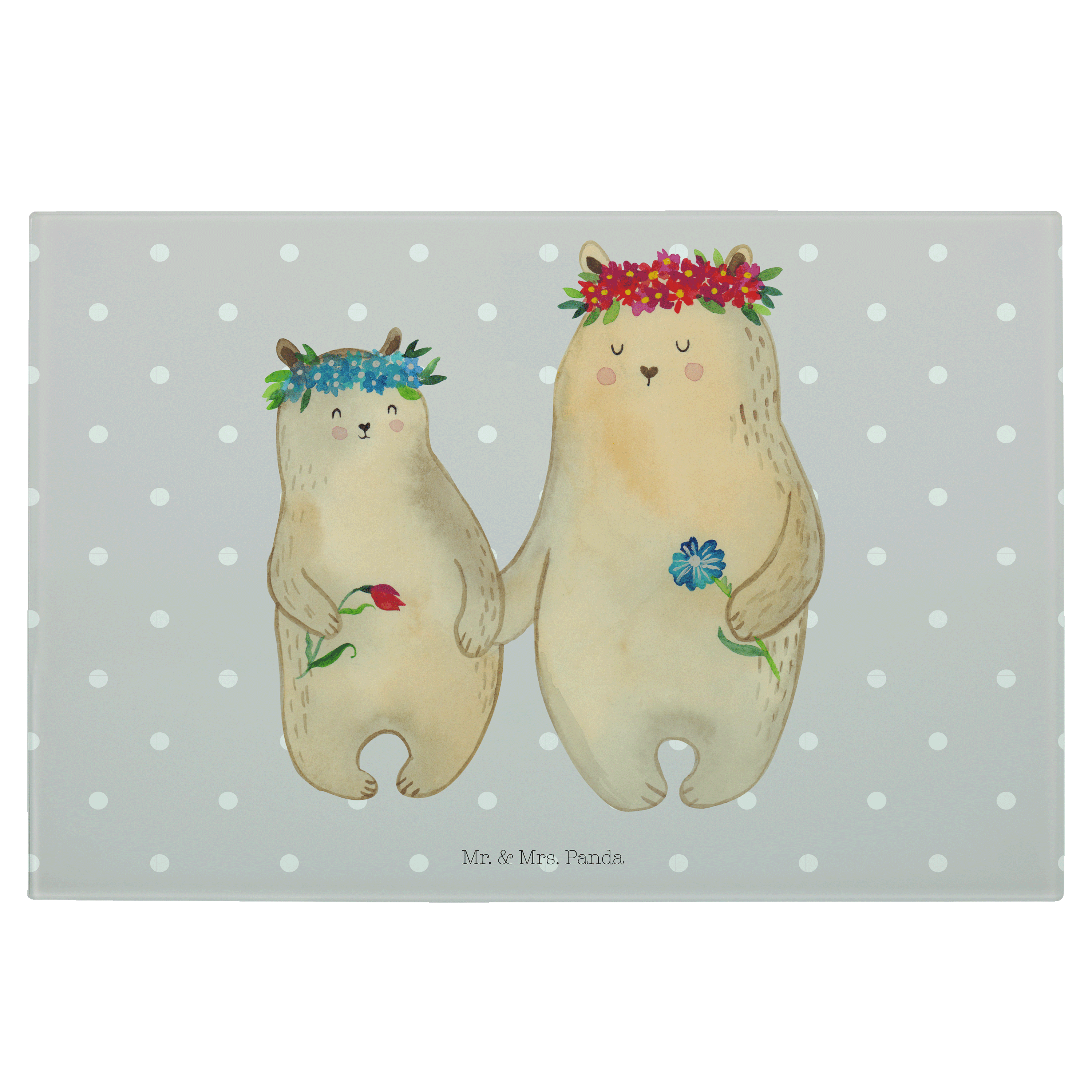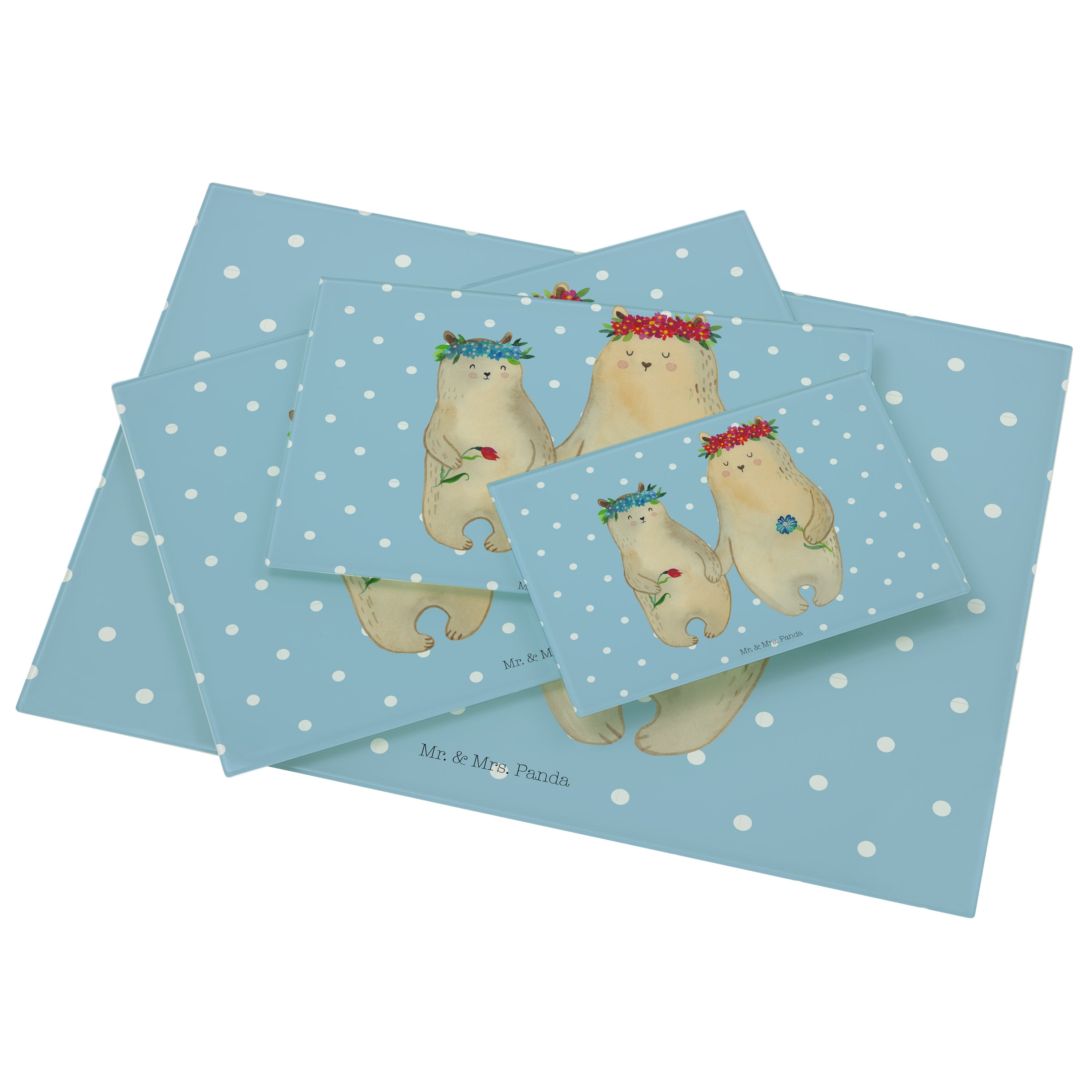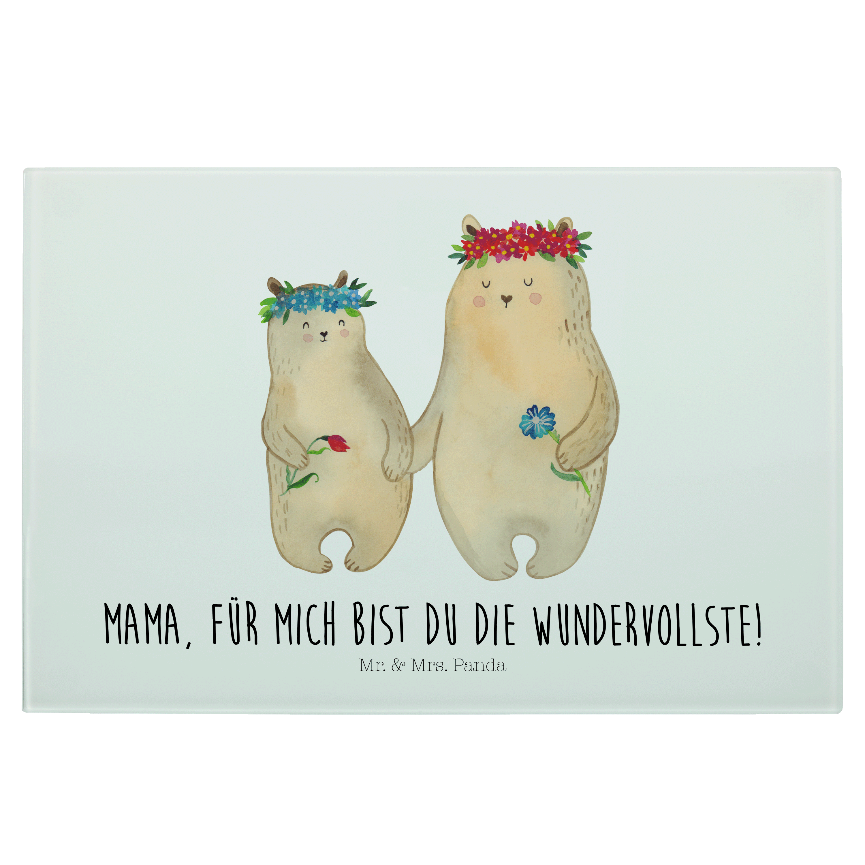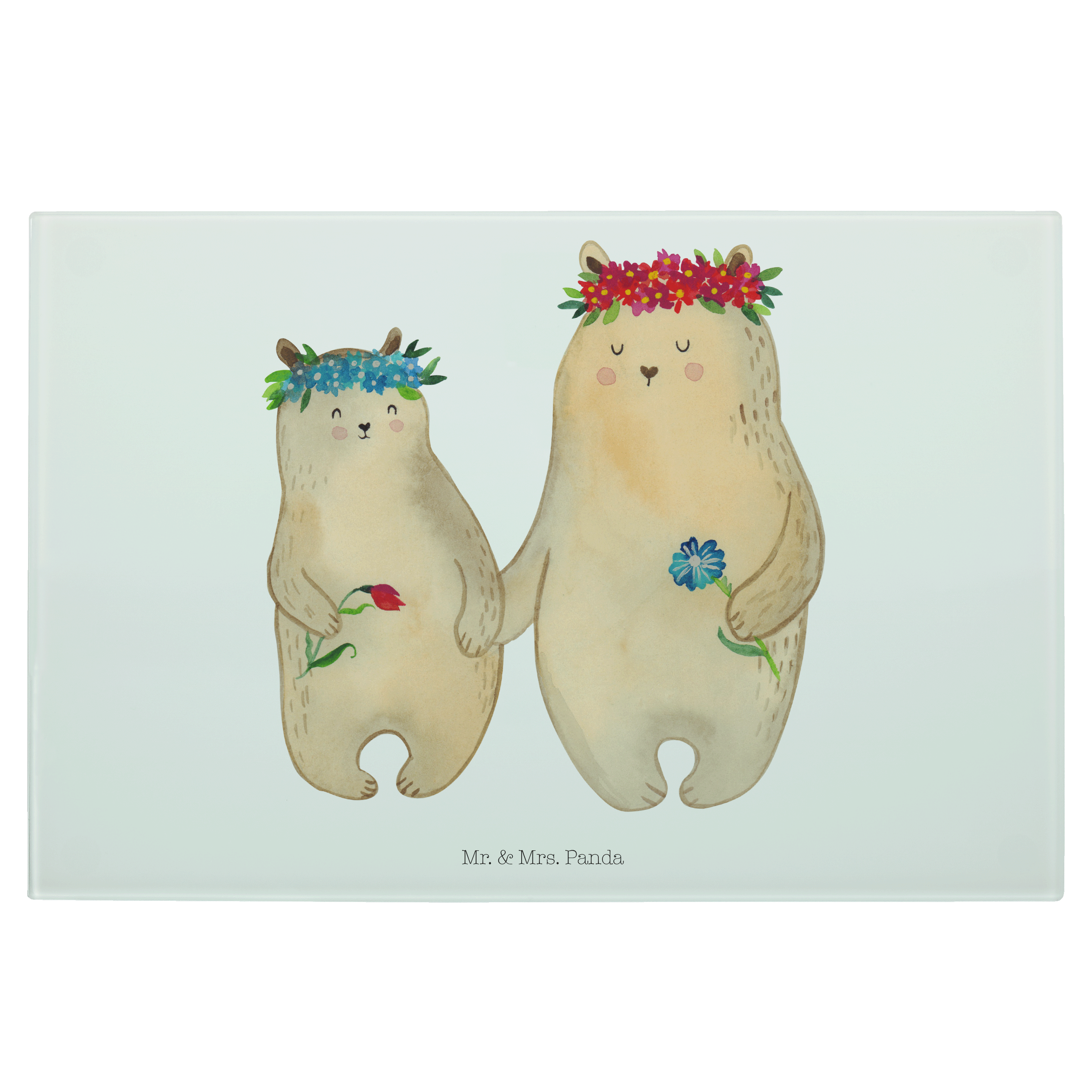 Medium Glas Schneidbrett Bären mit Blumenkranz - mit Spruch - Blau Pastell