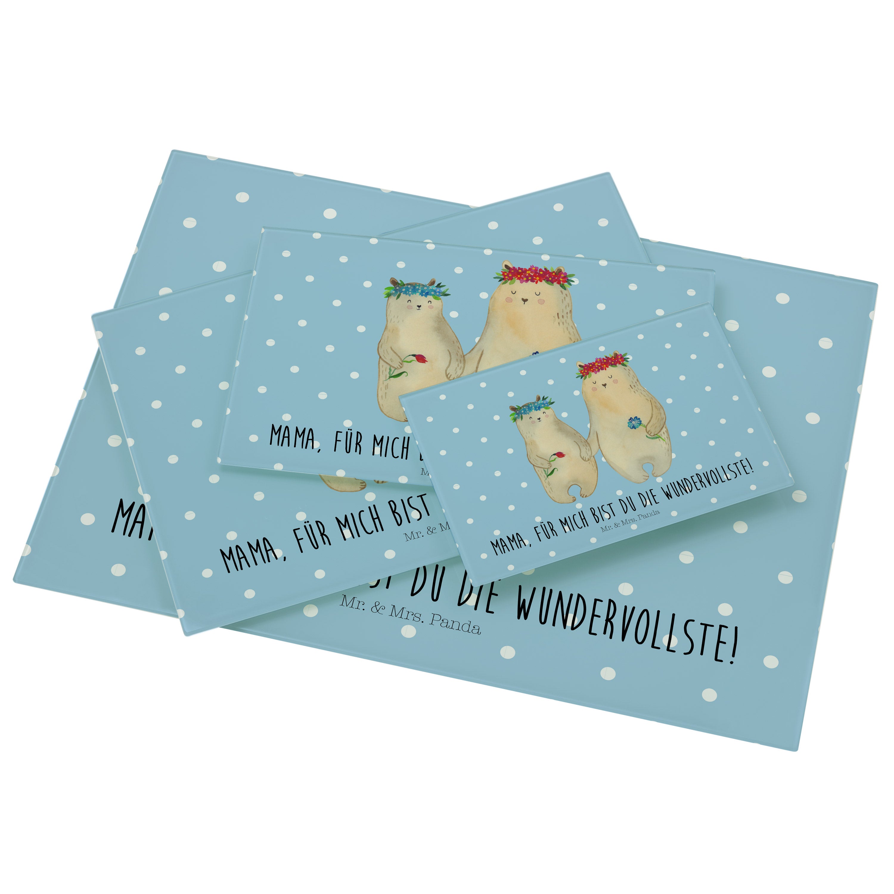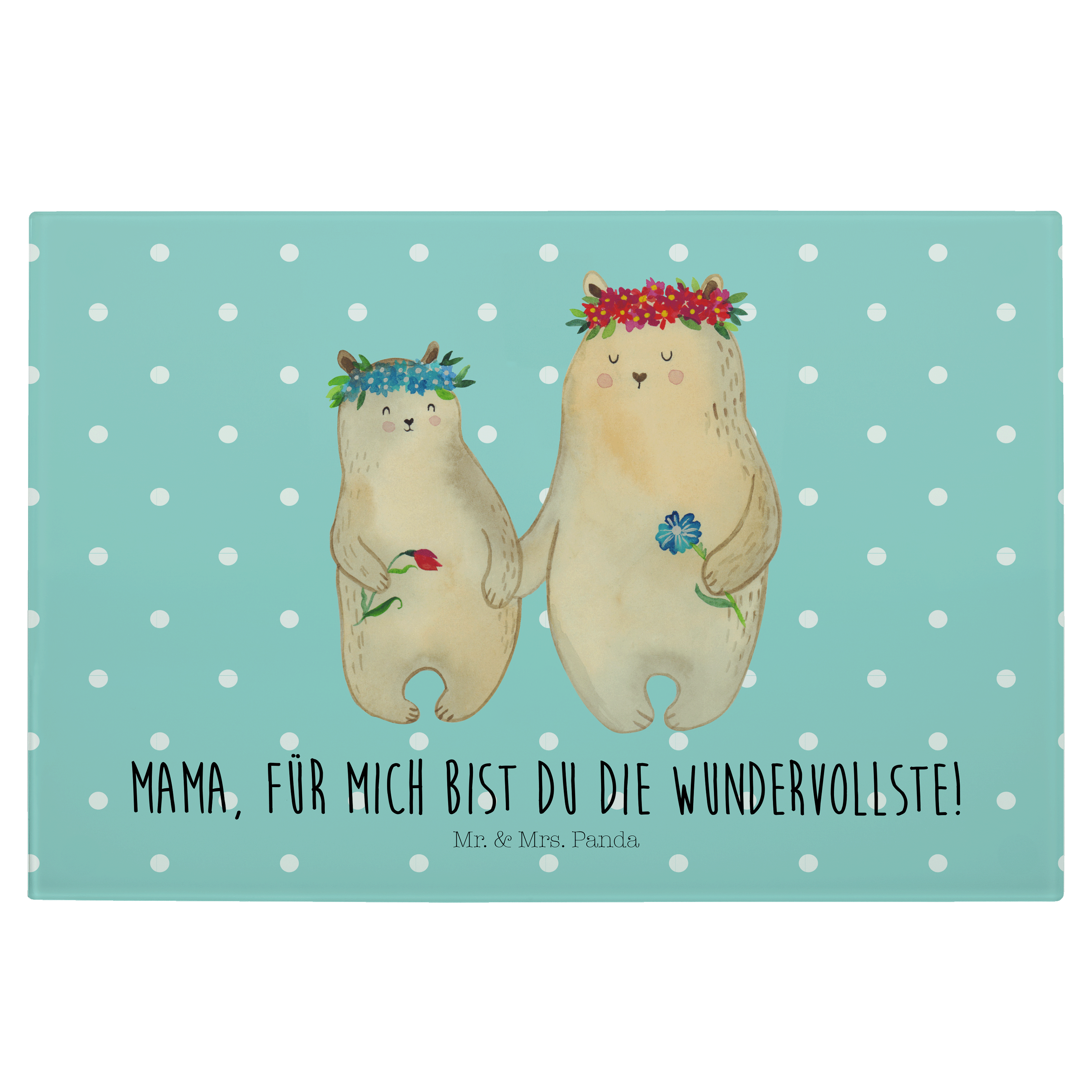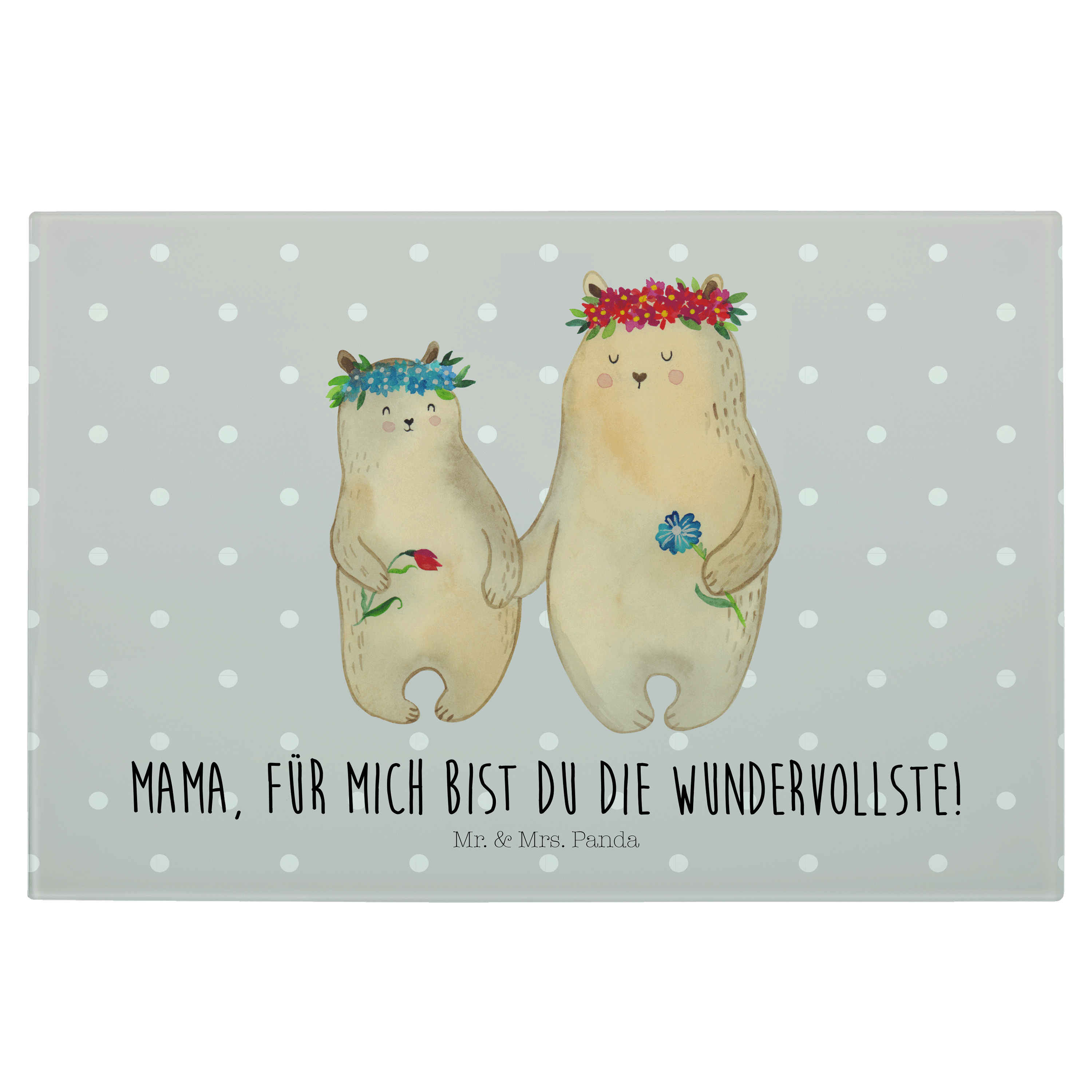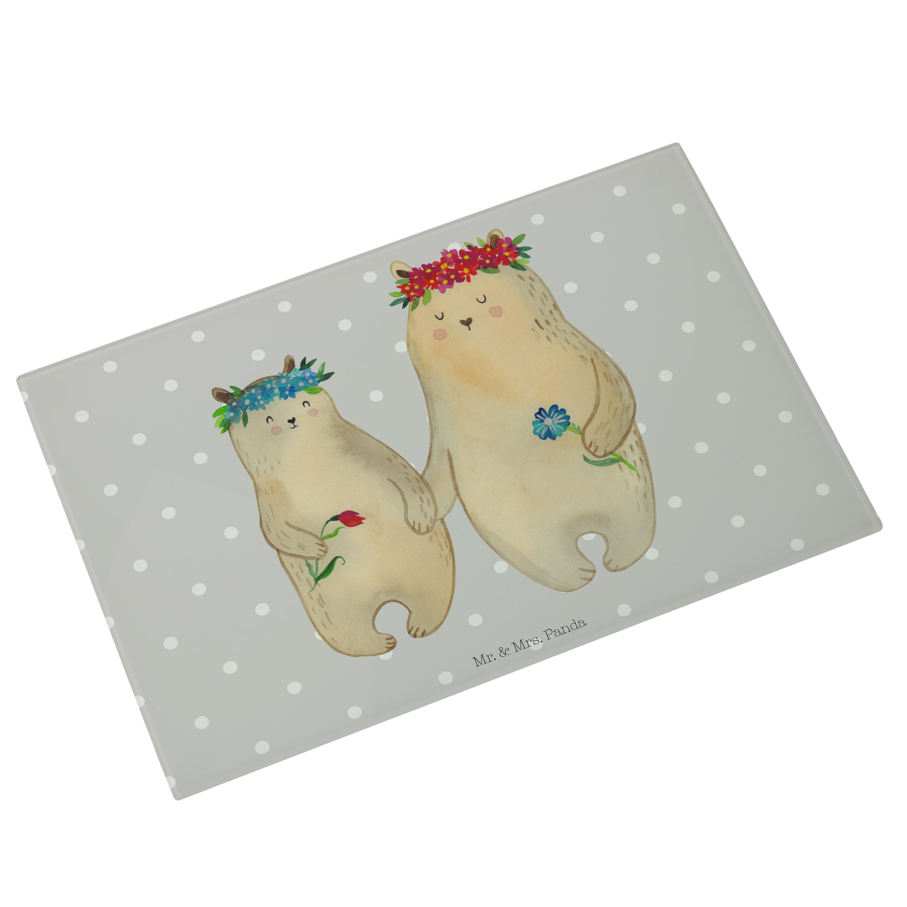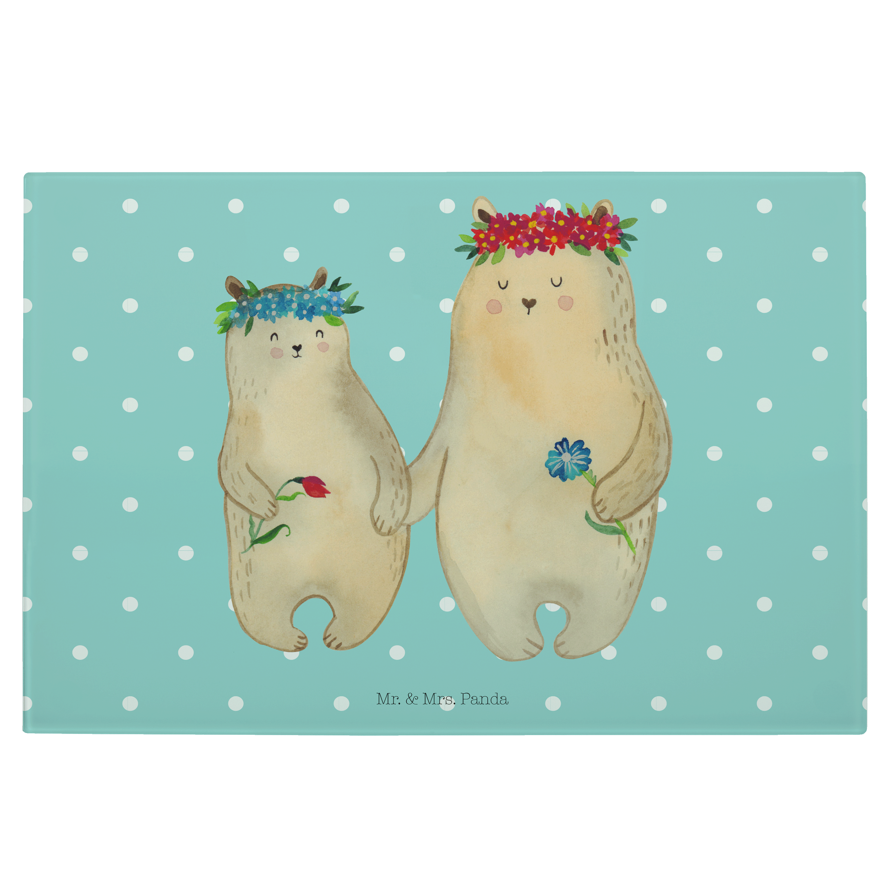 Medium Glas Schneidbrett Bären mit Blumenkranz - mit Spruch - Blau Pastell