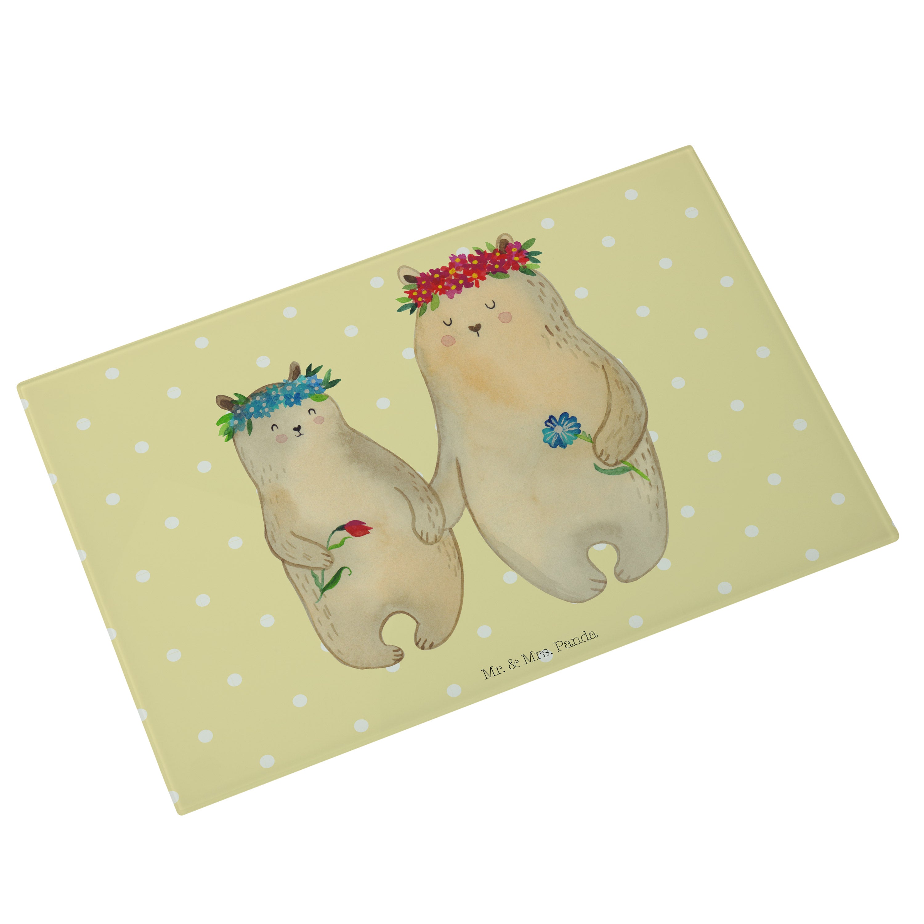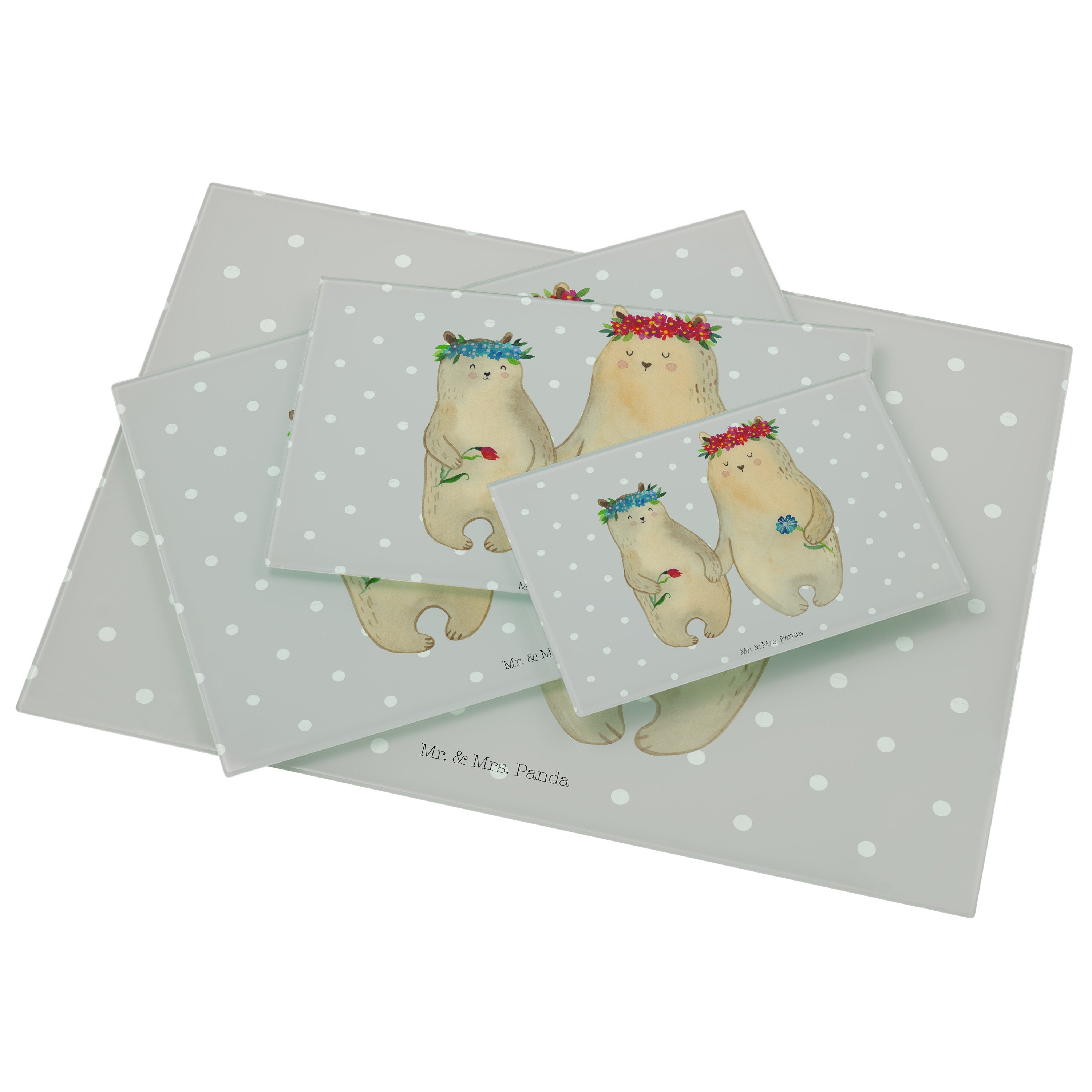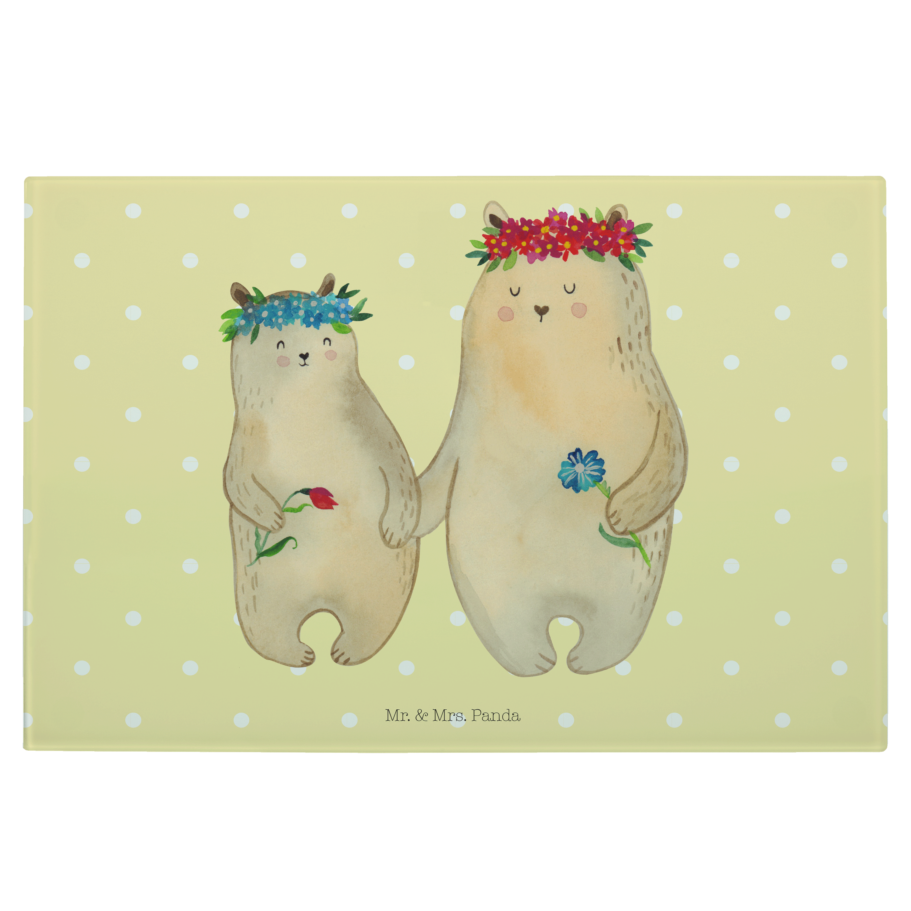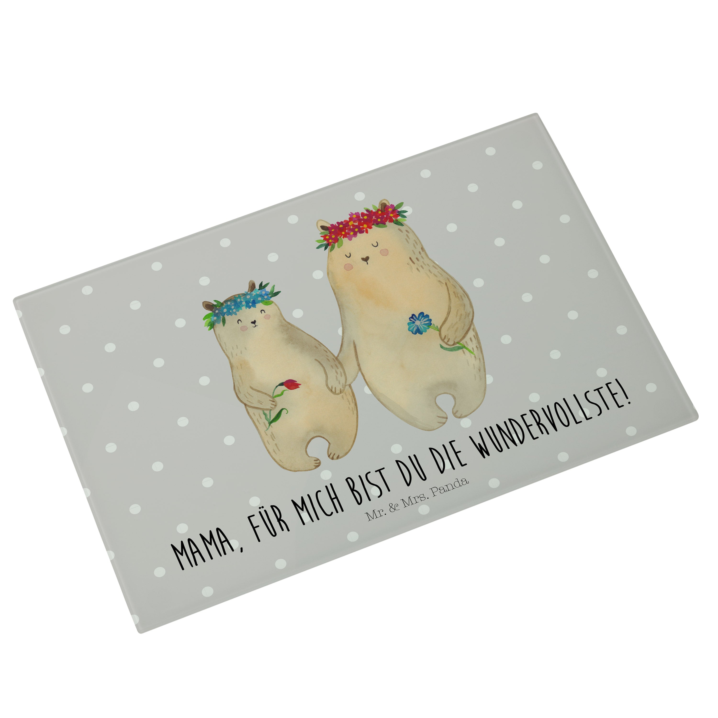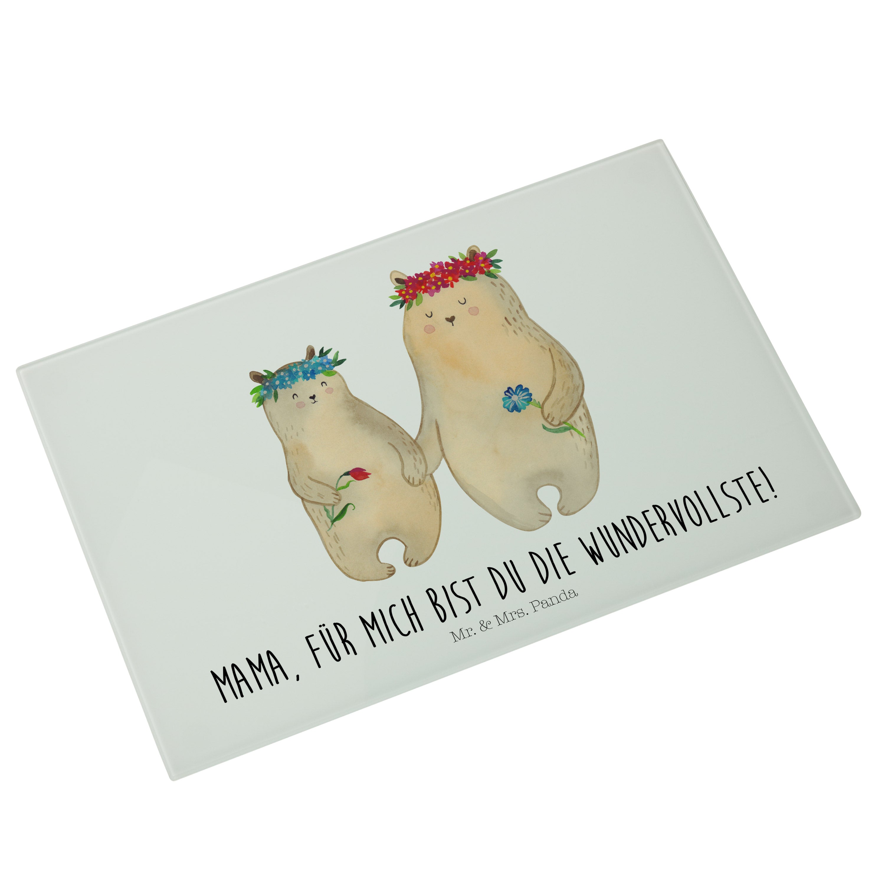 Medium Glas Schneidbrett Bären mit Blumenkranz - mit Spruch - Blau Pastell