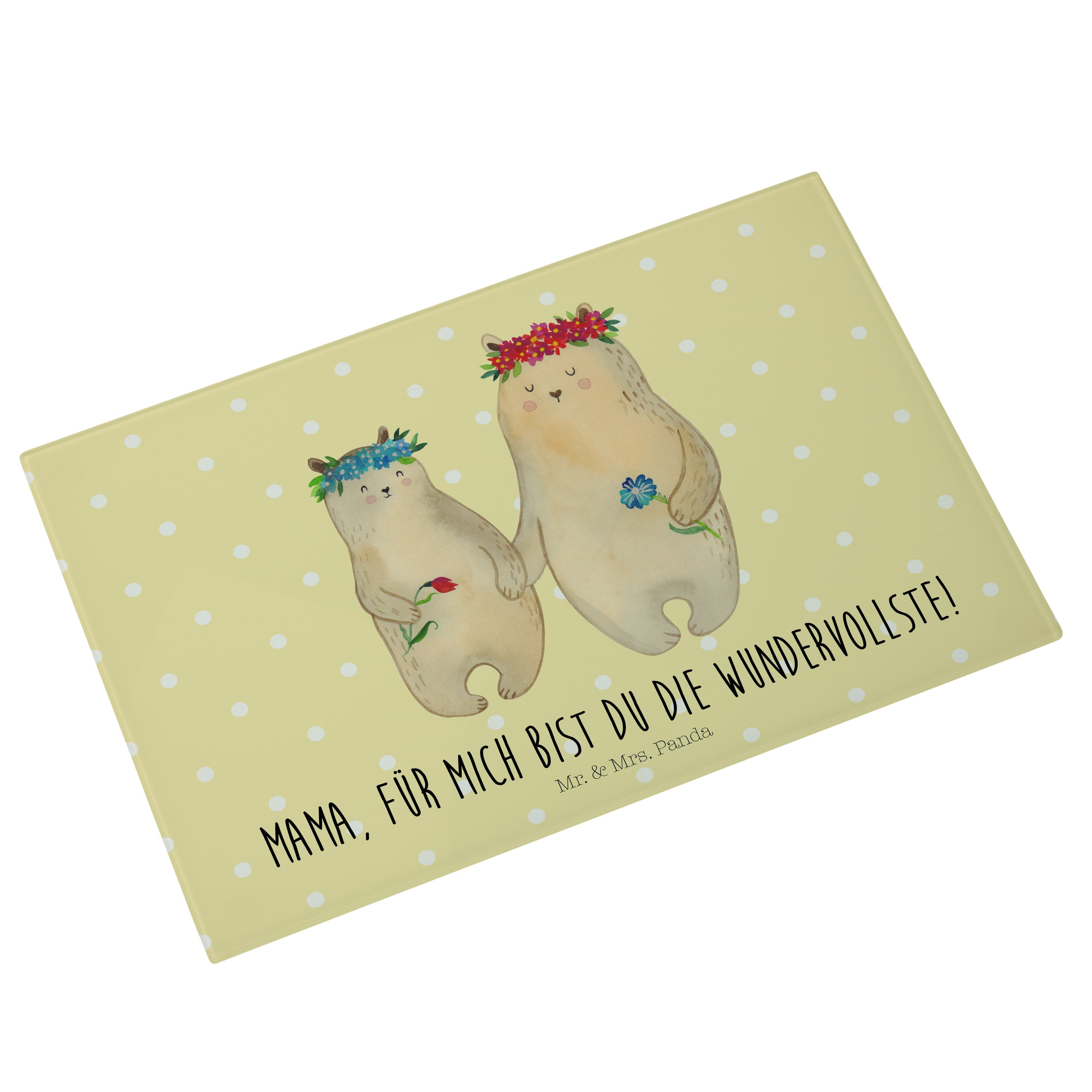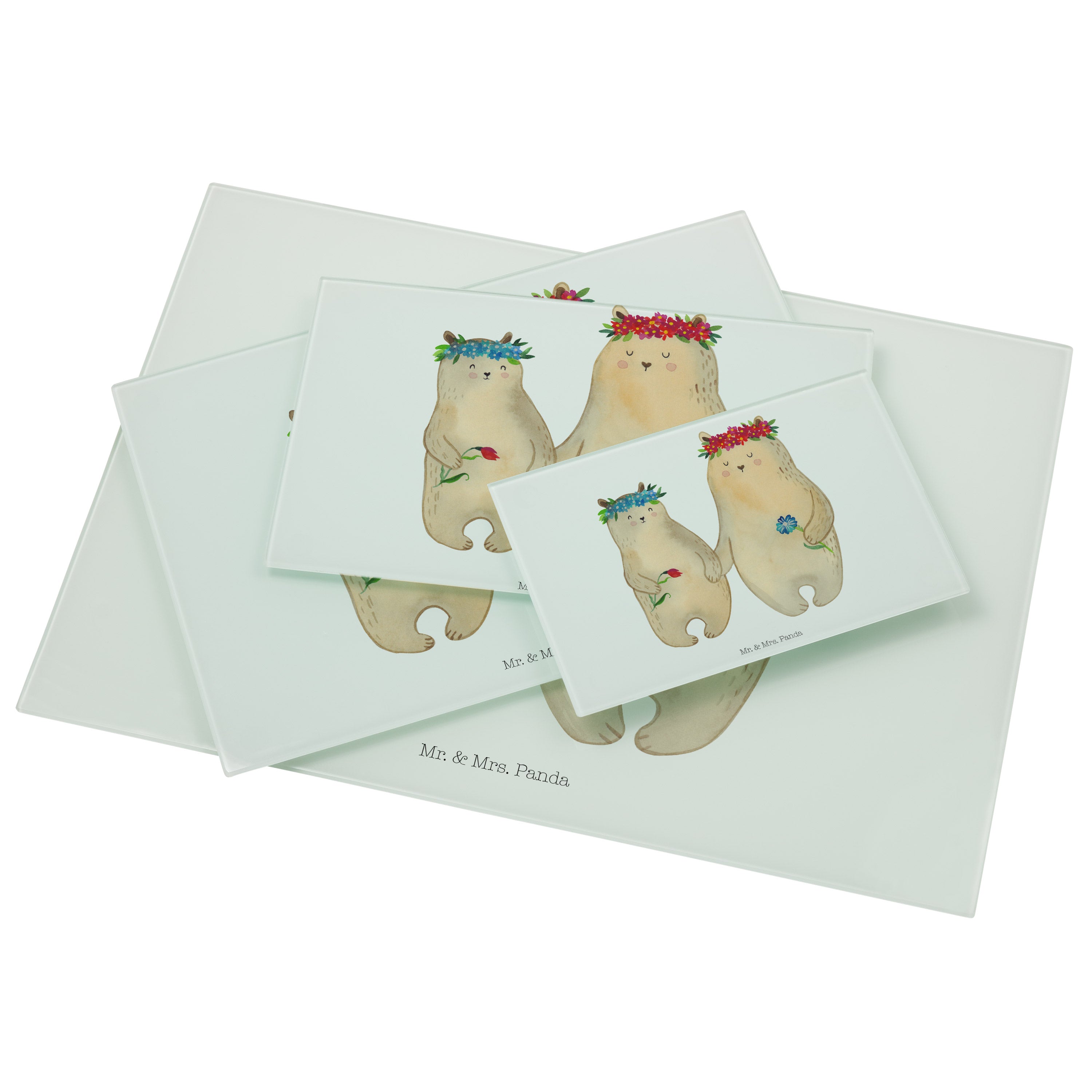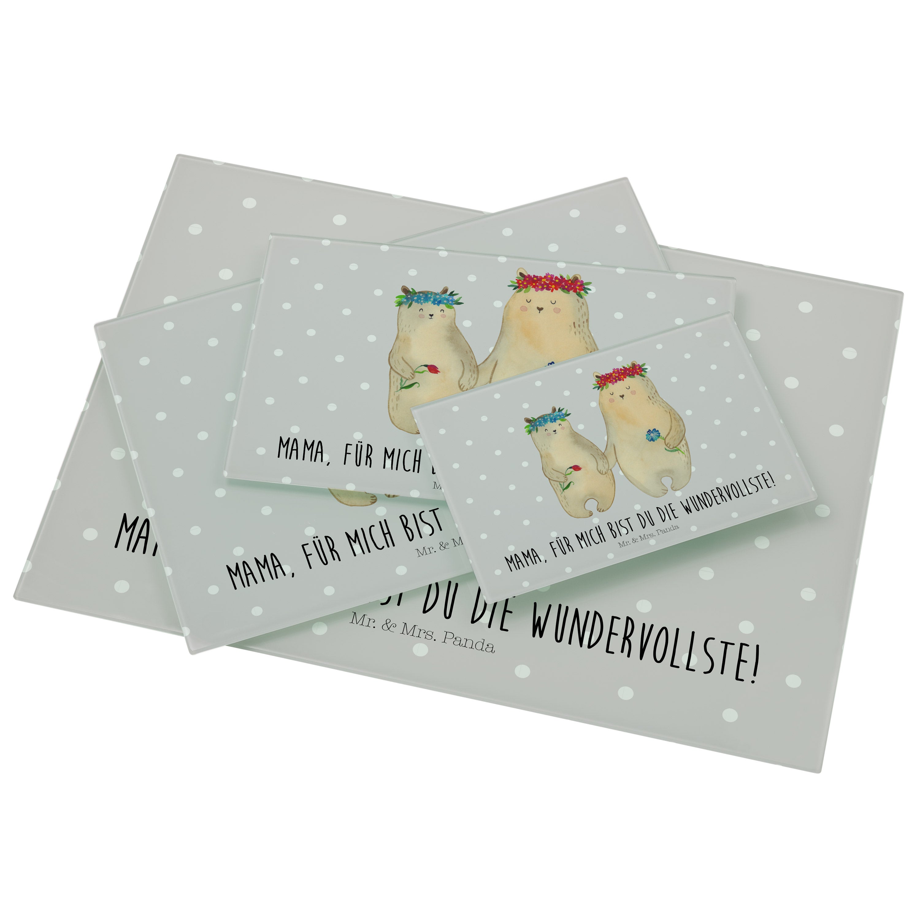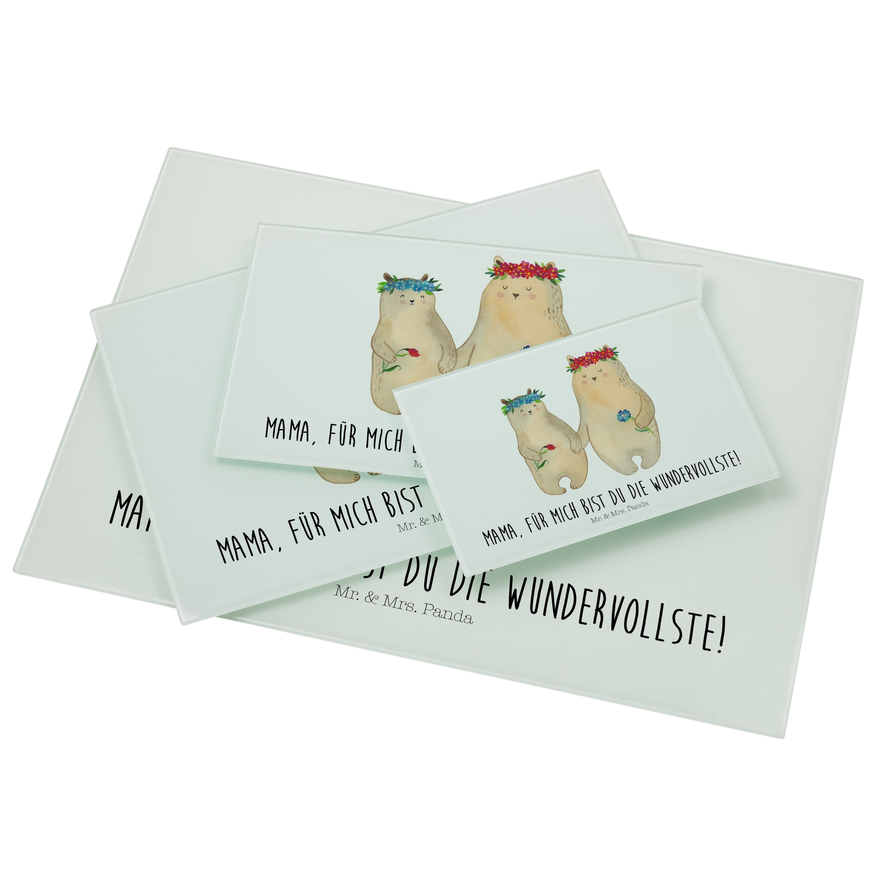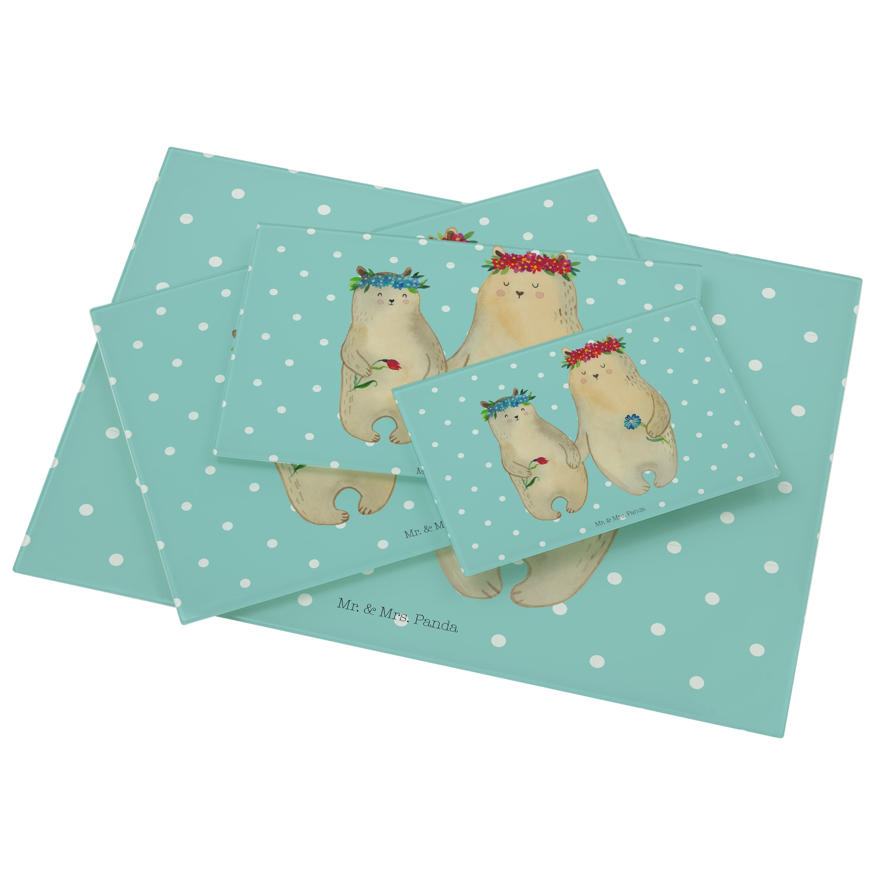 Medium Glas Schneidbrett Bären mit Blumenkranz - mit Spruch - Blau Pastell